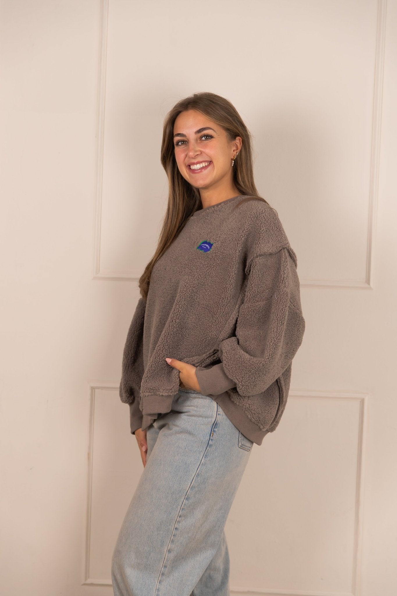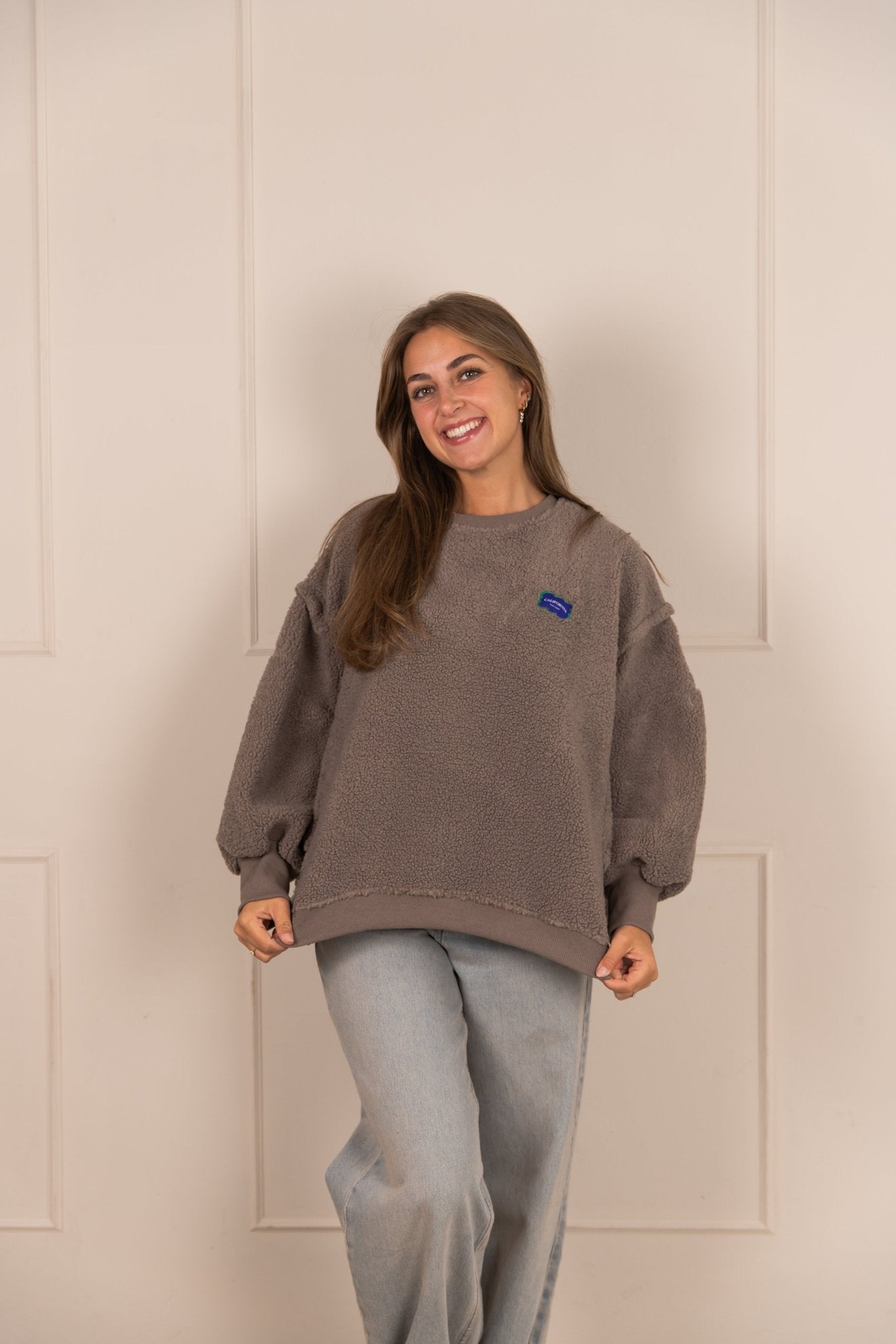 De Channah Teddy Sweater in taupe is gemaakt van een zacht teddy stofje, waardoor hij heerlijk warm is. De trui heeft lange mouwen, een ronde halslijn en is voorzien van een patch op de borst. Combineer deze trui met een jeans voor een casual outfit.