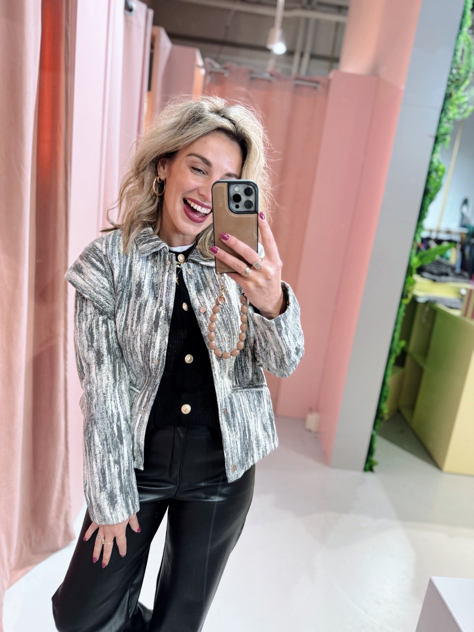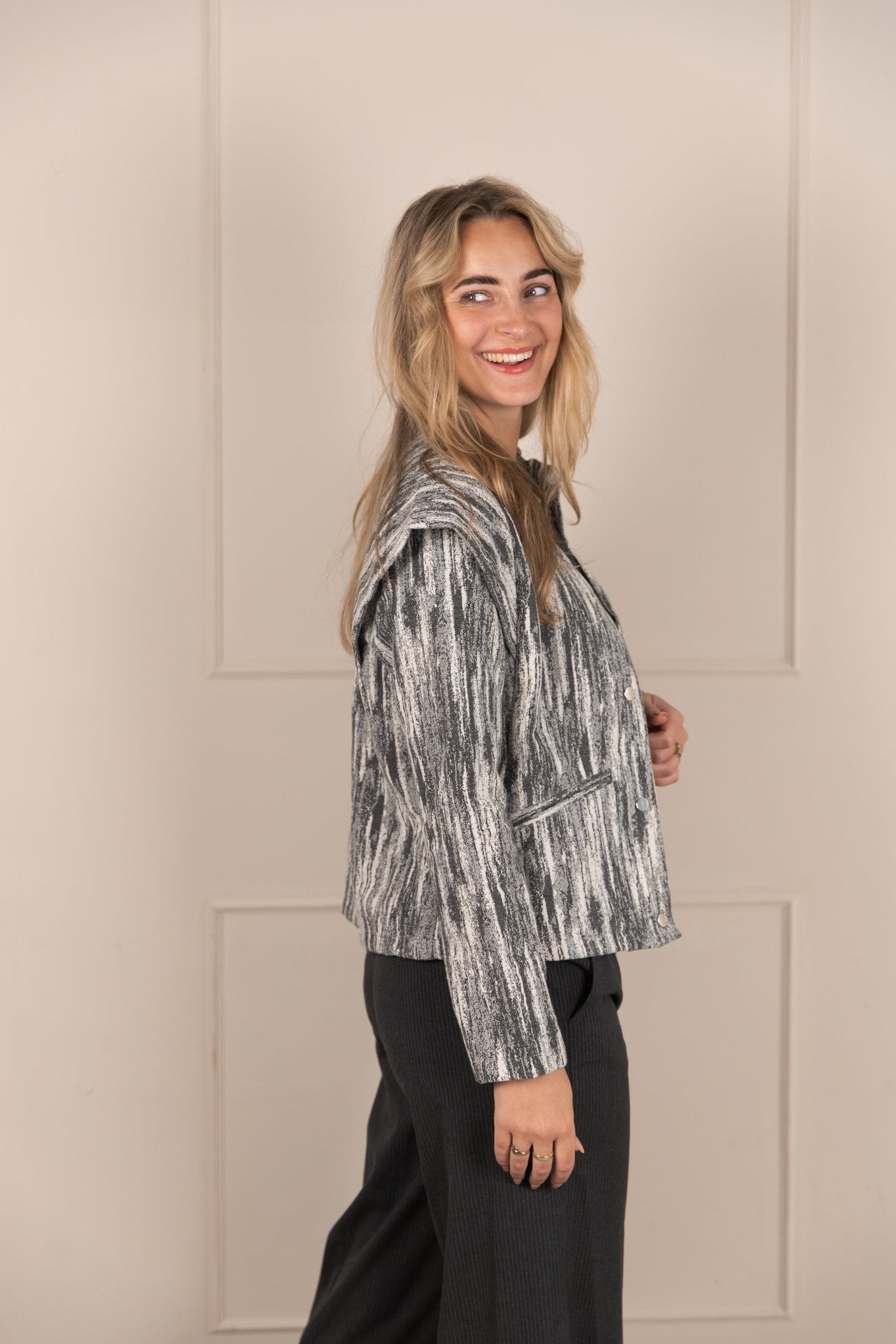 De Charlene Jacket in grijs is een jacquard jasje met print. Het jasje heeft een boxy model en heeft een kraagje en schouder details. Daarnaast is het jasje voorzien van twee nepzakken en is hij gemakkelijk te sluiten door middel van drukknoopjes aan de voorkant.