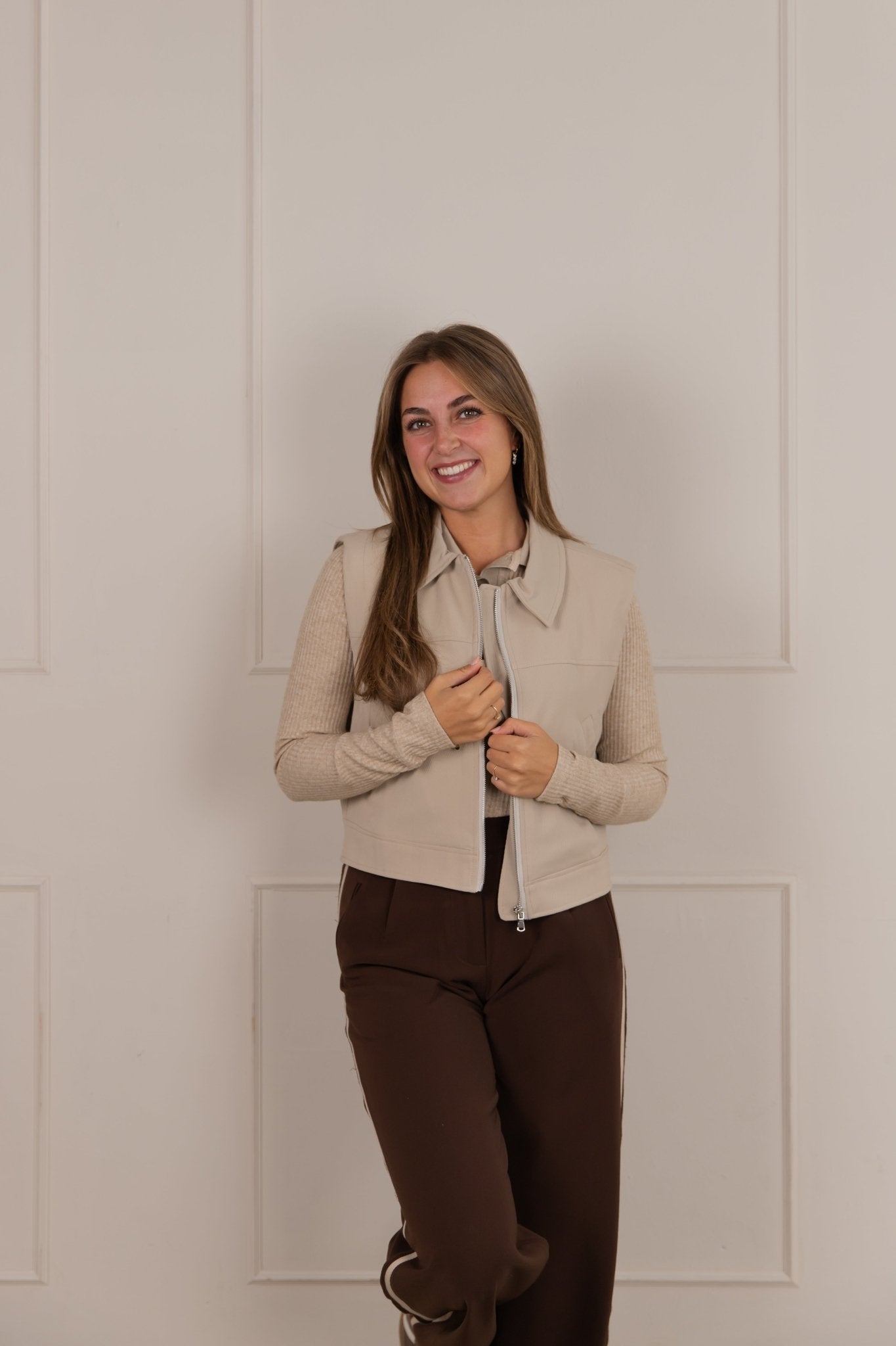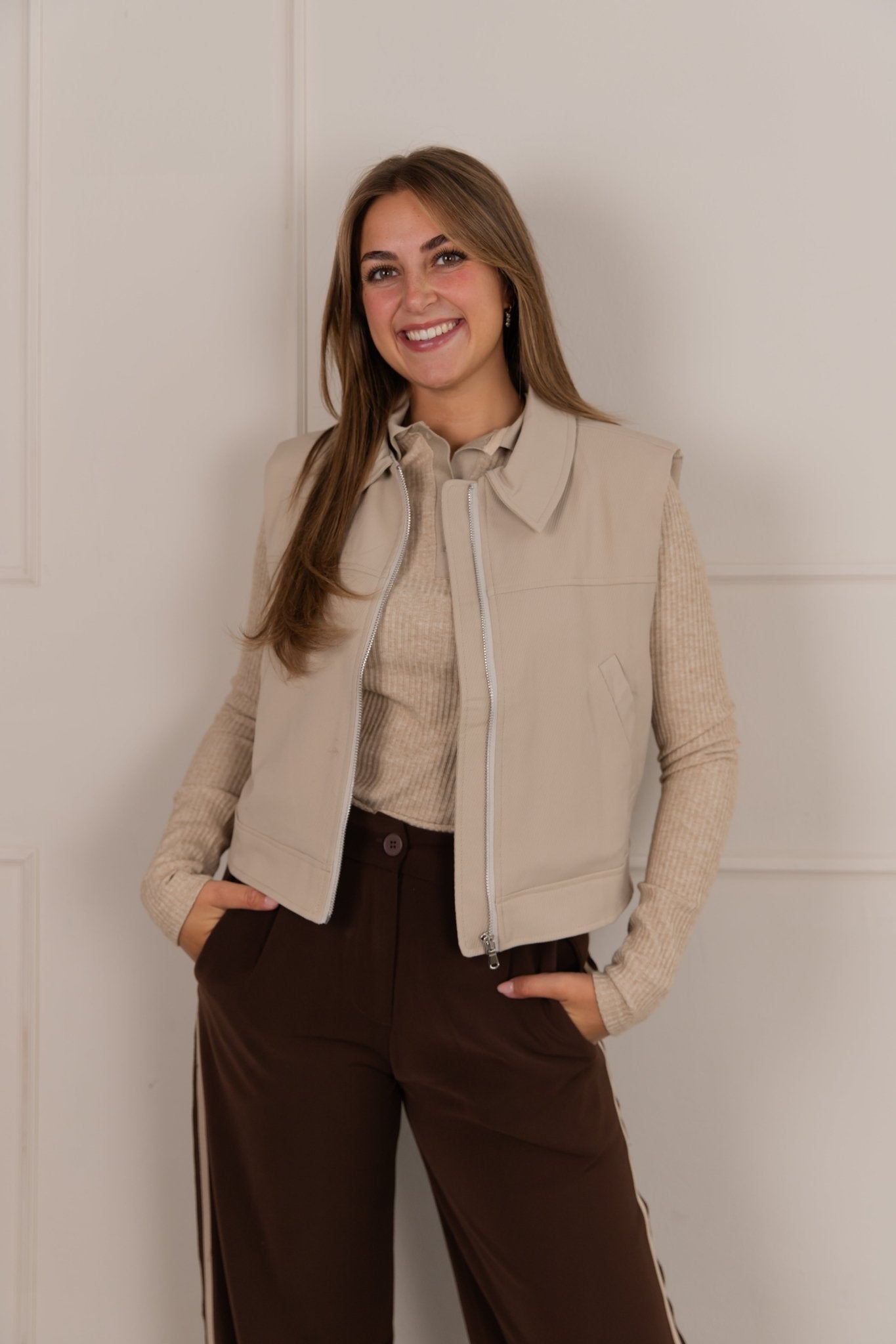 Het Chloe Gilet in beige is een mouwloos gilet en is gemakkelijk aan te trekken door middel van een ritssluiting. Het gilet heeft een kraagje, twee steekzakken en schoudervulling. Combineer dit gilet met één van onze T-shirts of longsleeves voor een leuke layered outfit!