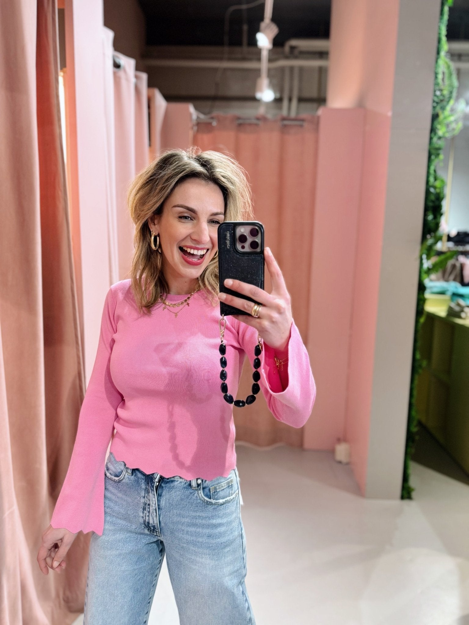De Chloe Longsleeve in roze is een top met een aansluitend model. De top is gemaakt van een stretchy ribstof en heeft lange wijduitlopende mouwen met een hoge, ronde halslijn.