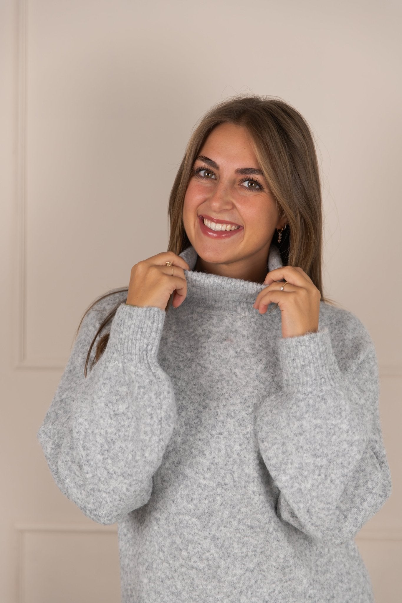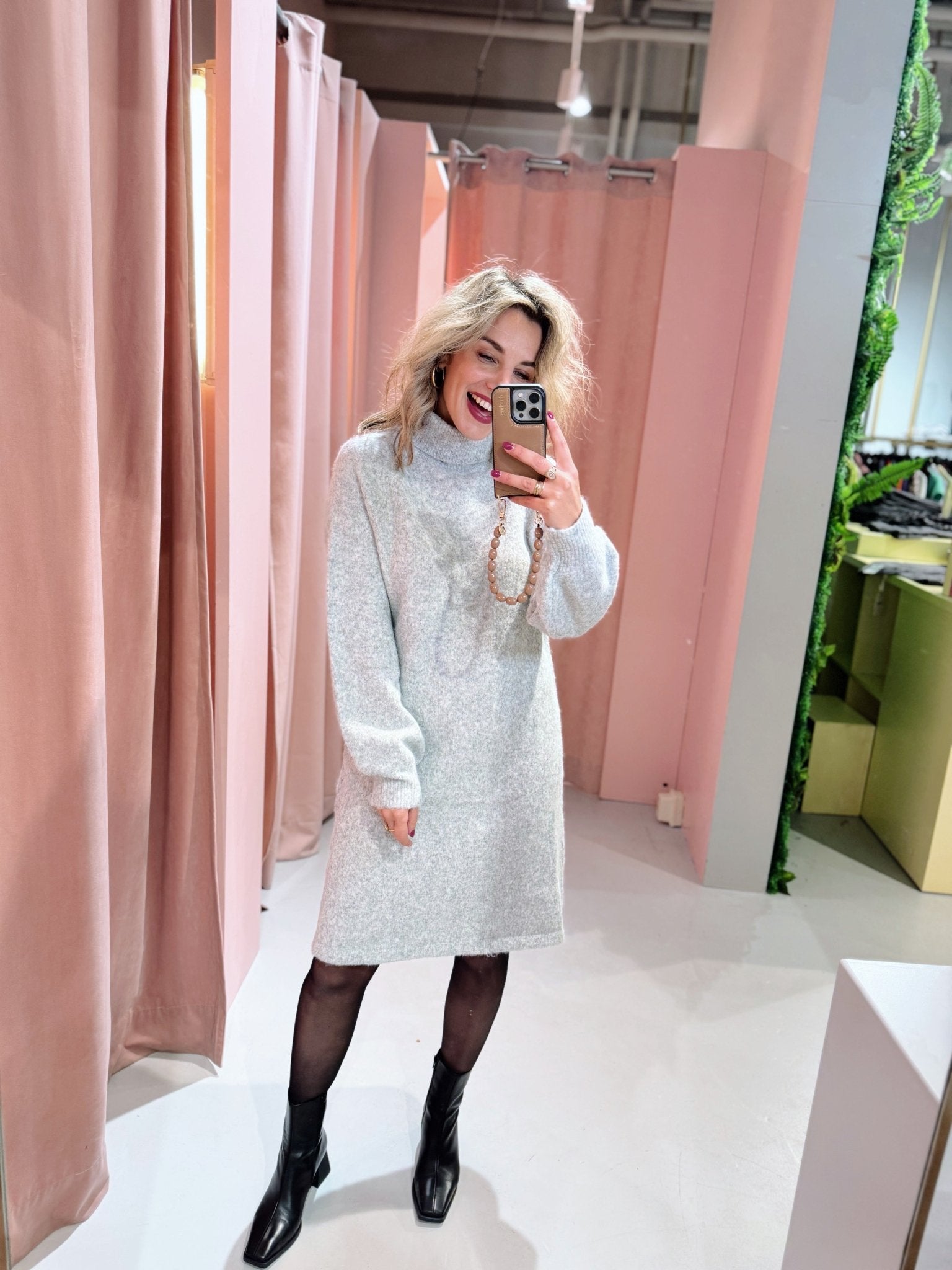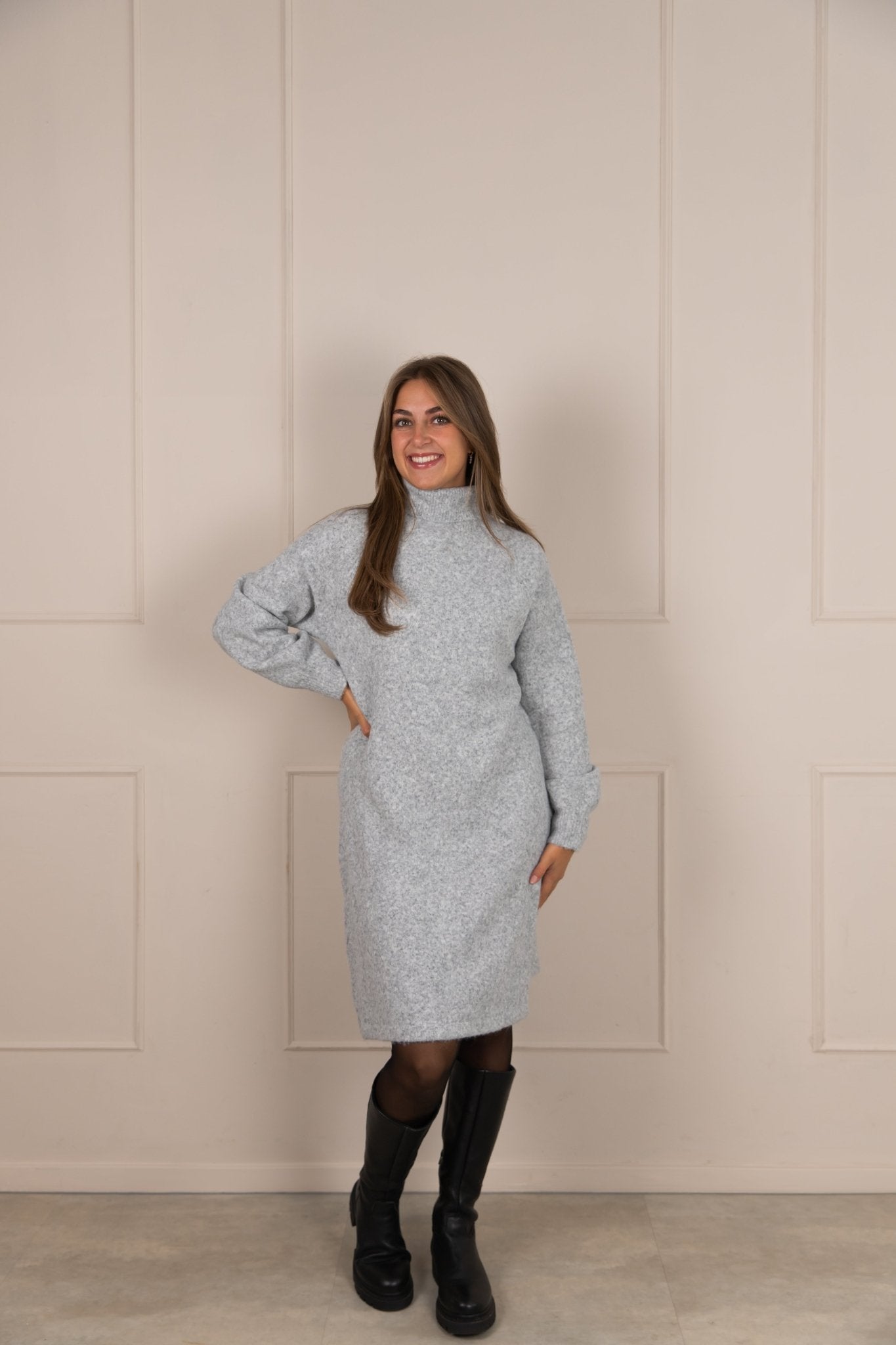 De Ciara Dress in grijs is een midi jurk gemaakt van een heerlijk zacht materiaal, waardoor hij heerlijk warm is. De jurk is voorzien van een col en lange pofmouwen en is leuk te combineren met een paar stoere boots en een trenchcoat!