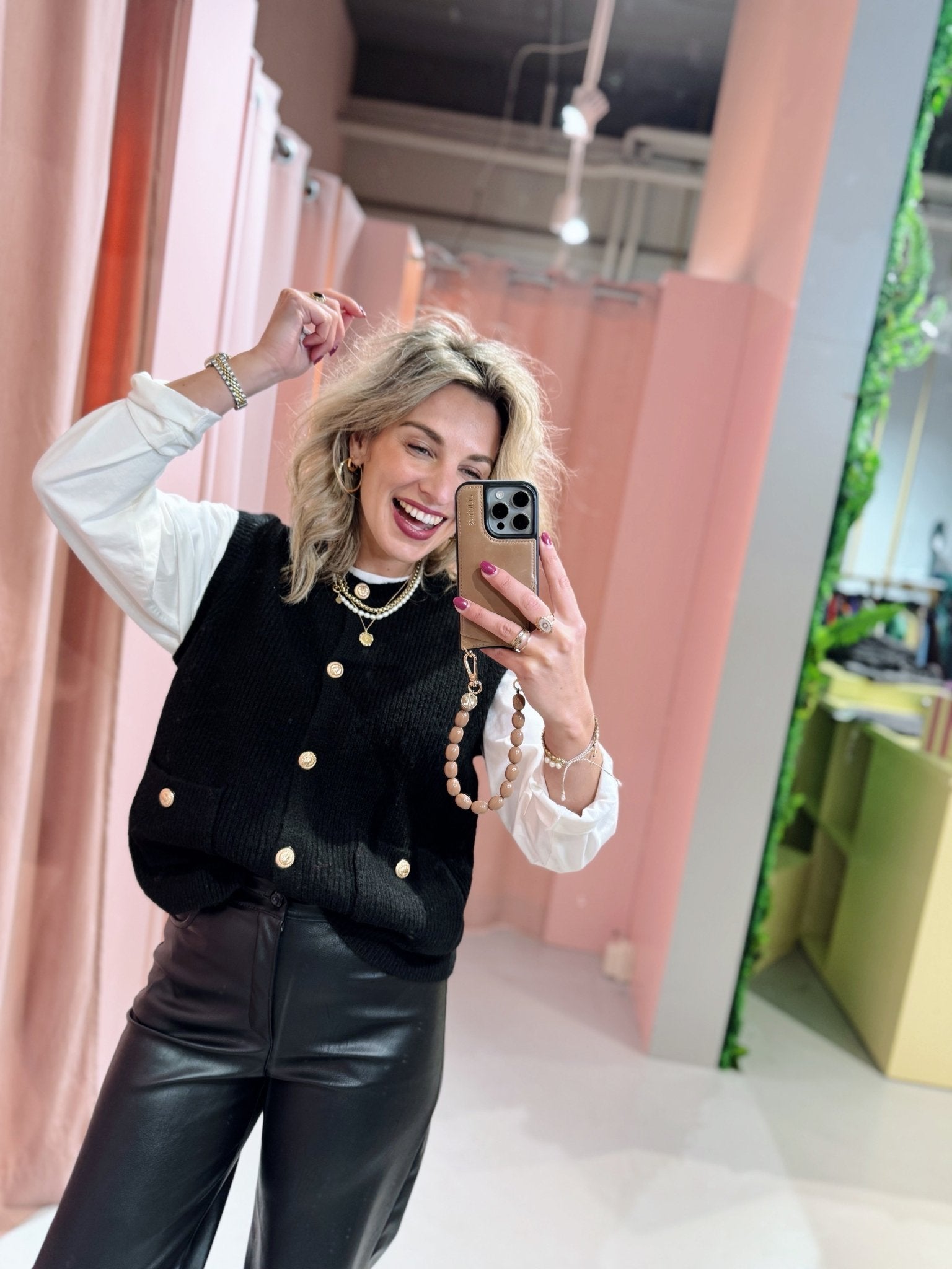 Het Claire Gilet in zwart is gemaakt van een zacht gebreid materiaal en is hierdoor perfect voor het najaar. Het gilet is heerlijk warm en is voorzien van twee zakken en een knoopsluiting met gouden knopen aan de voorkant.