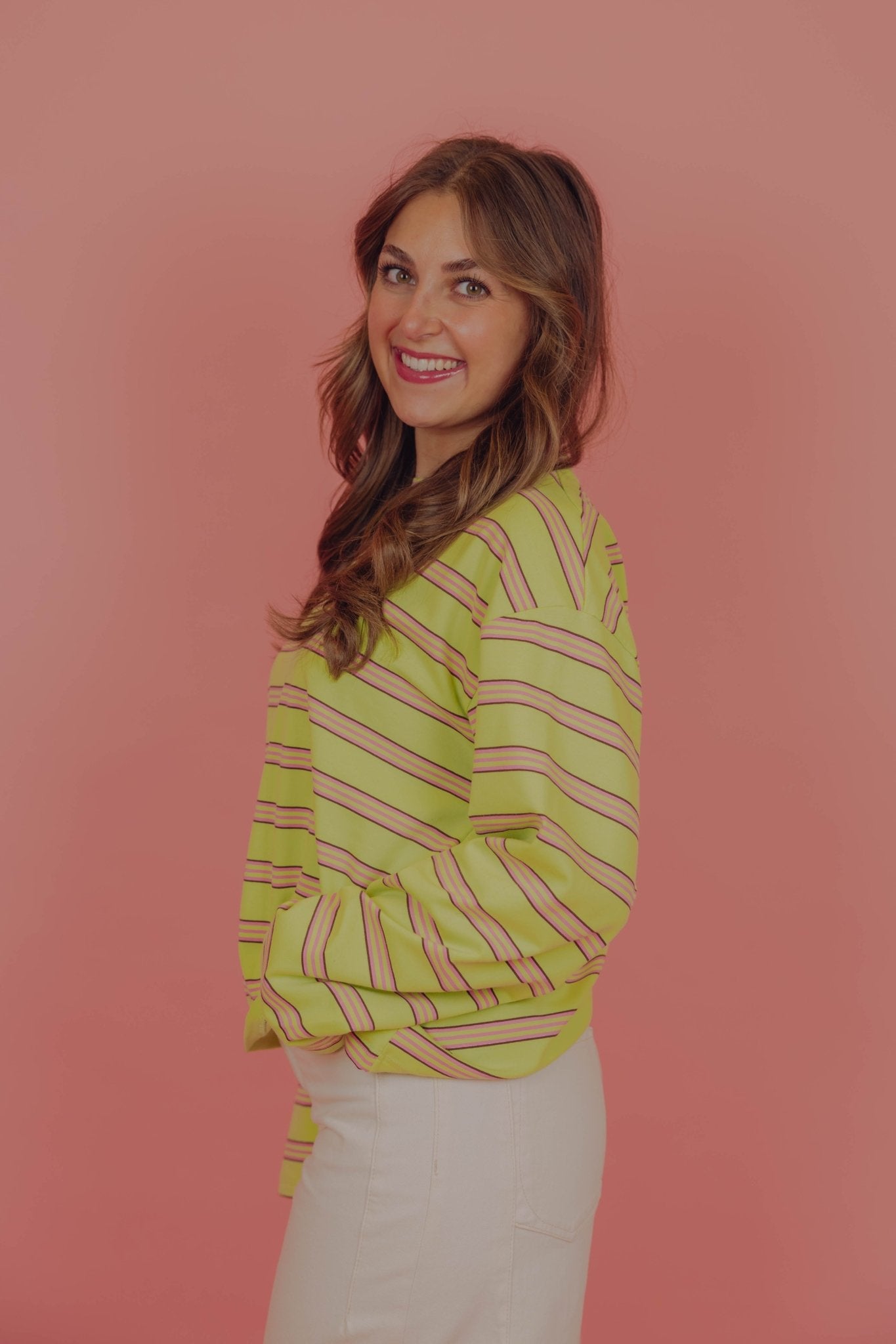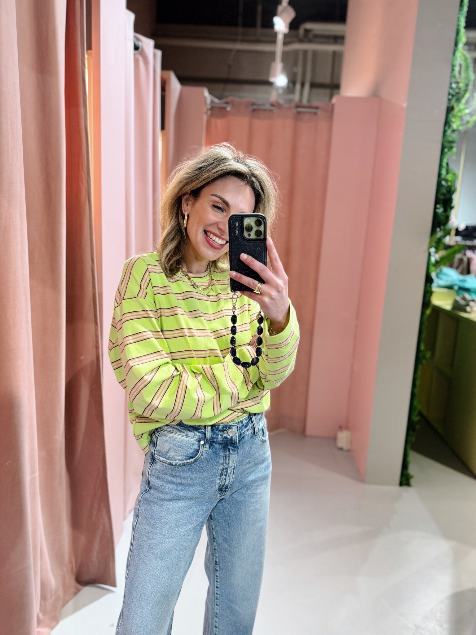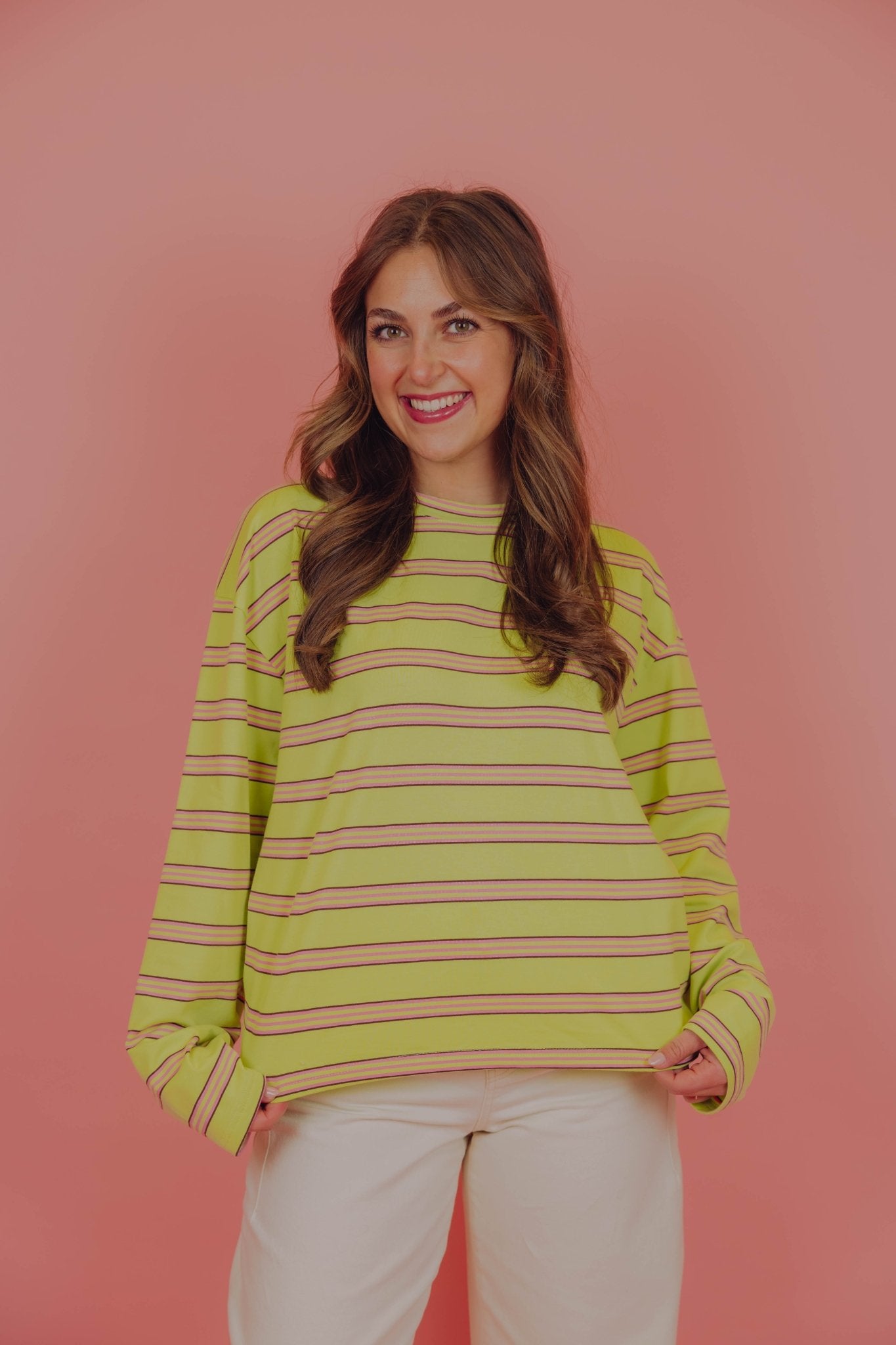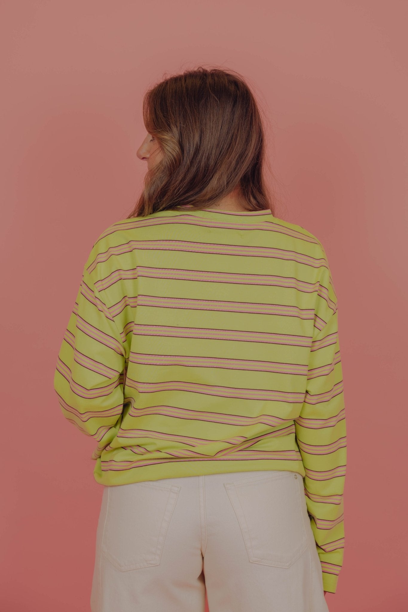 De Claire Longsleeve in groen is een top met een boxy model. De top is gemaakt van een stretchy stof, heeft lange mouwen met een hoge, ronde halslijn en een streep patroon. Deze lange mouwen top is perfect om laagjes mee te creëren.