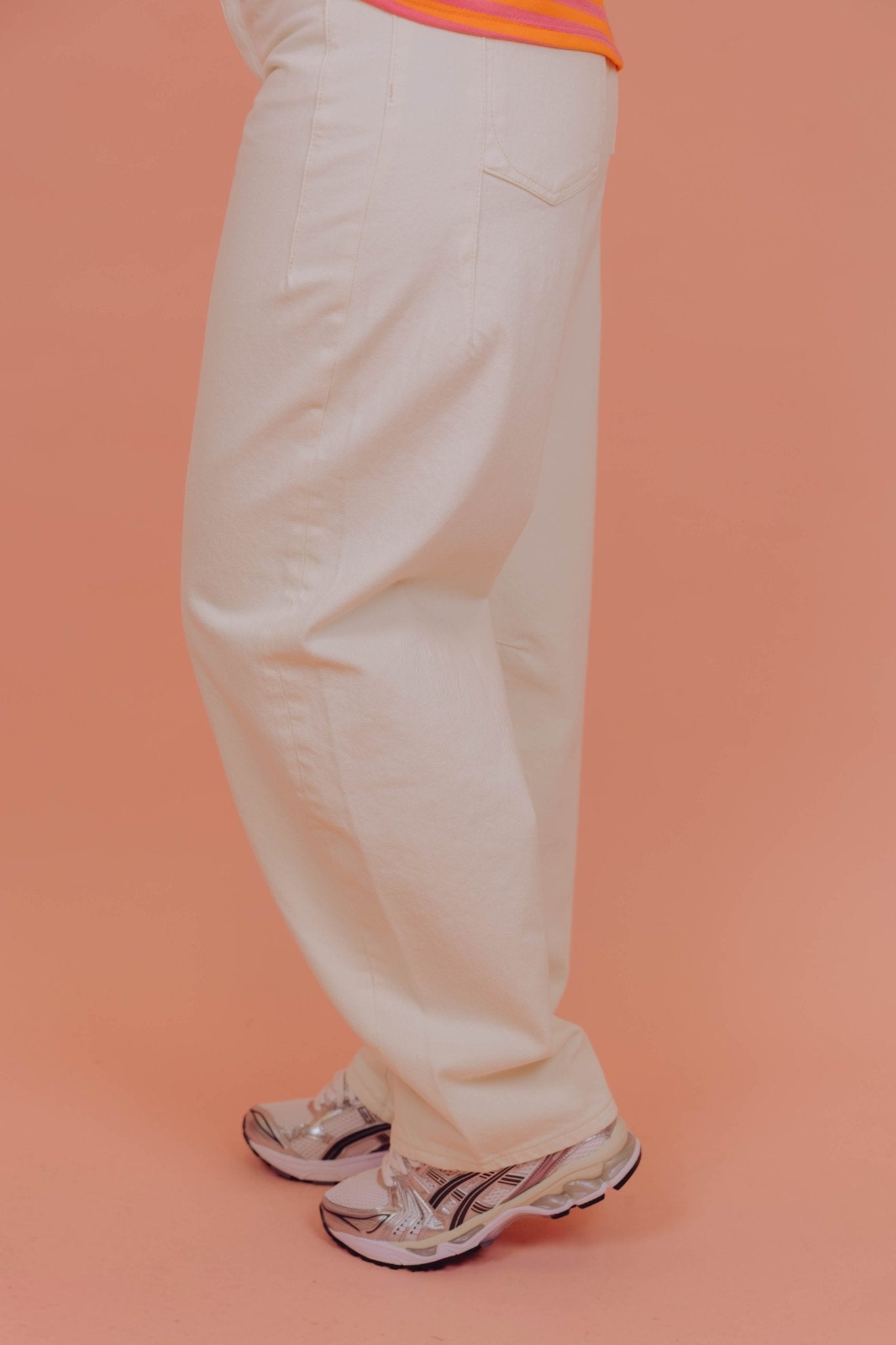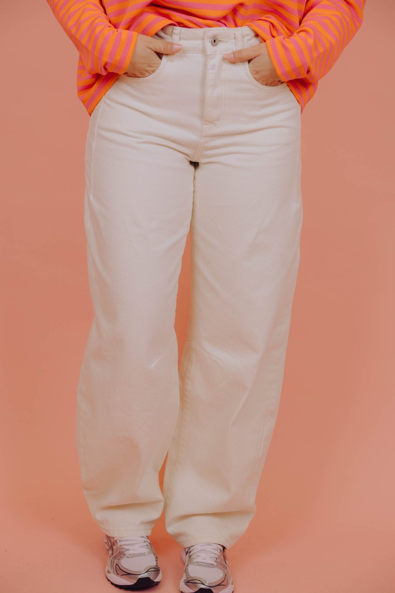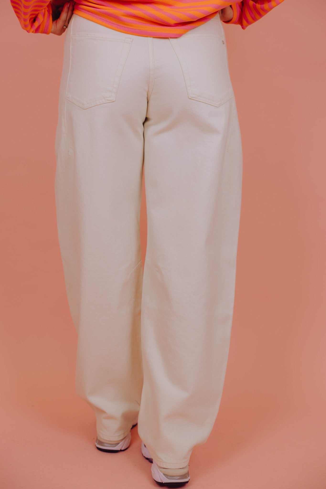 Deze COJ jeans heeft een mid waist en een recht, relaxed model. De off-white kleur geeft de jeans een frisse en rustige look. De pijpen vallen recht naar beneden en hebben een fijne, losse fit. De jeans is gemaakt van stevig denim dat comfortabel draagt en mooi in model blijft. Aan de voorkant zitten steekzakken en aan de achterkant twee opgestikte zakken. Op de achterkant van de tailleband zit het herkenbare COJ label.
