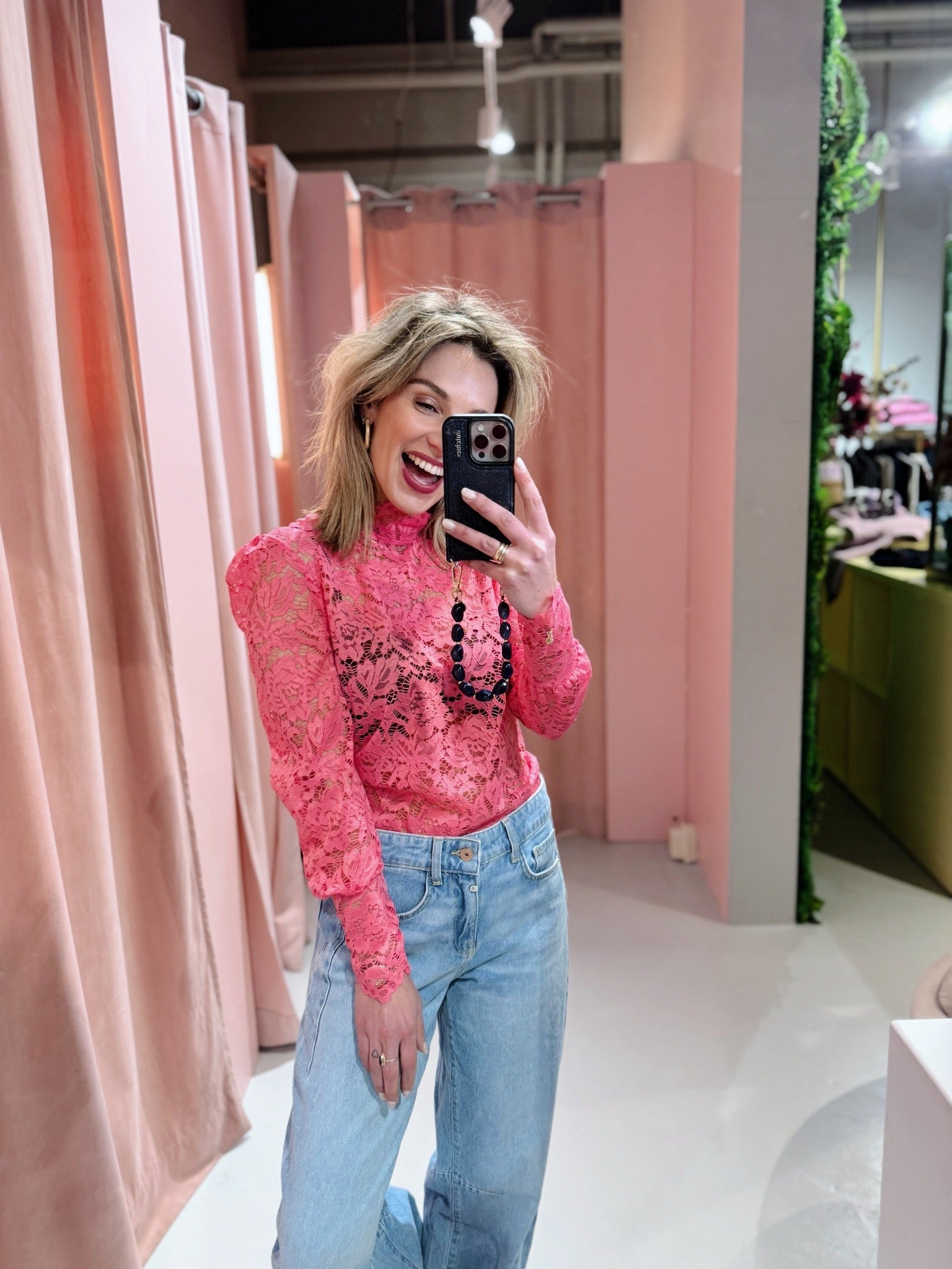 De Clara Lace Top in fuchsia is gemaakt van een doorschijnende kanten stof en heeft een vrouwelijke uitstraling. De top is voorzien van lange pofmouwen en een hooggesloten halslijn met één knoopje aan de achterkant, waardoor hij makkelijk aan en uit te trekken is.