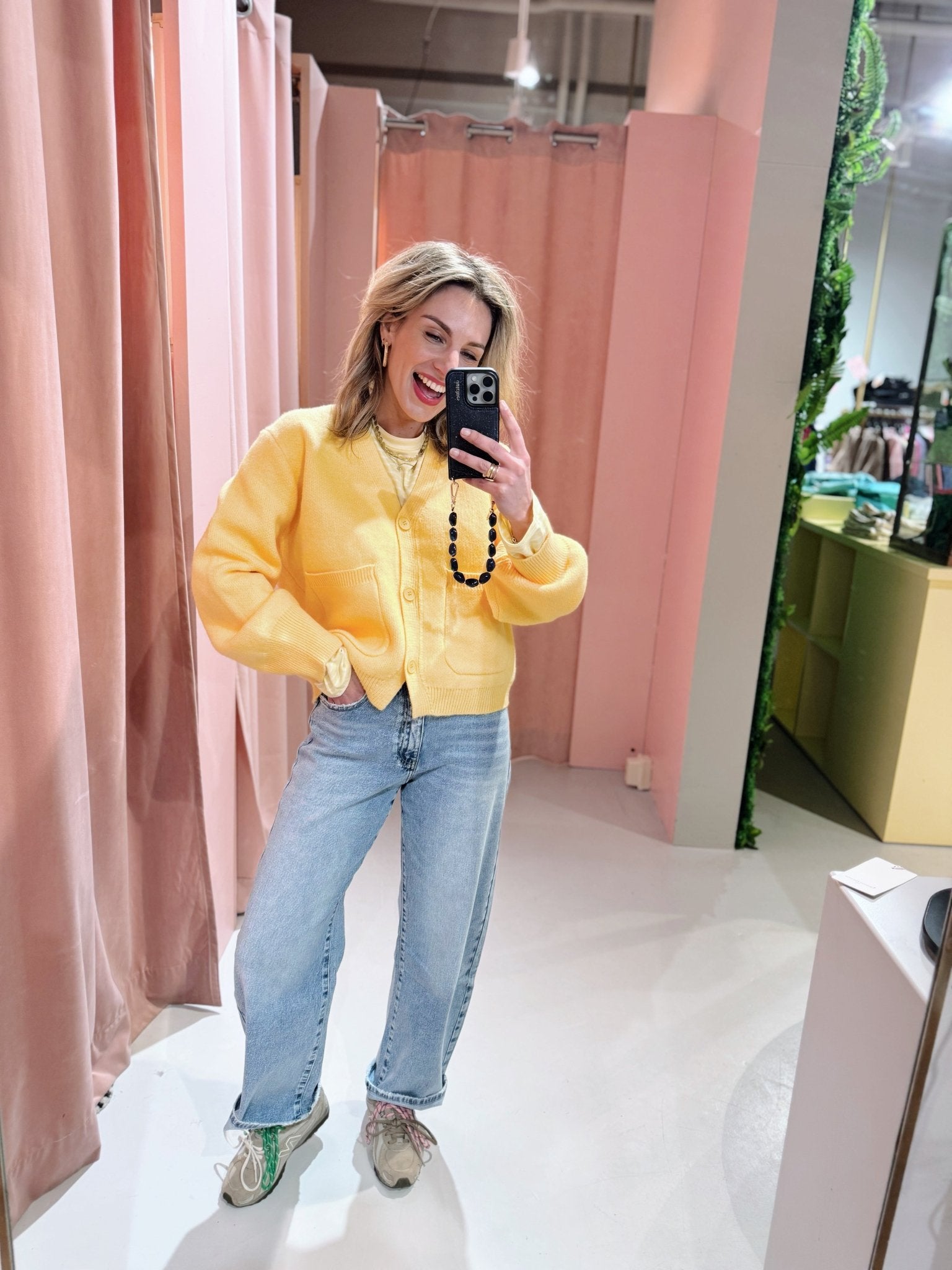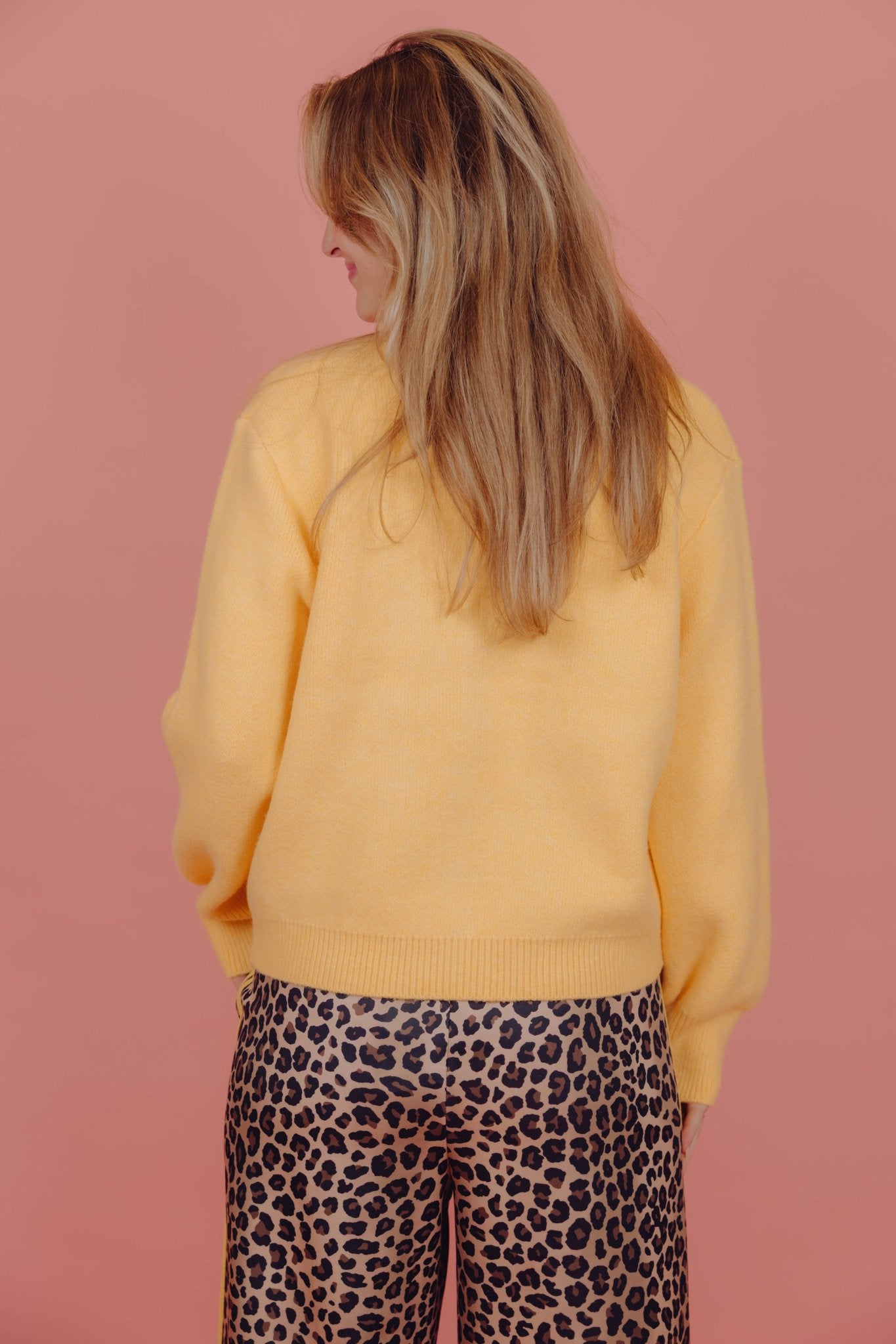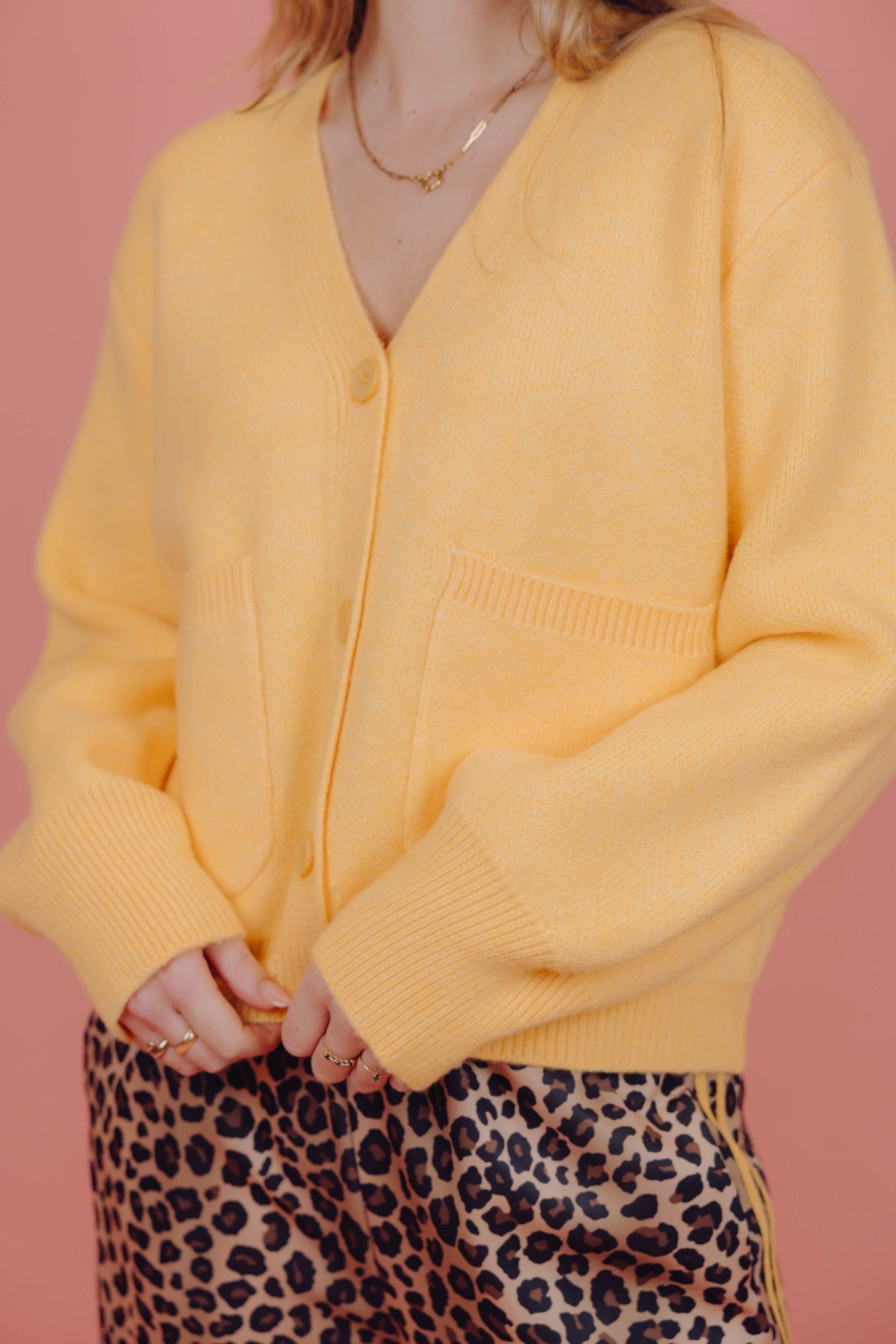 De Coco Cardigan in geel is een gebreid vest met twee zakken en een knooplsuiting. Daarnaast is het vest voorzien van een v-hals. Het vestje is heerlijk warm en is leuk te combineren met een longsleeve en een jeans.