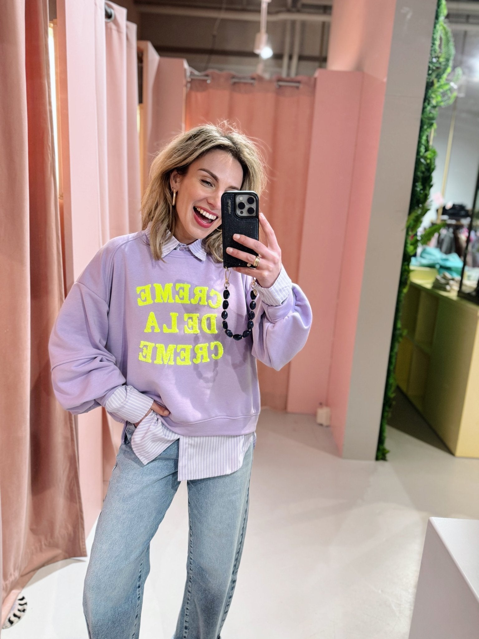 De Creme Sweater in lila is een oversized trui met lange mouwen, een ronde halslijn en een asymmetrsiche achterkant. De trui heeft een losse pasvorm en is voorzien van een opdruk met de tekst "Creme de la creme" op de voorkant.