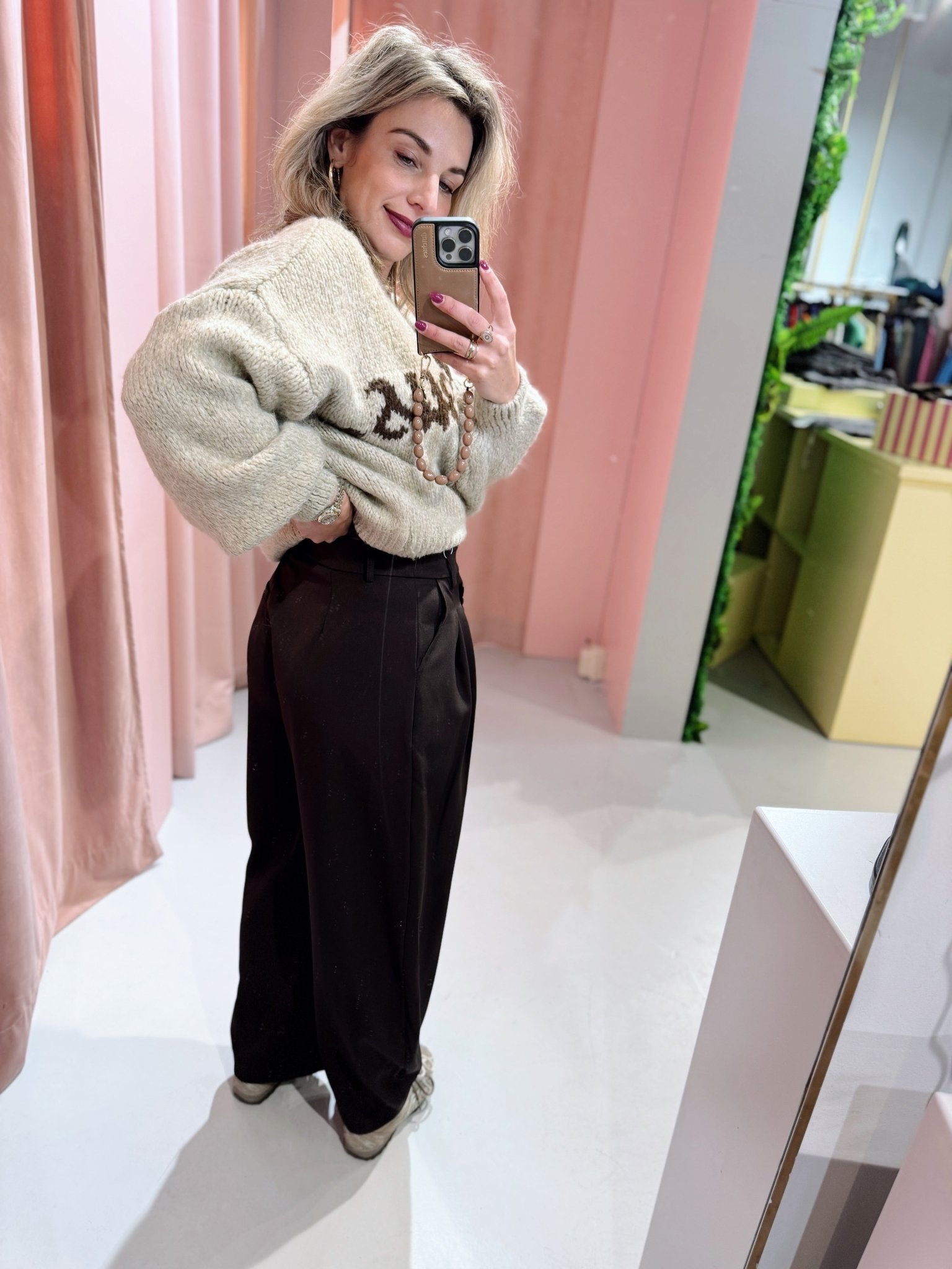 De Cyrus Pants in bruin heeft een asymmetrische taille en een balloon fit, waarbij de broek wat ruimer valt rond de heupen en bovenbenen en naar beneden toe iets toeloopt. Dit zorgt voor een moderne en stijlvolle vorm met een speels volume. Het ontwerp is afgewerkt met plooien aan de voorkant, steekzakken en een knoopsluiting. Aan de achterkant is de broek voorzien van een nep zakje.