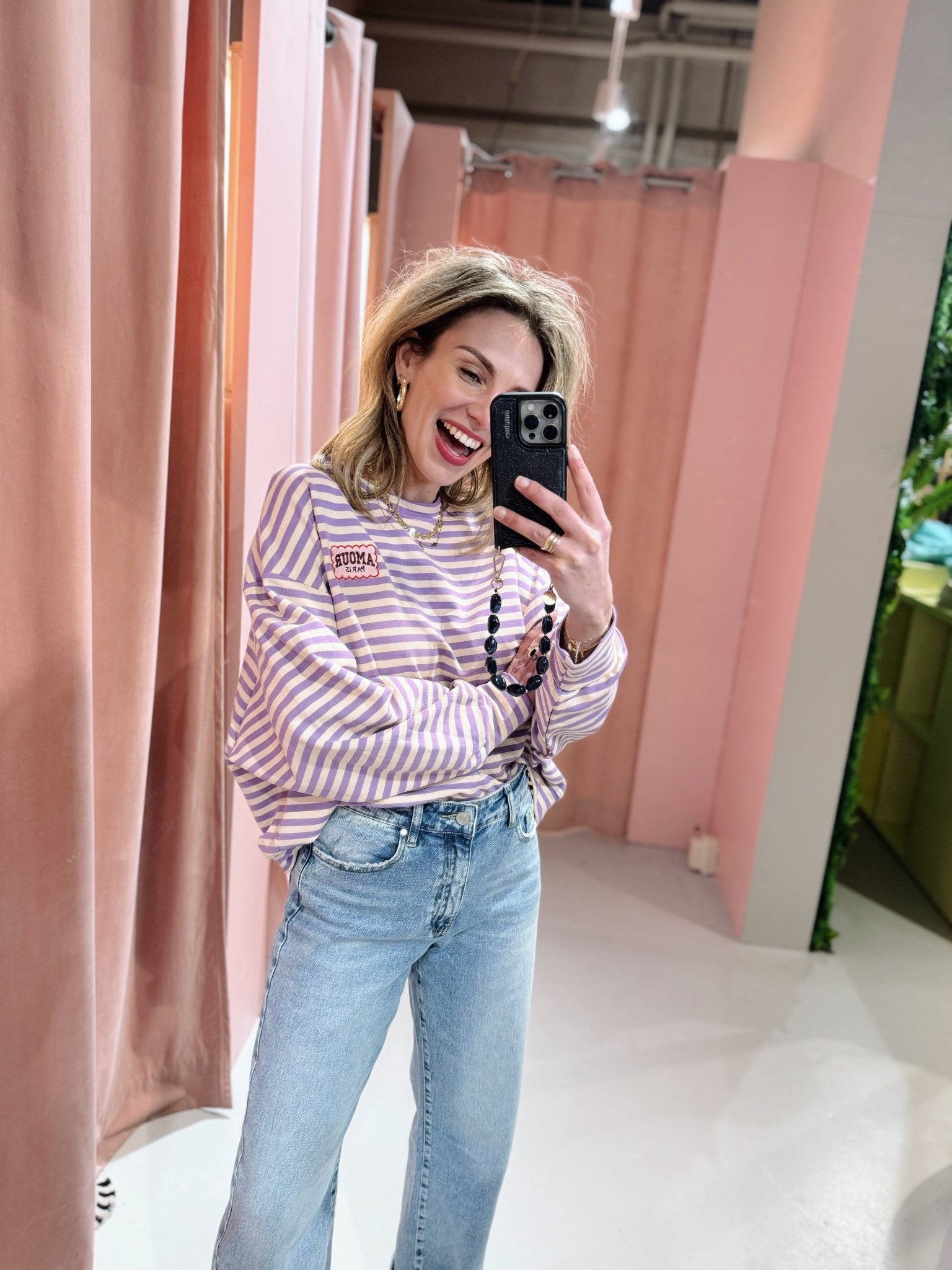 De Davina Longsleeve in lila is een longsleeve met een iets wijder model. De top heeft lange mouwen met een hoge, ronde halslijn en een streep patroon. Op de borst zit een patch met de tekst "Amour Paris".