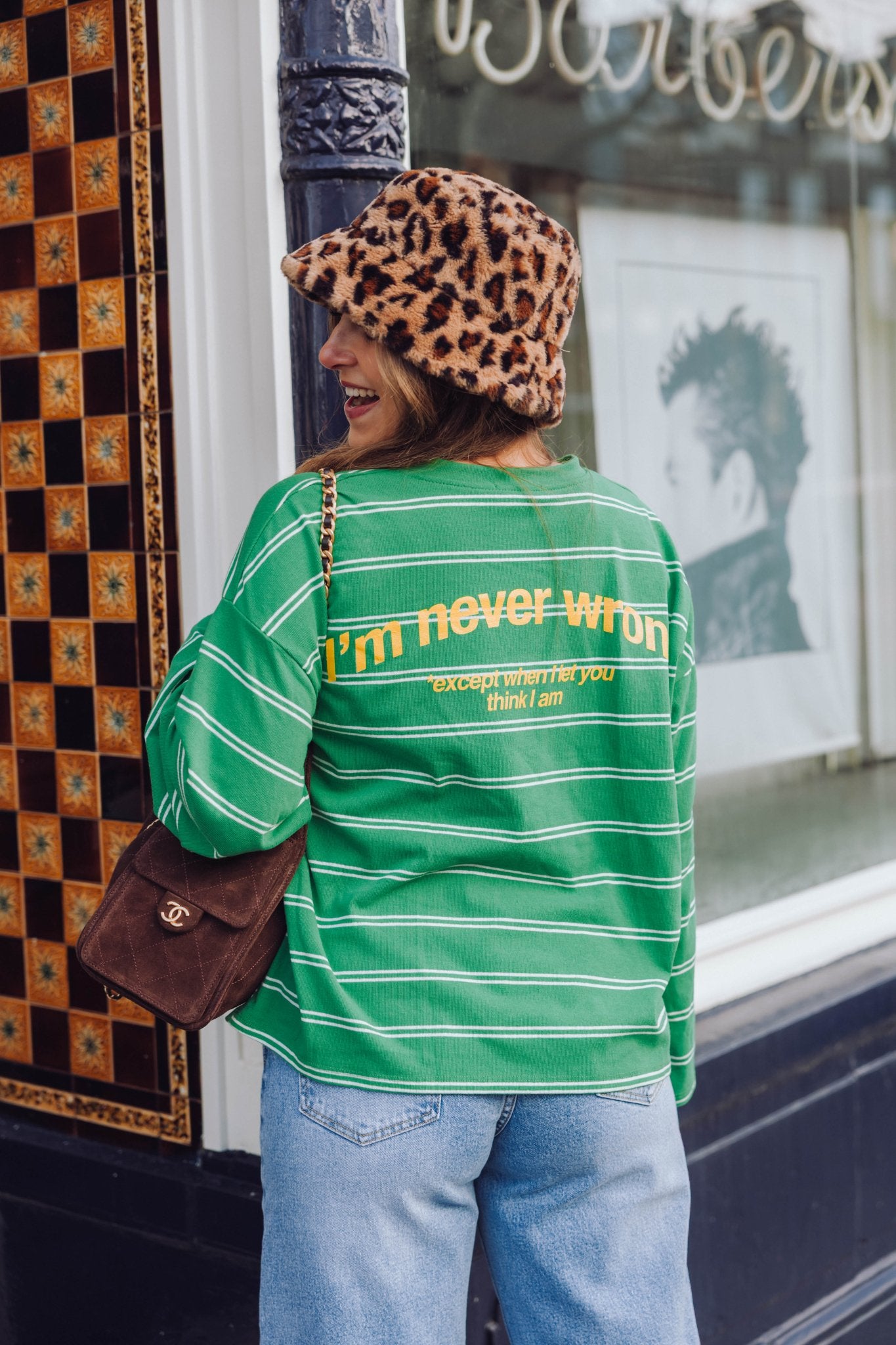 De Dewi Longsleeve in groen is een top met een boxy model. De top is gemaakt van een stretchy stof, heeft lange mouwen met een hoge, ronde halslijn en een streep patroon. Het leuke aan deze longsleeve? Hij is voorzien van de tekst "I'm never wrong, except when i let you think i am" op de voor- en achterkant.