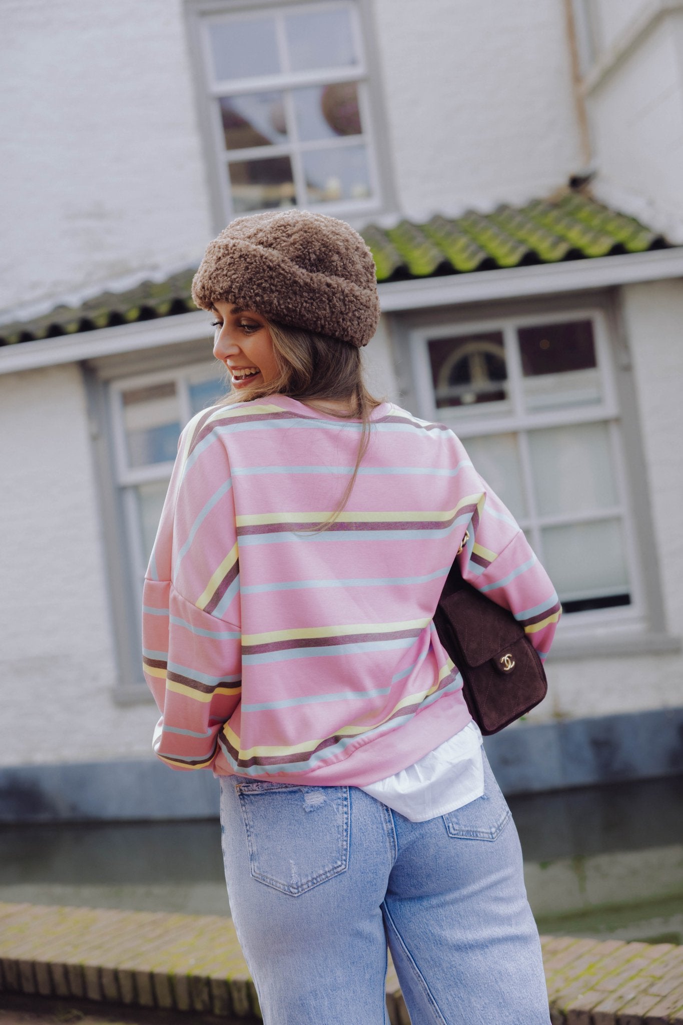 De Diana Longsleeve in roze is een top met een iets wijder model. De top heeft lange mouwen met een hoge, ronde halslijn en een streep patroon. Het leuke aan deze longsleeve? Hij is aan de onderkant voorzien van een nep blousje!