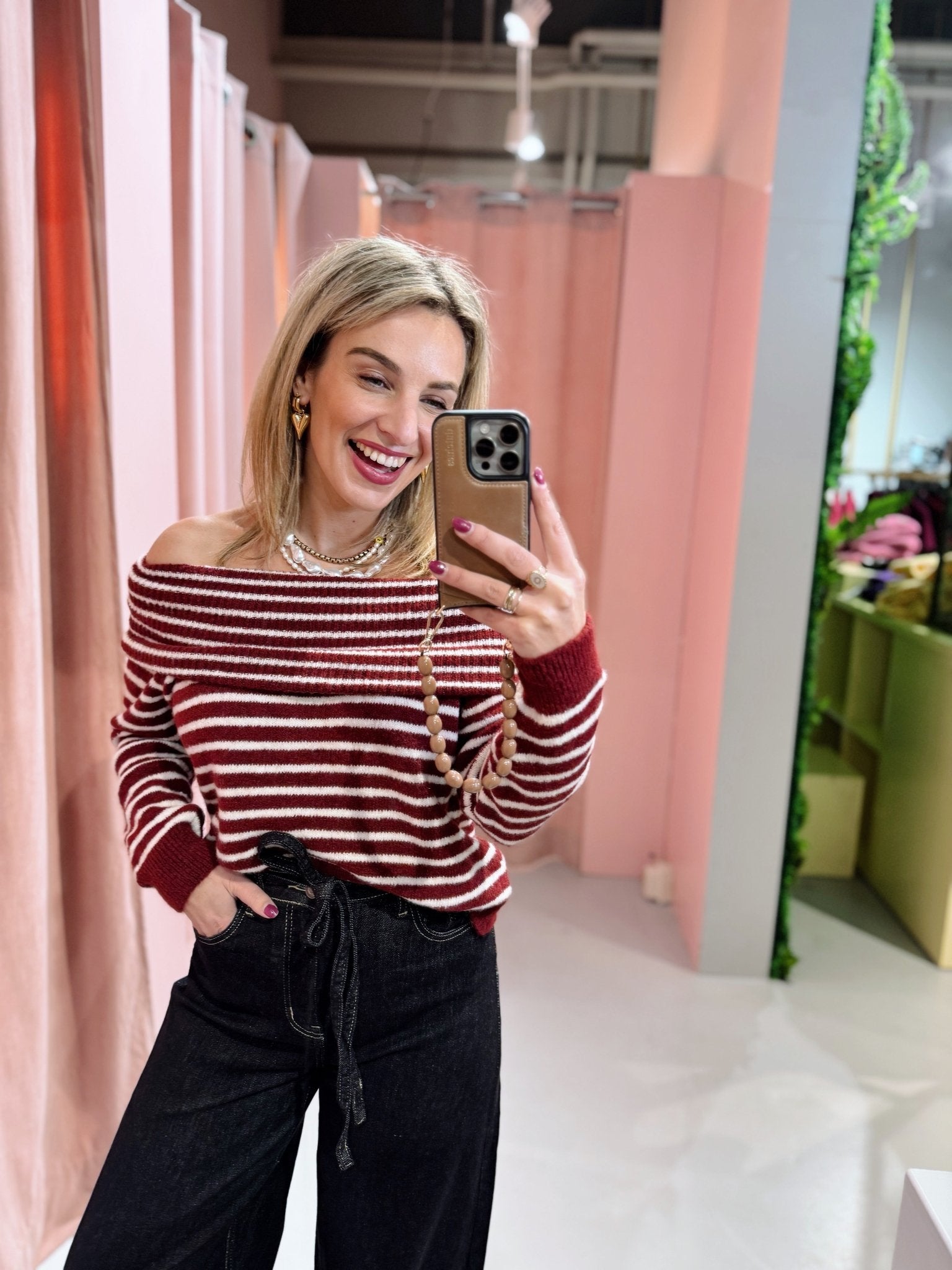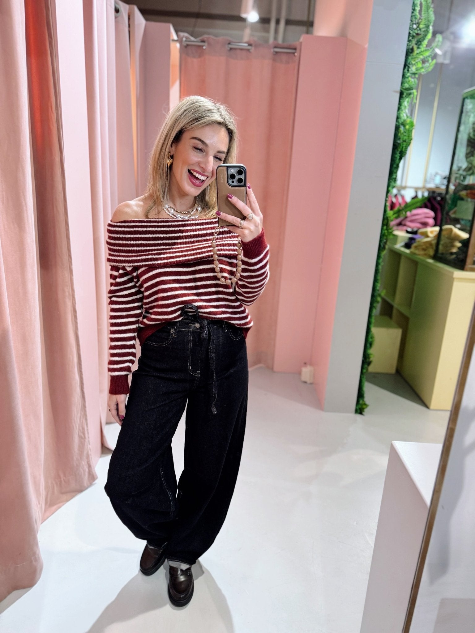 De Diane Knit  heeft een regular fit en een speelse offshoulder halslijn. De bruin-wit gestreepte trui valt losjes en heeft een zachte, comfortabele structuur die fijn draagt. De brede omslag bij de hals geeft het model een vrouwelijke en moderne uitstraling.