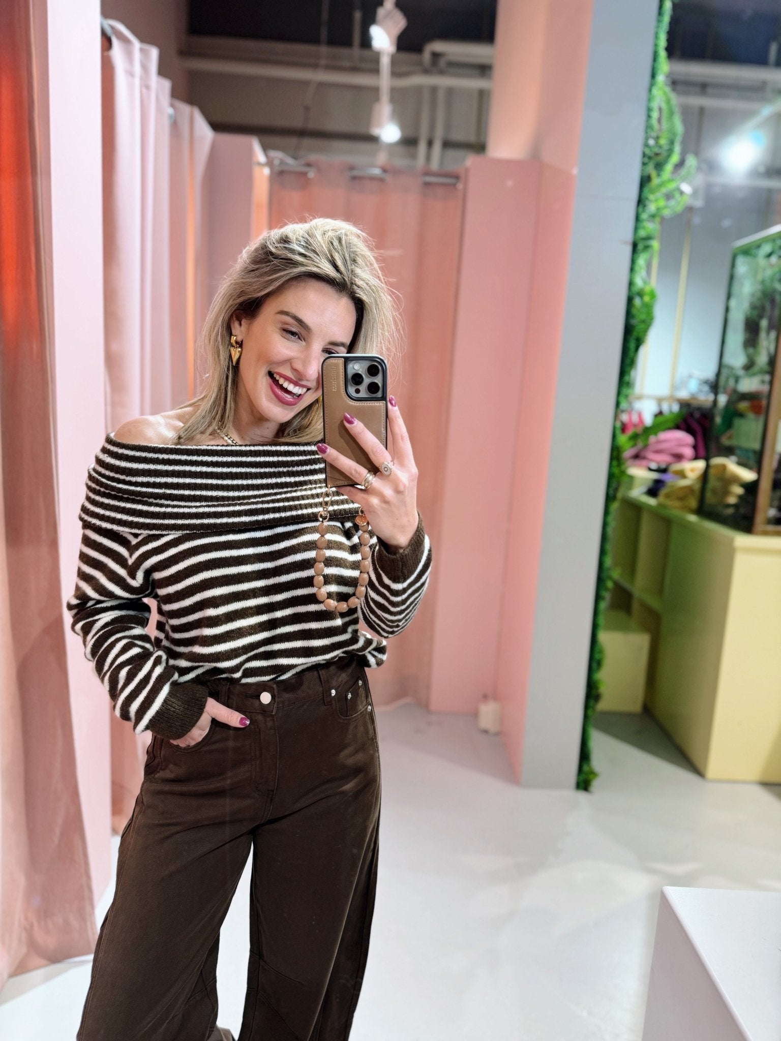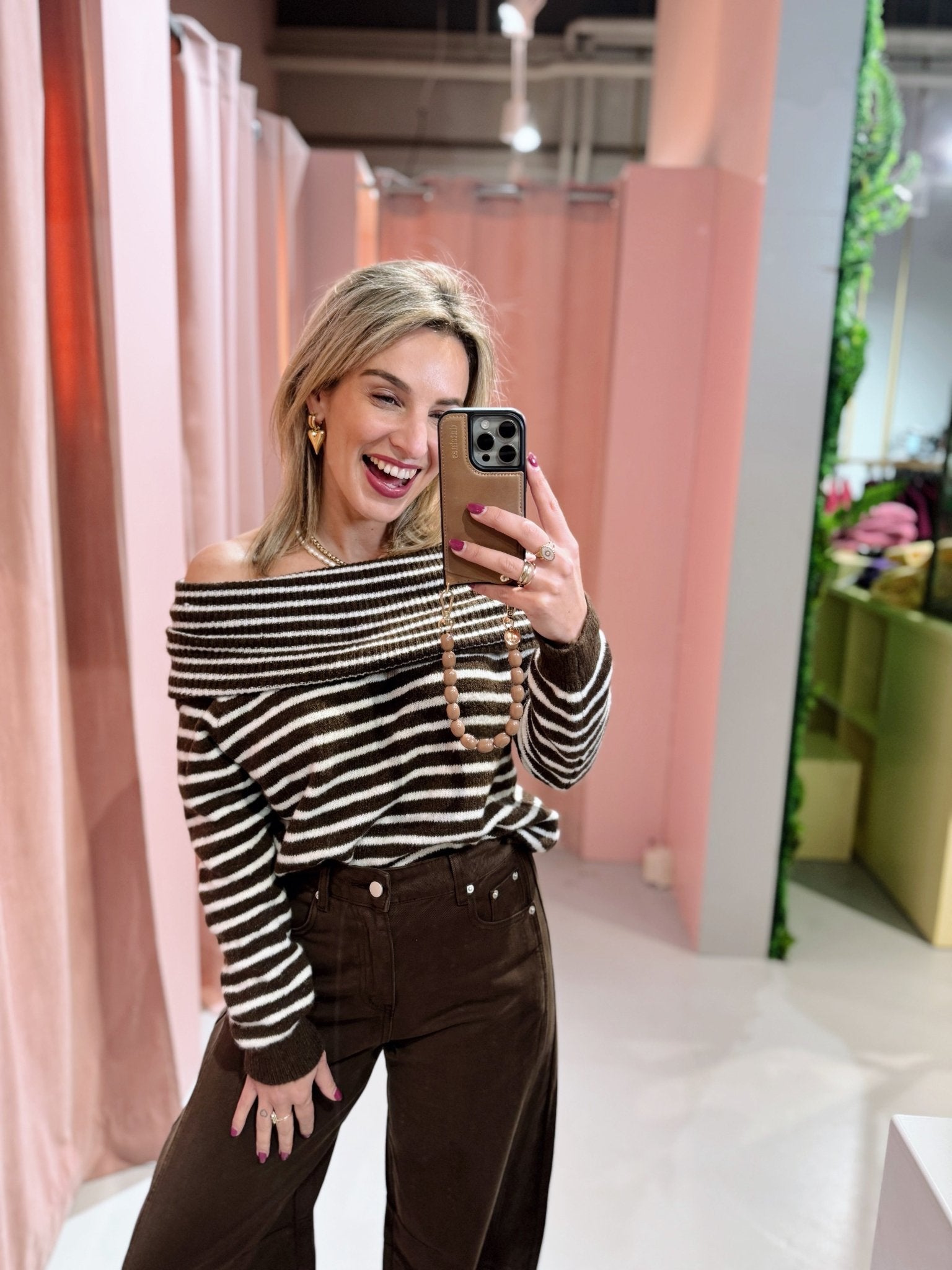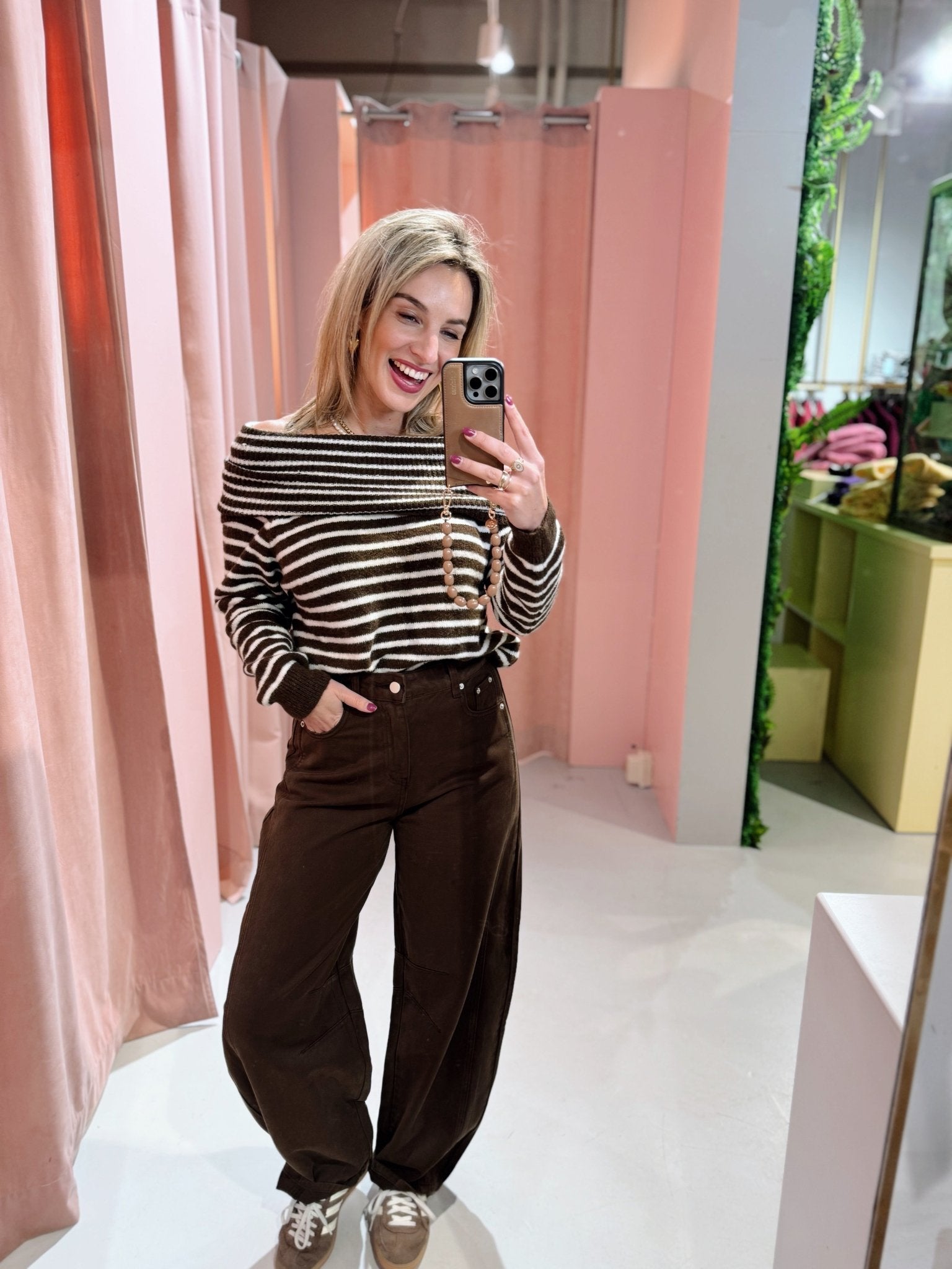 De Diane Knit heeft een regular fit en een speelse offshoulder halslijn. De bruin-wit gestreepte trui valt losjes en heeft een zachte, comfortabele structuur die fijn draagt. De brede omslag bij de hals geeft het model een vrouwelijke en moderne uitstraling.