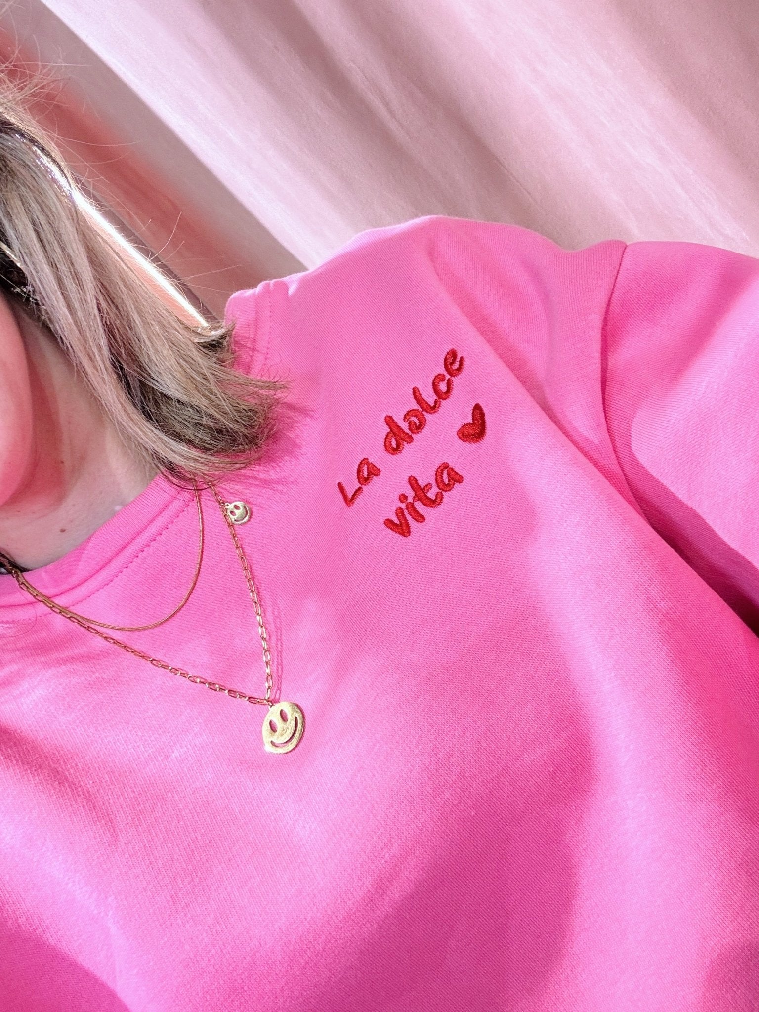 De Dolce Vita Sweater in roze is een oversized trui met lange mouwen en een ronde halslijn. De trui heeft een losse pasvorm en is voorzien van een geborduurde tekst op de voorkant en een grote backprint.
