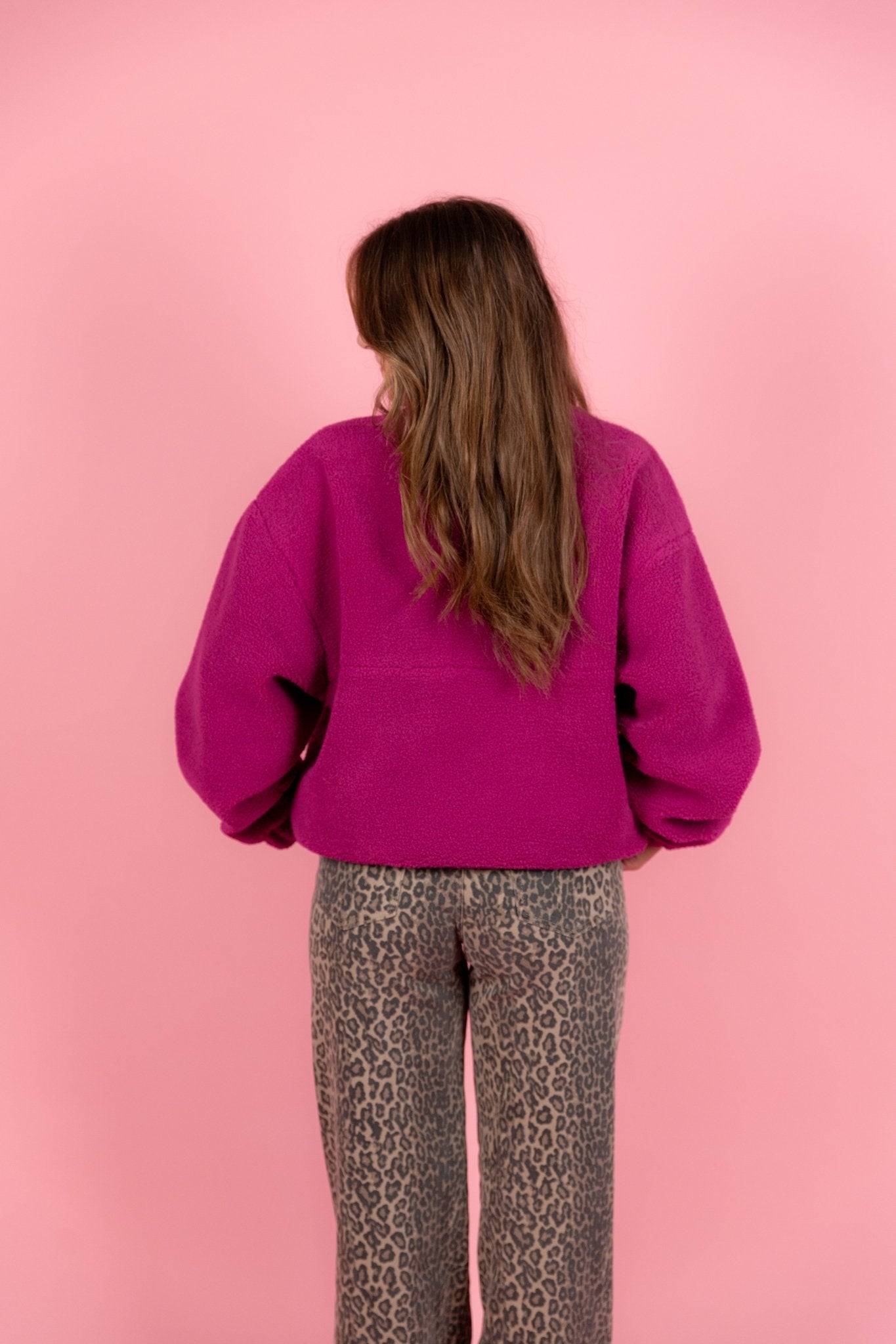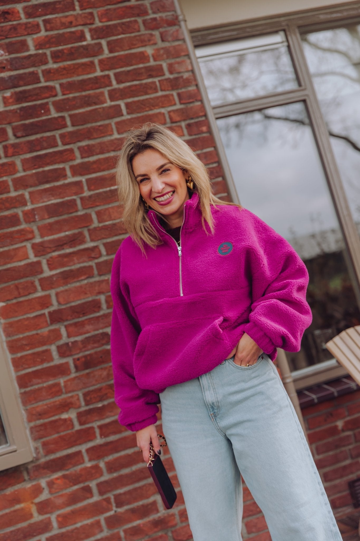 De Eilish Teddy Sweater in magenta is een heerlijk zachte trui die je ook goed kunt gebruiken als najaars jasje. Doordat deze trui gemaakt is van een teddy stof, is hij perfect voor de koudere dagen. De trui is voorzien van een buidelzak, een halve ritssluiting en een patch op de borst.