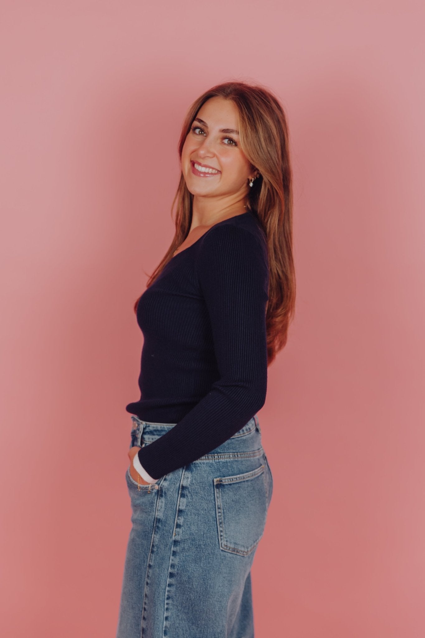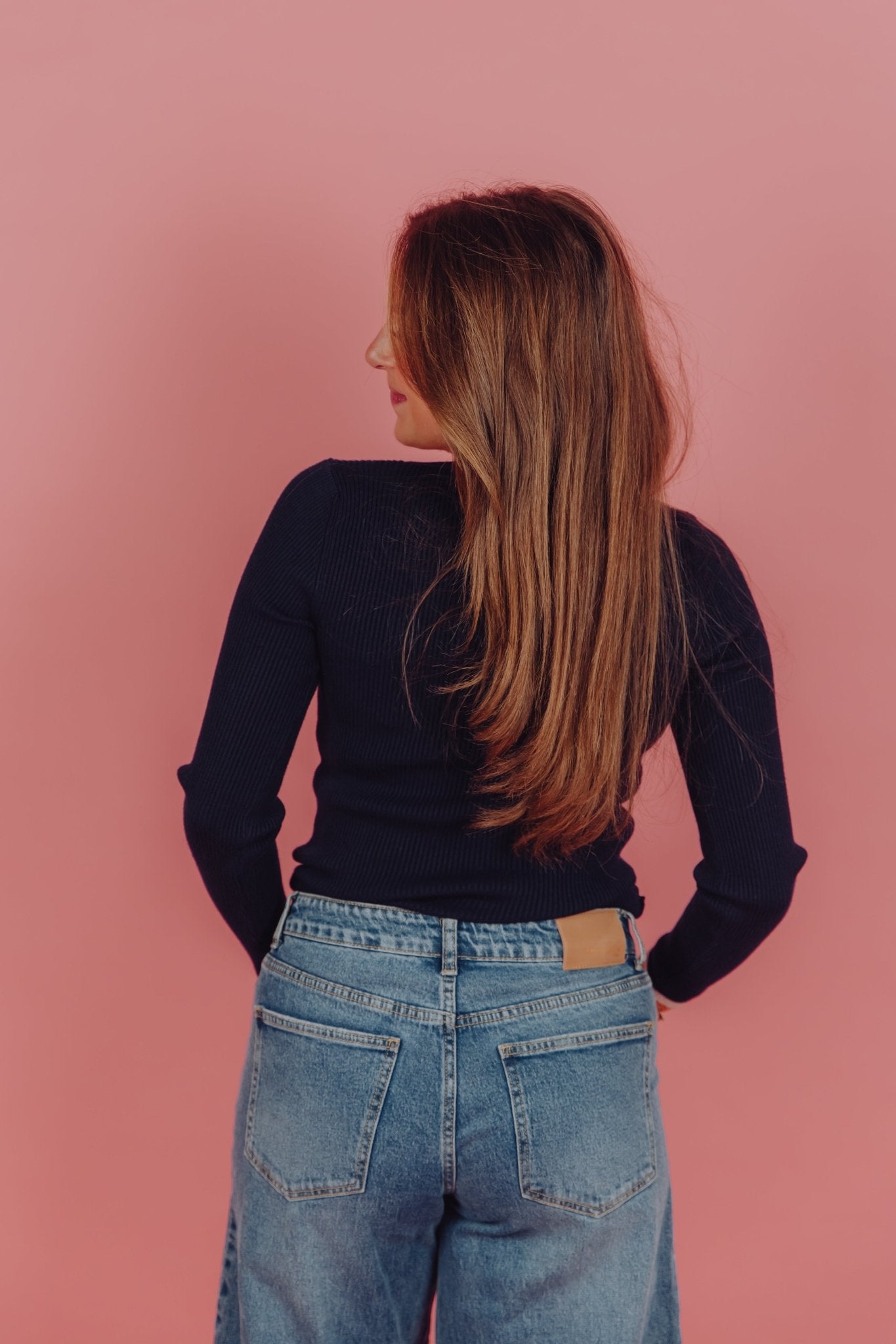 De Elif Longsleeve in donker blauw is gemaakt van een fijne stretch ribstof en heeft een strak model. Het shirt heeft lange mouwen en een vrouwelijke halslijn.