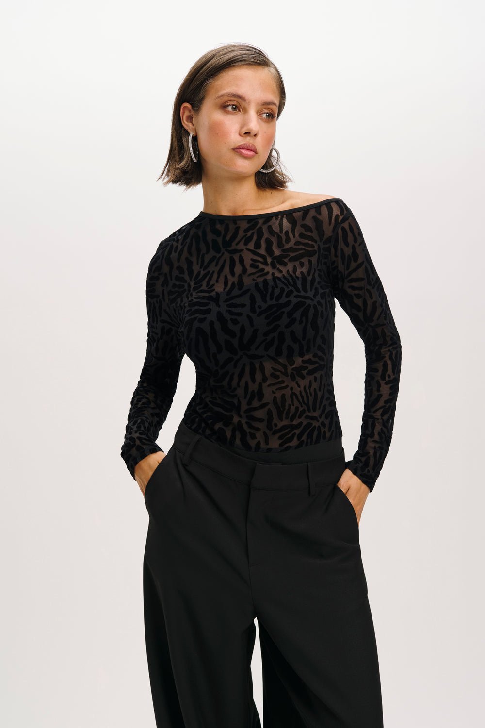 De Elly Bodysuit in zwart van Refined Department is een elegante body met een velvet flockprint in een subtiel animal patroon. De body heeft een aangesloten pasvorm met een asymmetrische halslijn, lange mouwen en een zachte mesh basis die licht doorschijnt. De onderkant is gemakkelijk te sluiten door middel van twee drukknoopjes. De combinatie van fluweel en transparantie zorgt voor een stijlvolle en vrouwelijke look, perfect voor avondjes uit of feestelijke gelegenheden.
