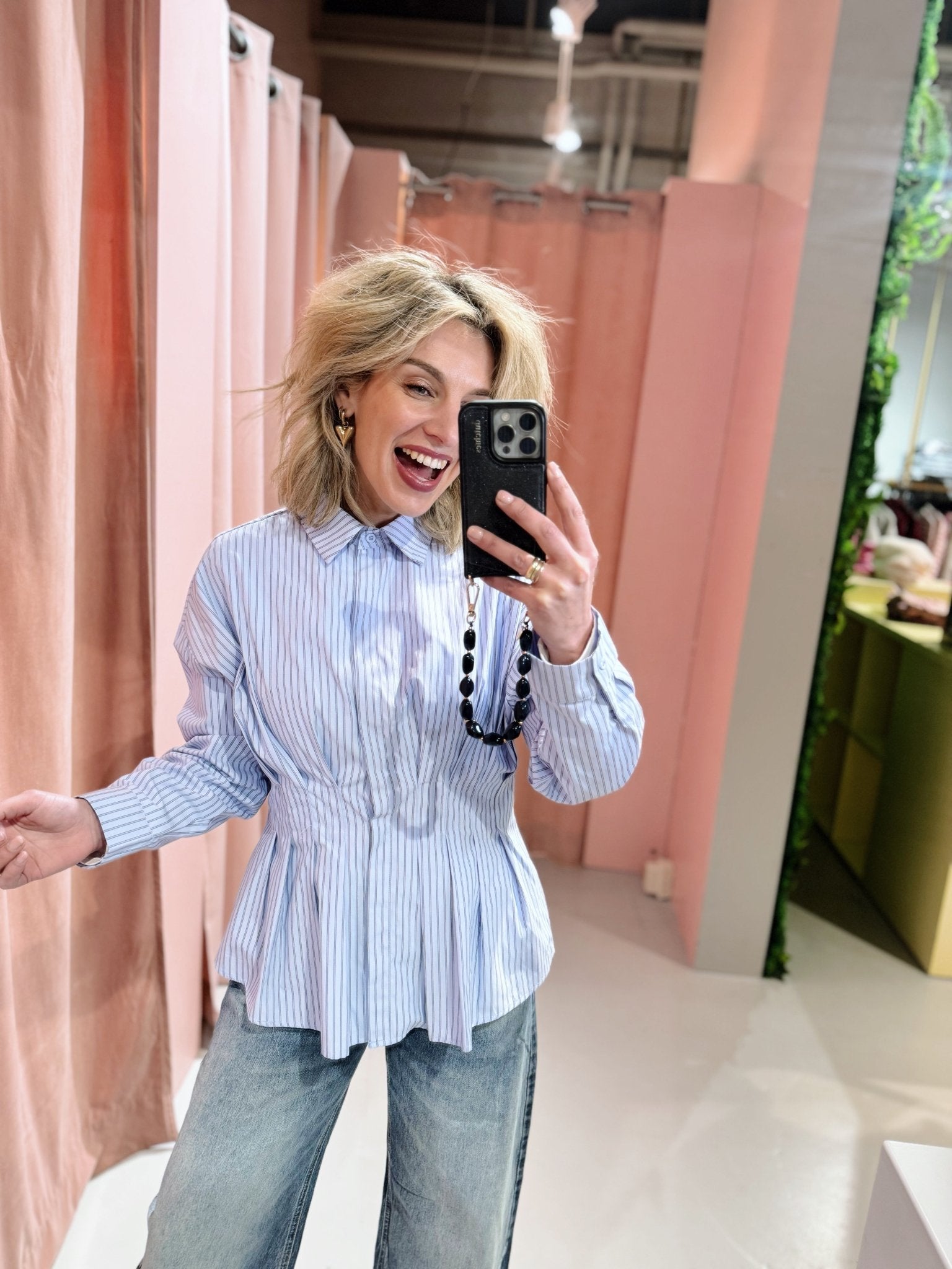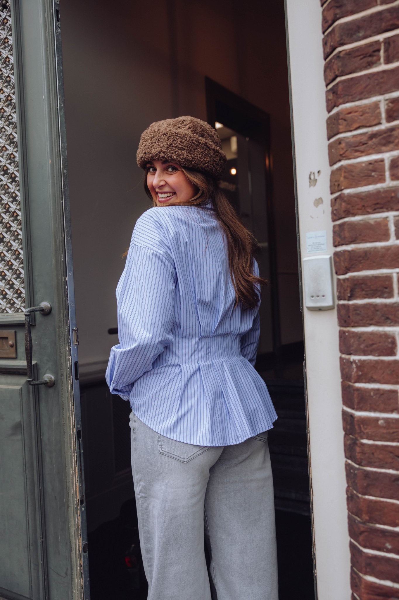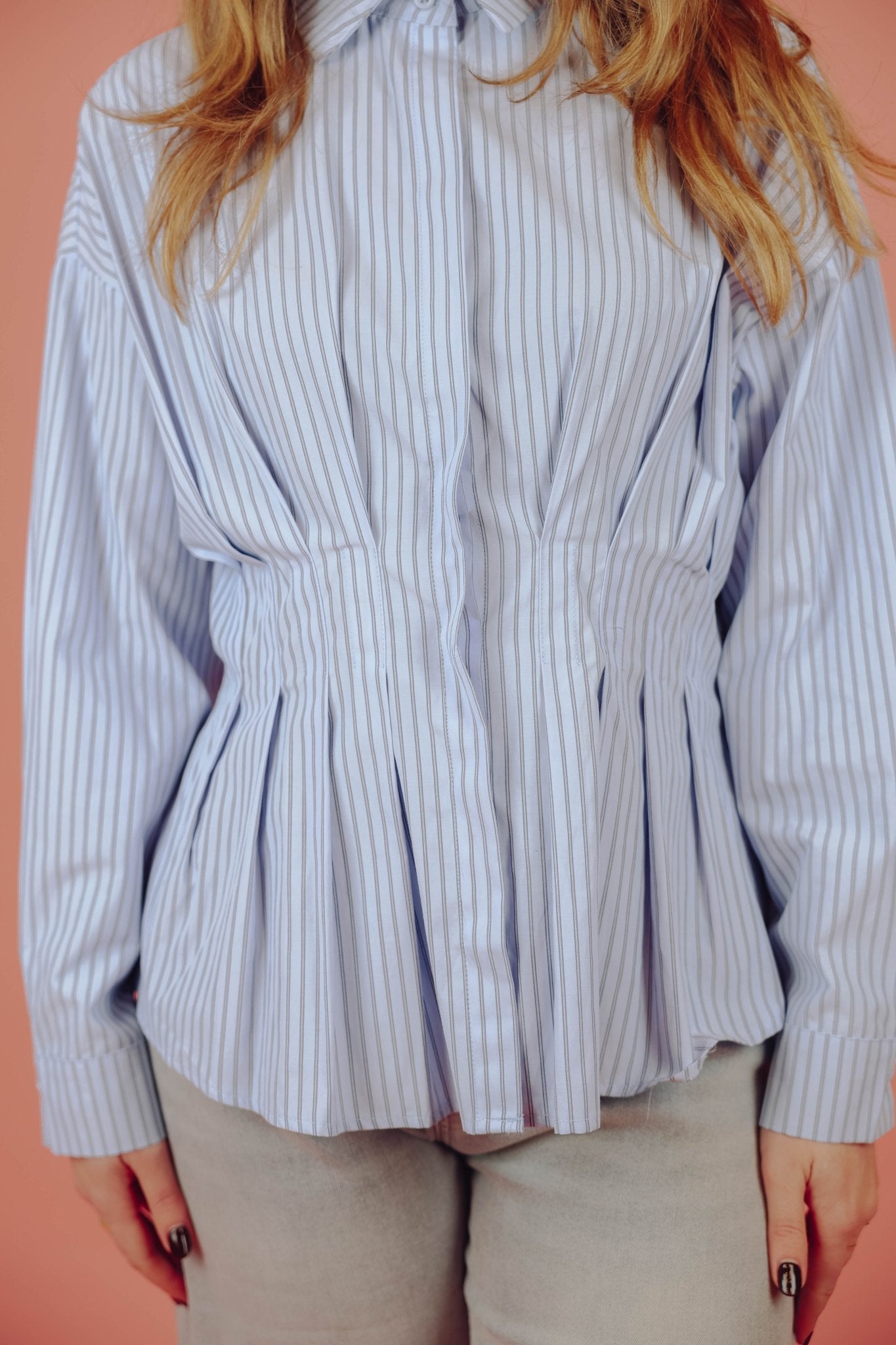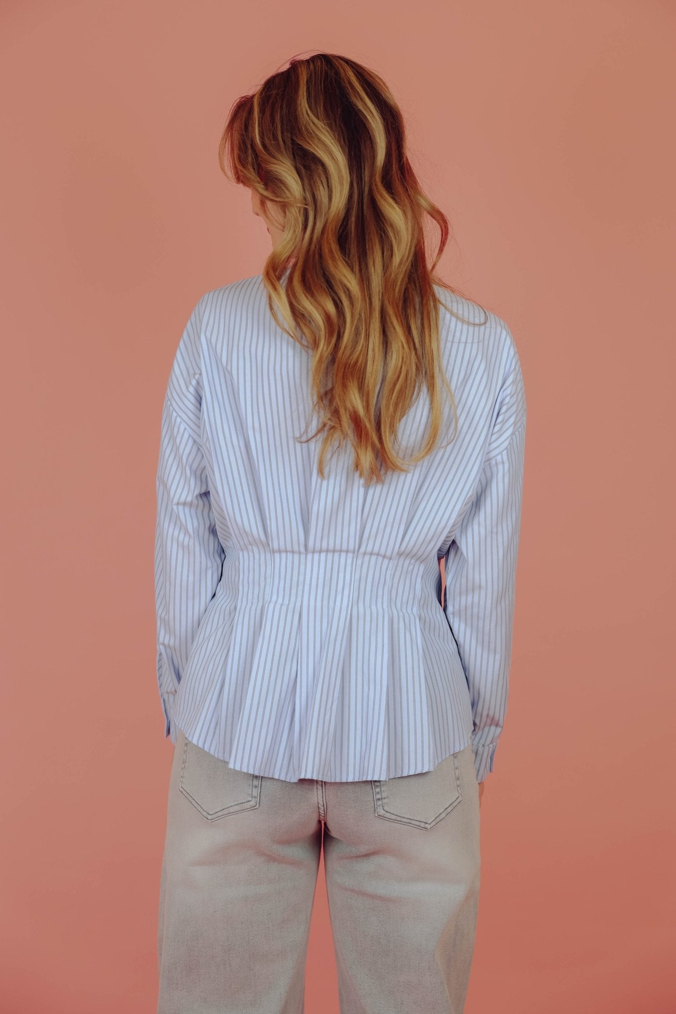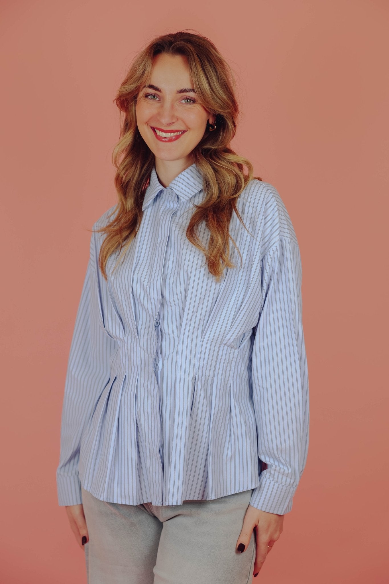 De Feline Blouse in blauw is een item waar je meteen vrolijk van wordt. Door het elastische detail in de taille krijgt de blouse een mooie vrouwelijke vorm. De blouse heeft een klassieke kraag, een knoopsluiting aan de voorkant en lange mouwen die los vallen. De onderkant loopt licht uit, wat zorgt voor een speels effect.