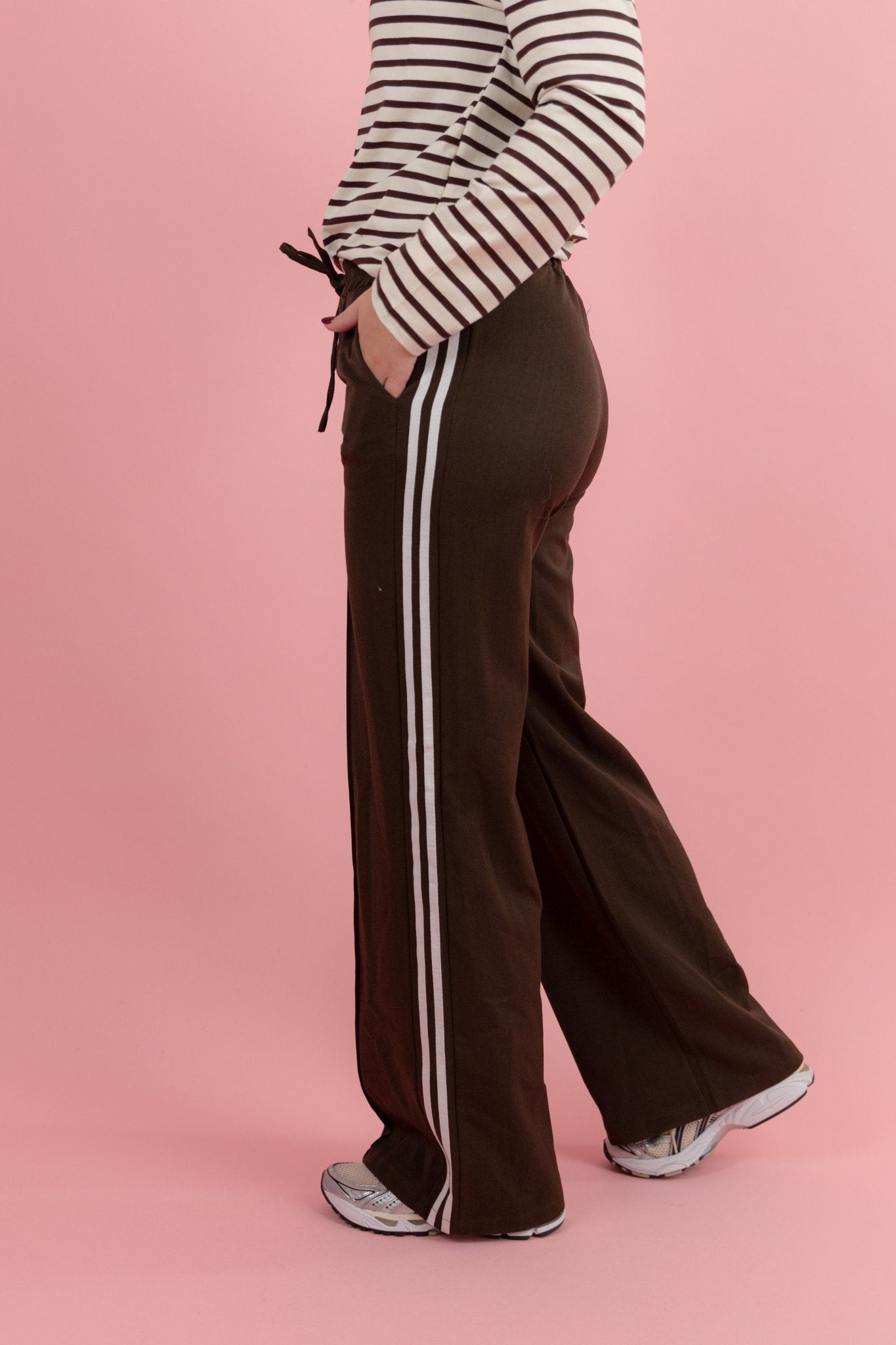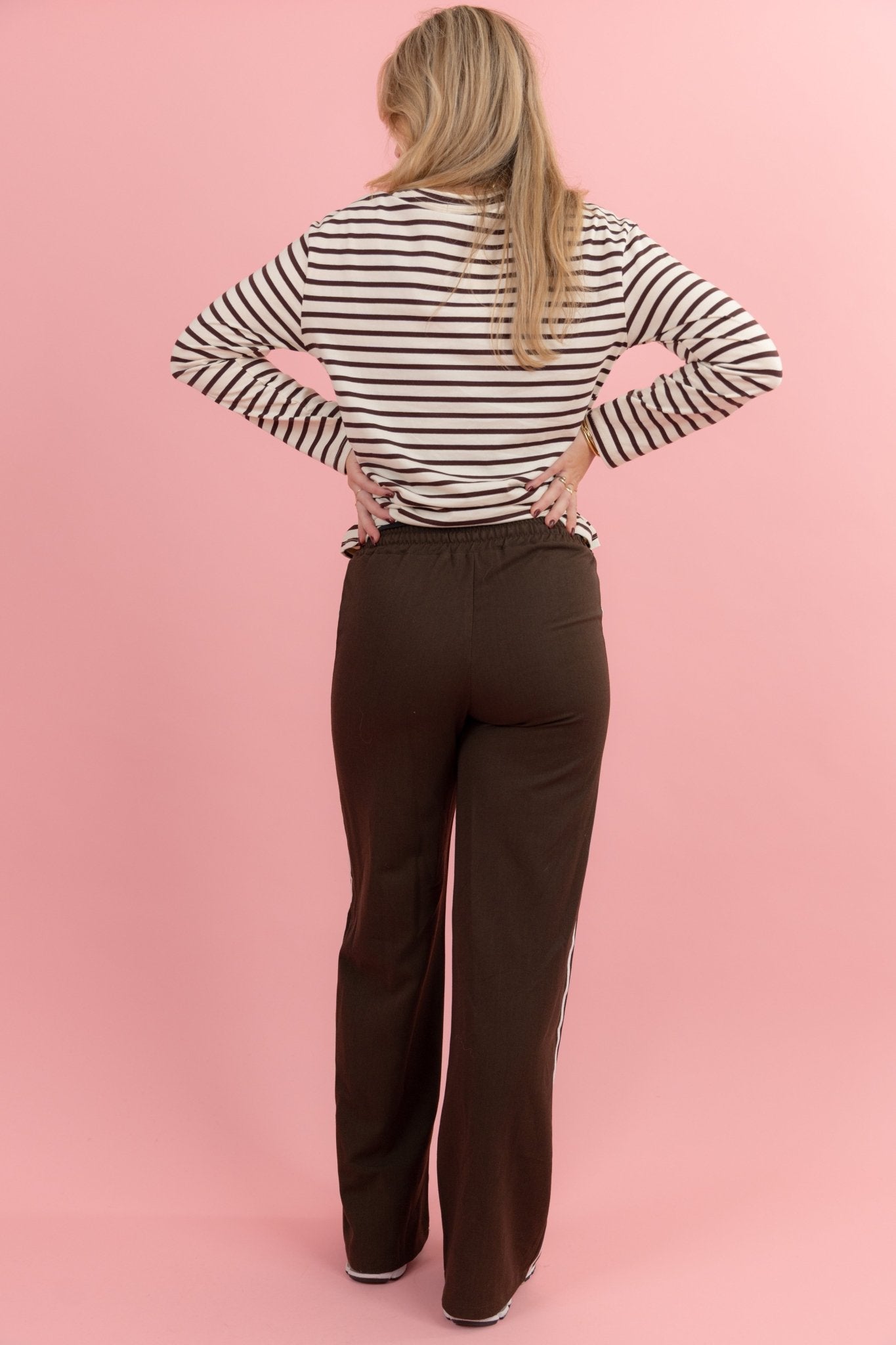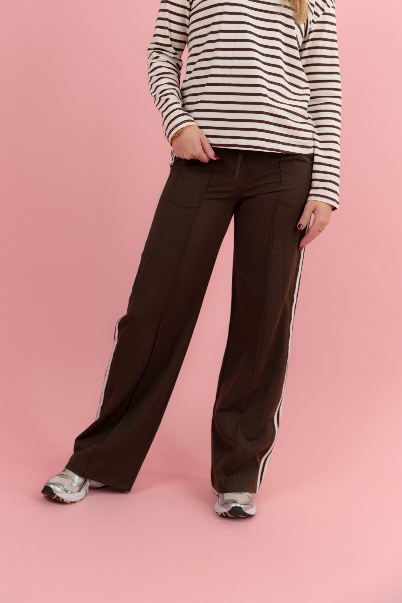 De Feline Pants in bruin is een comfortabele wide leg pantalon met een elastische tailleband en twee steekzakken. De zijkant van de broek is voorzien van strepen, wat hem een stoere touch geeft. Aan de voorkant zit een biesje, waardoor je de broek ook zeker netjes kunt dragen.