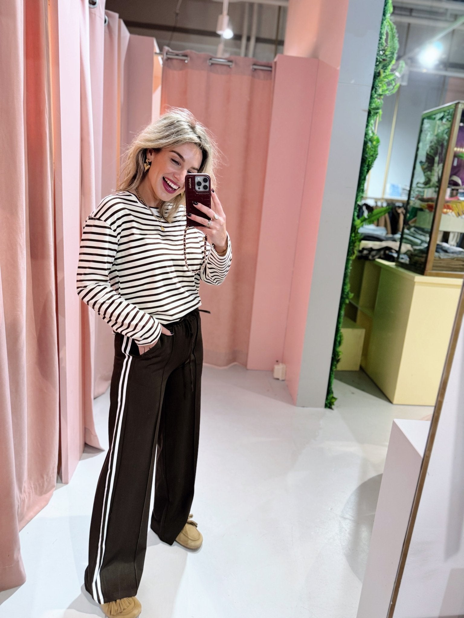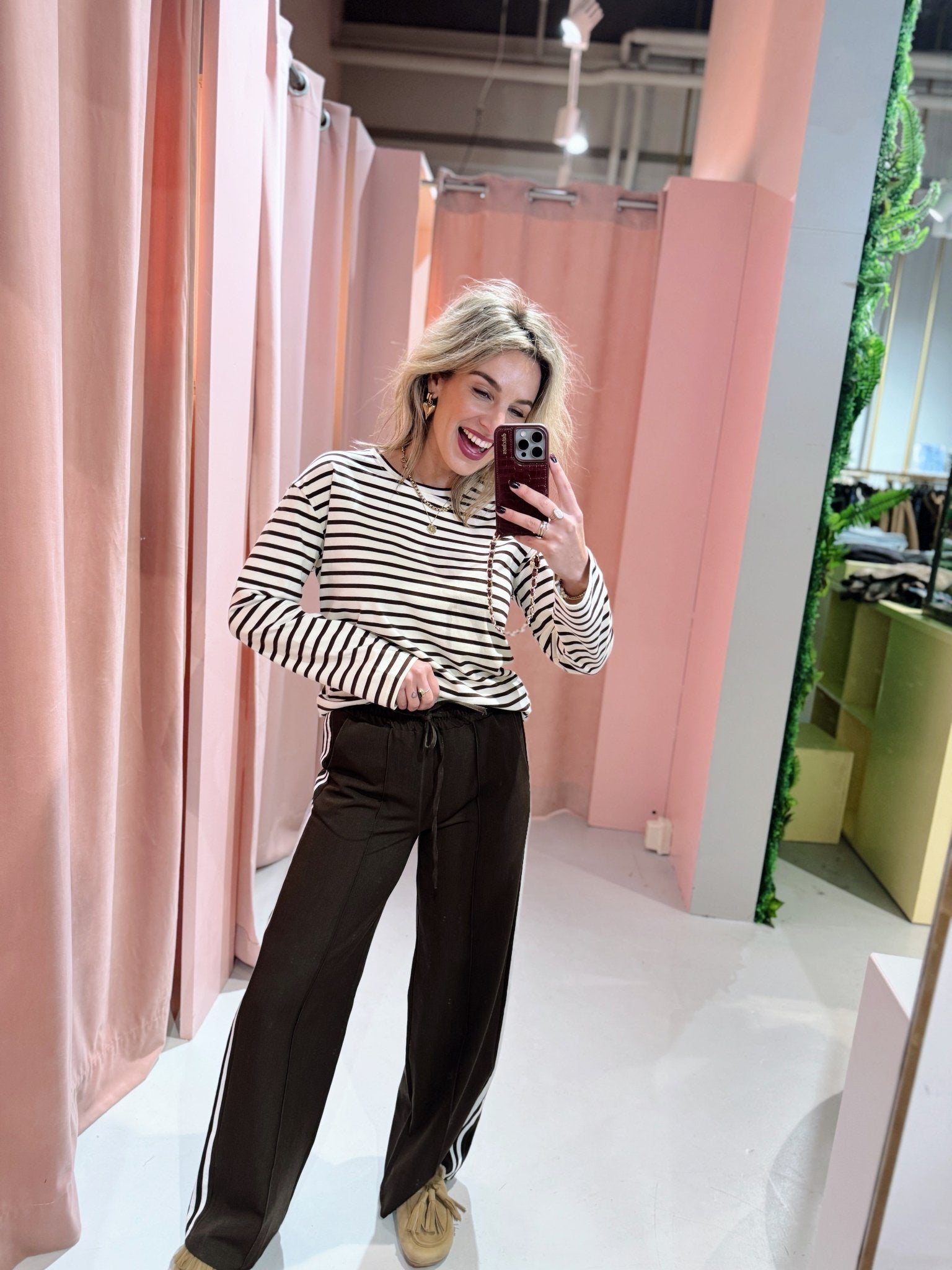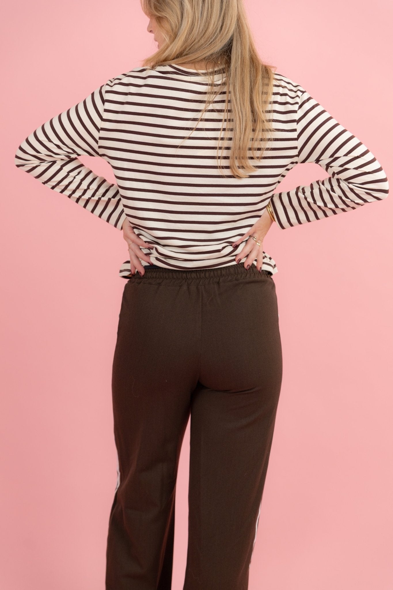 De Feline Pants in bruin is een comfortabele wide leg pantalon met een elastische tailleband en twee steekzakken. De zijkant van de broek is voorzien van strepen, wat hem een stoere touch geeft. Aan de voorkant zit een biesje, waardoor je de broek ook zeker netjes kunt dragen.