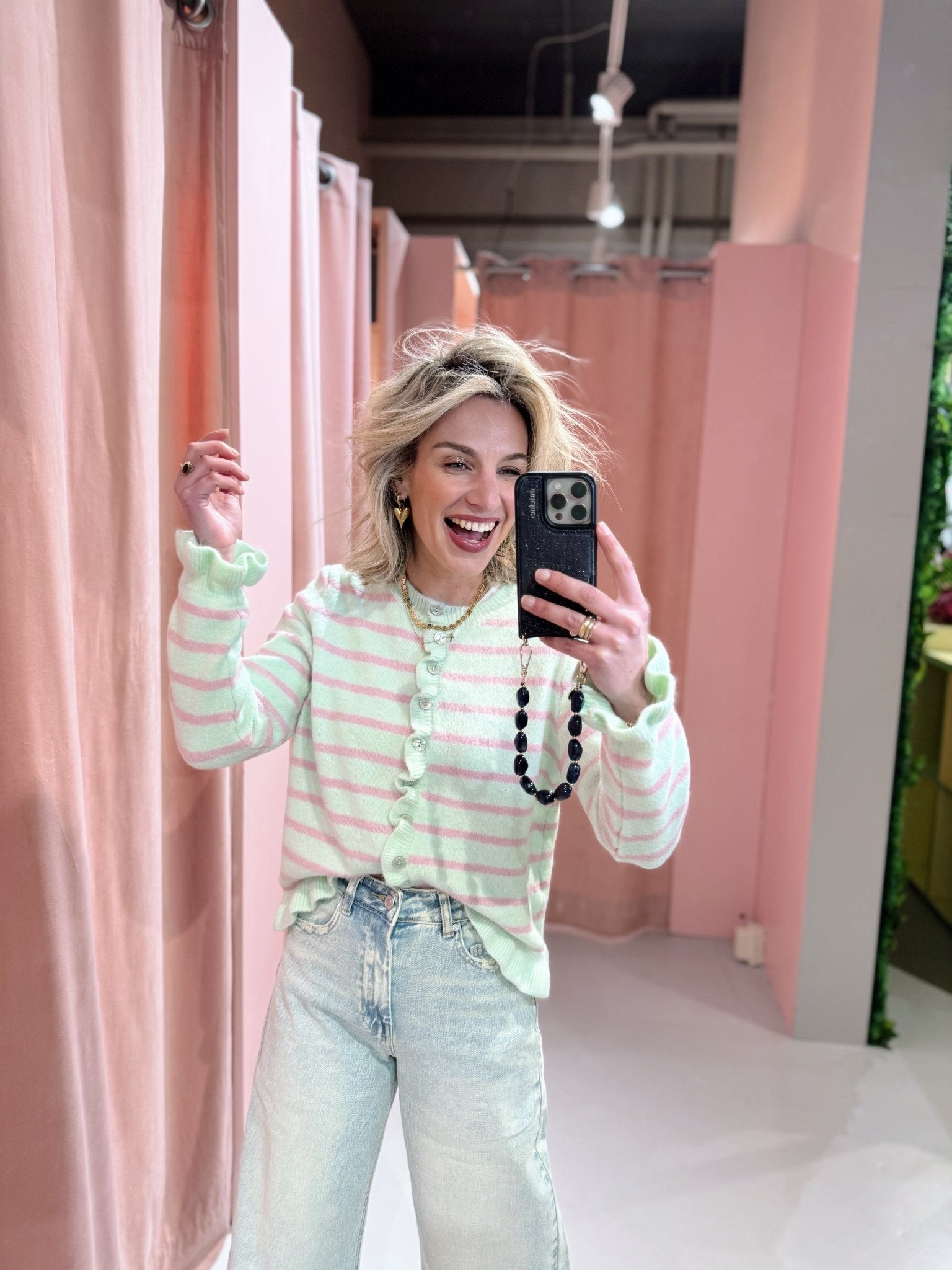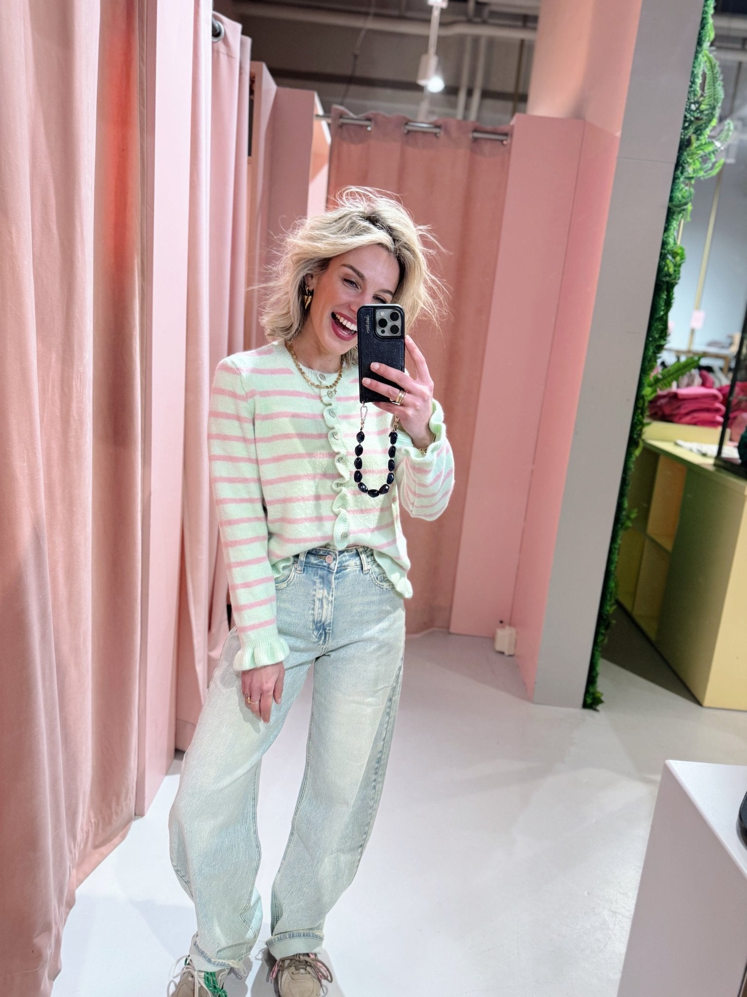 De Floor Cardigan in mint is gemaakt van een gebreid materiaal, waardoor hij heerlijk warm is! Het vest heeft lange mouwen met ruches, een ronde halslijn en is afgewerkt met holografische knopen aan de voorkant. Het ruffle randje langs de knopen en het streeppatroon geeft het vestje een speelse twist.