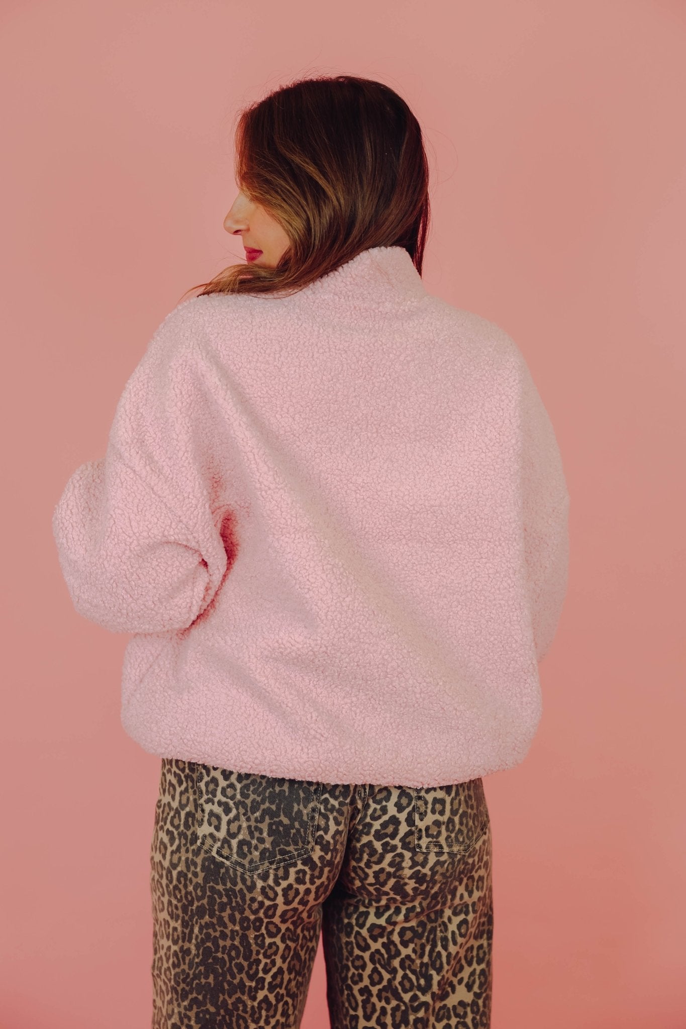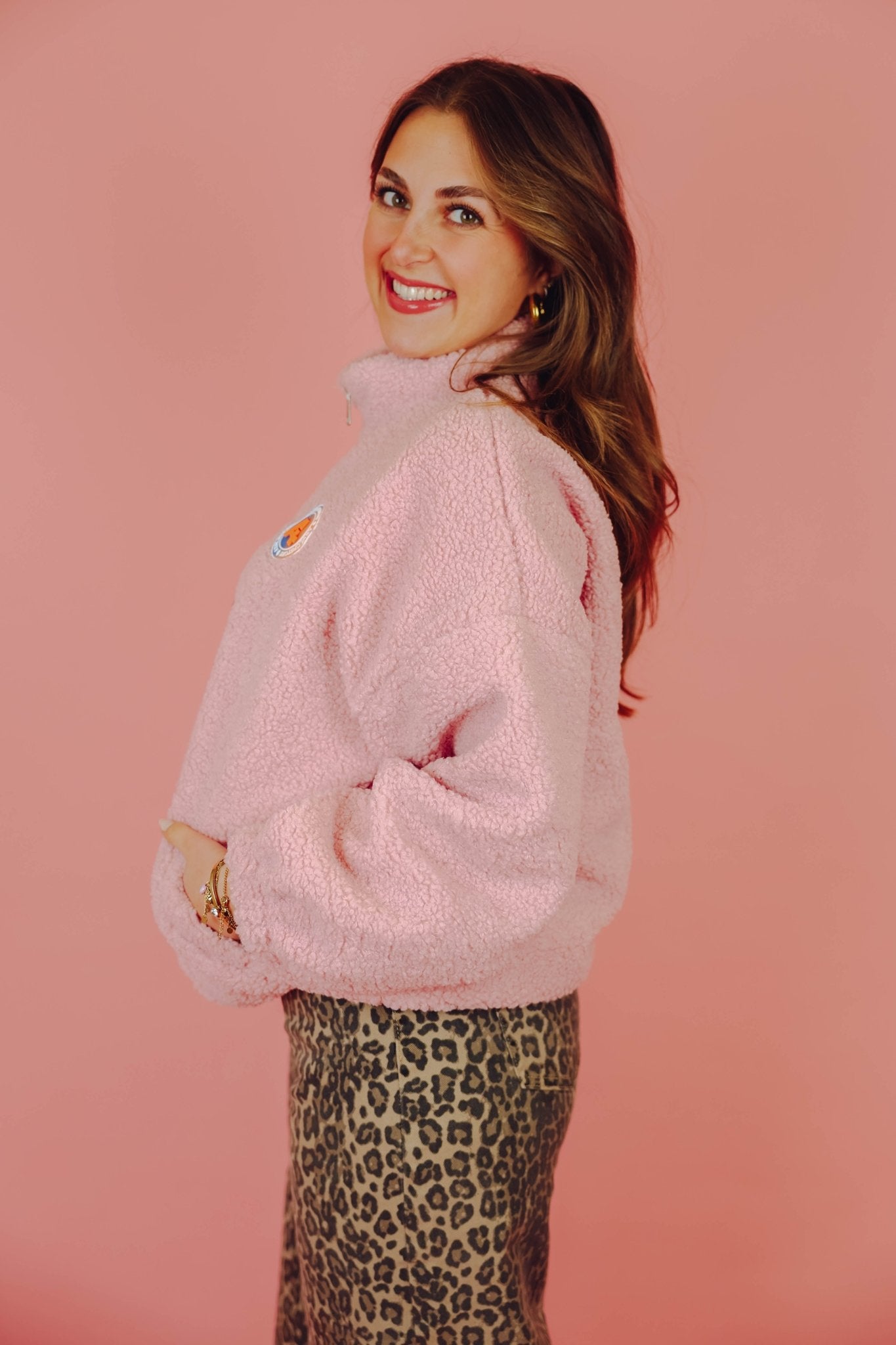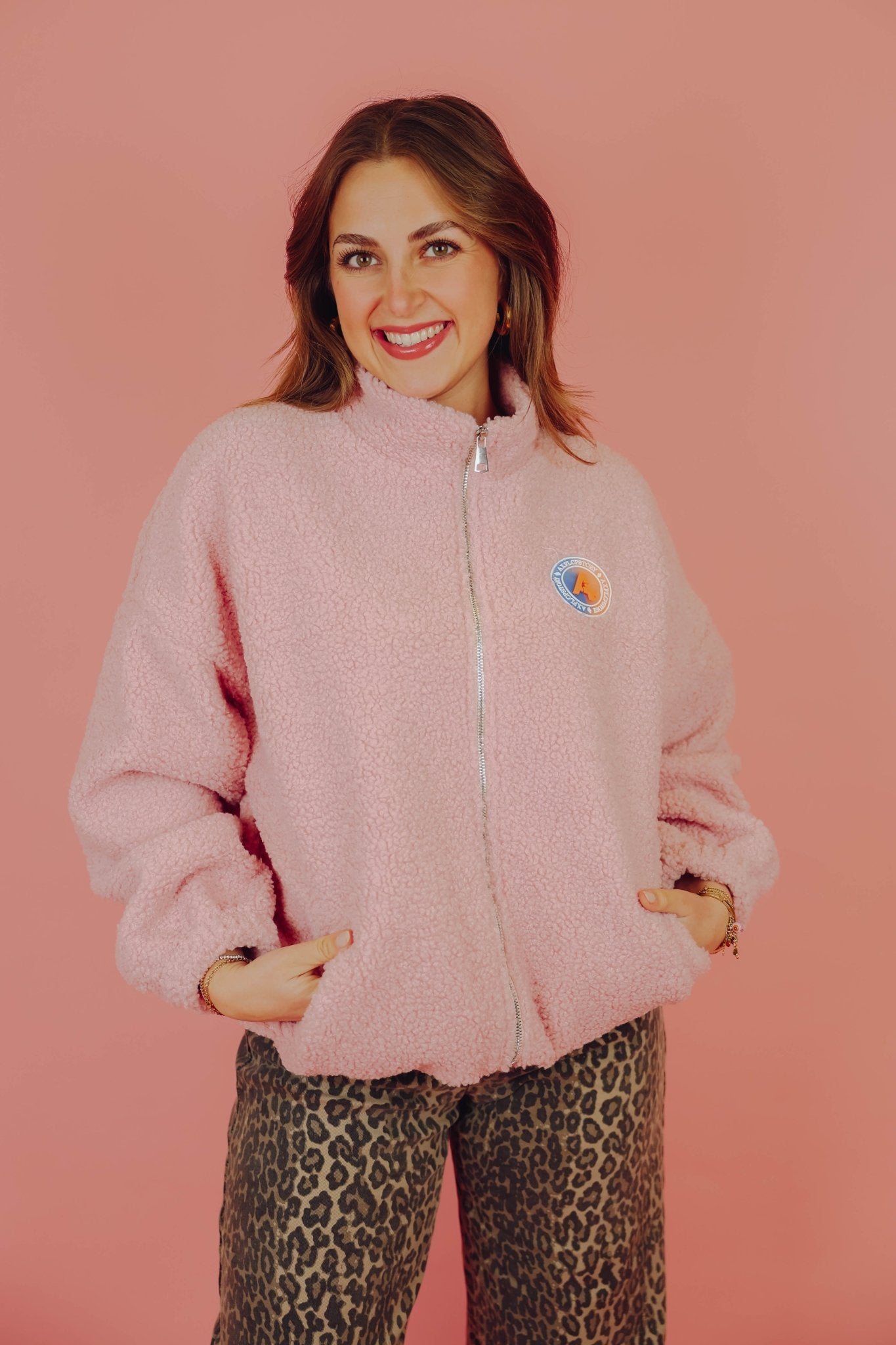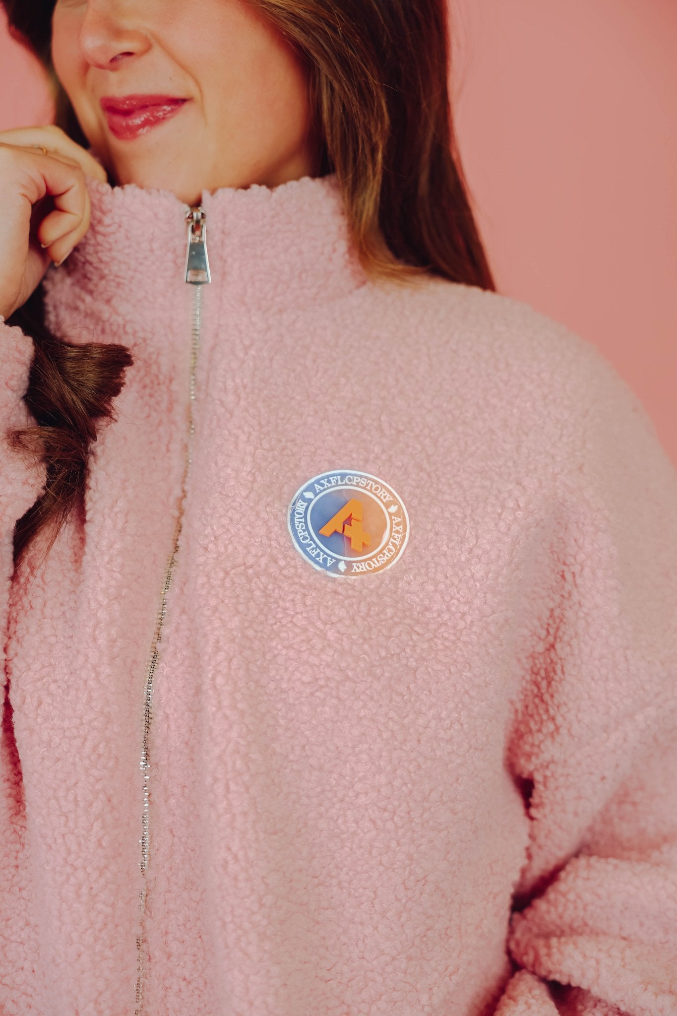 De Floris Cardigan in lichtroze is een oversized teddy vest met een hoge kraag. Het vest is gemaakt van een warme, zachte stof en heeft een suède-look binnenkant. De Floris Cardigan is voorzien van een embleem links op de borst, een ritssluiting en twee steekzakken.