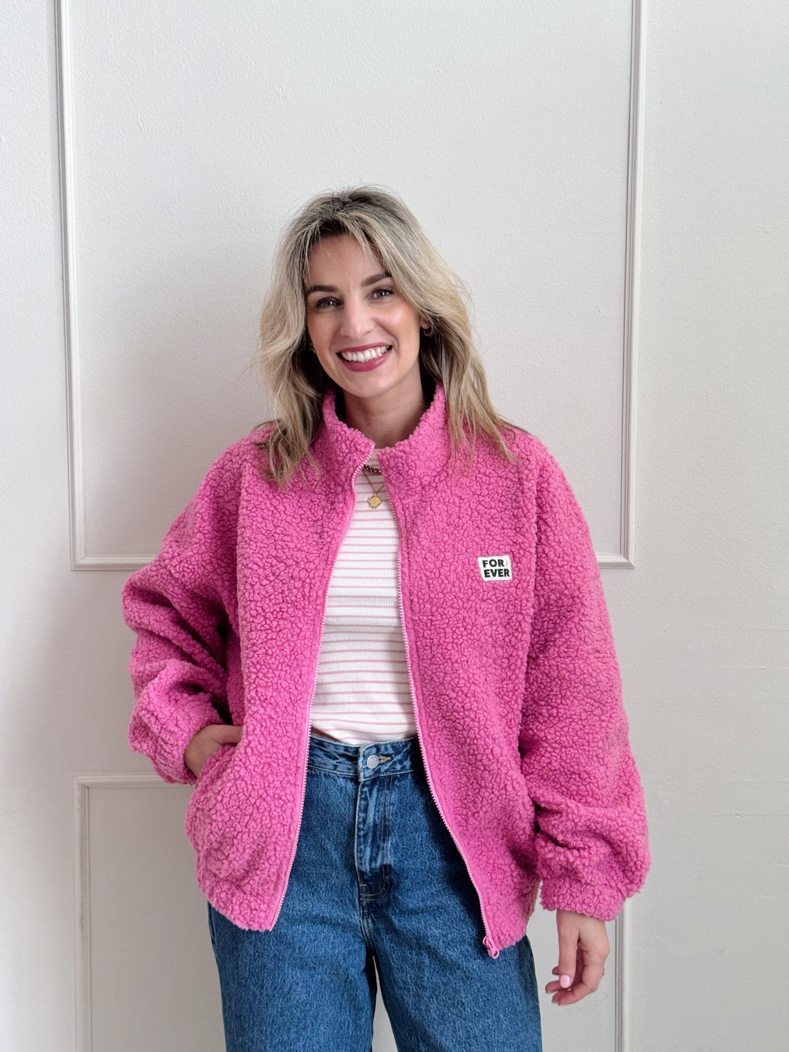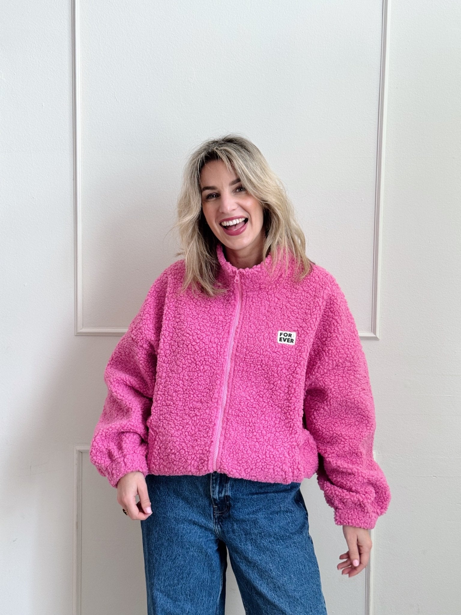 De Floris Cardigan in roze is een oversized teddy vest met een hoge kraag. Het vest is gemaakt van een warme, zachte stof en heeft een suède-look binnenkant. De Floris Cardigan is voorzien van een "forever HYPE!" patch links op de borst, een ritssluiting en twee steekzakken.