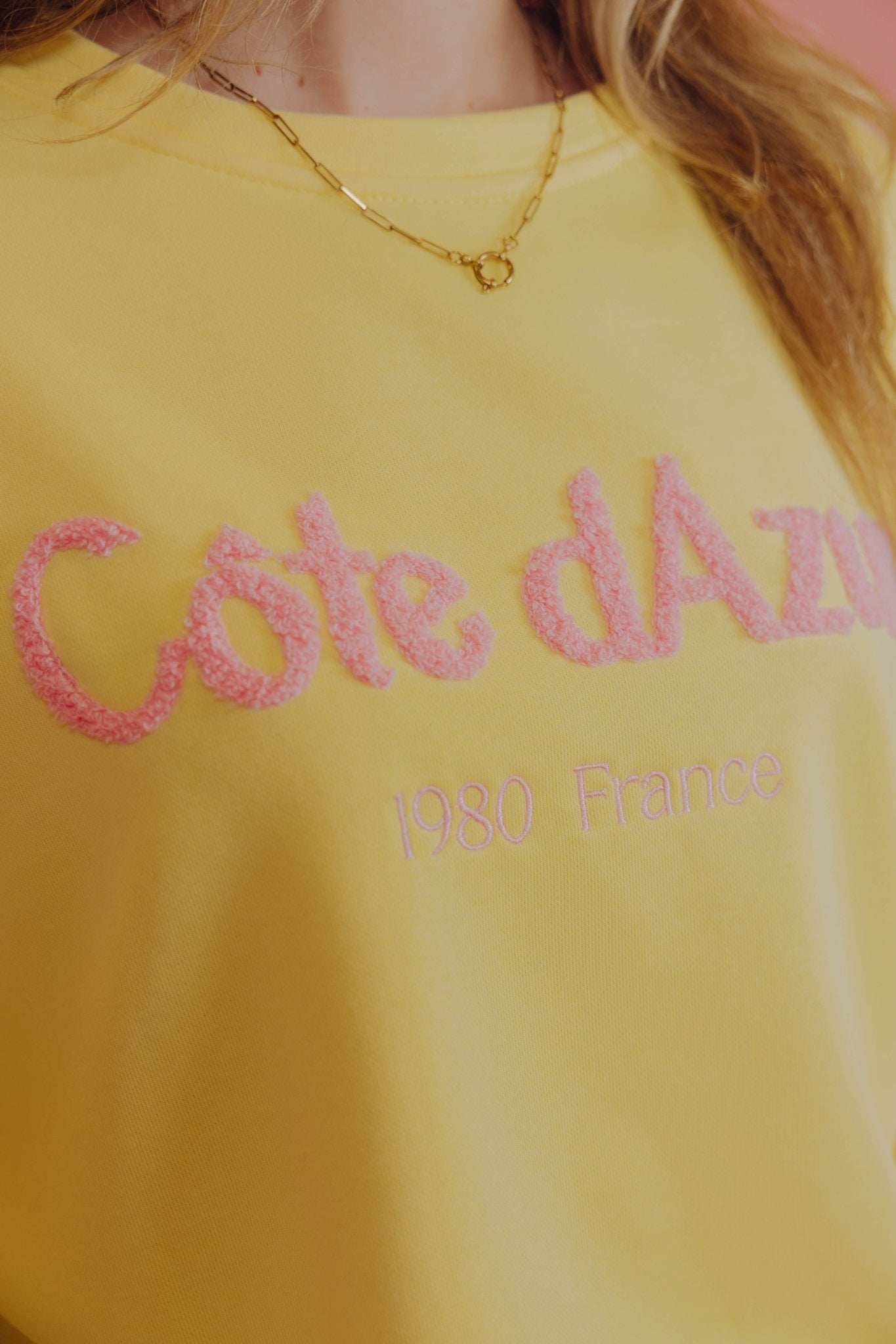 De France Sweater in geel is een oversized trui met lange mouwen en een ronde halslijn. De trui heeft een losse pasvorm en is voorzien van een opdruk met de tekst "Côte dAzur" op de voorkant.