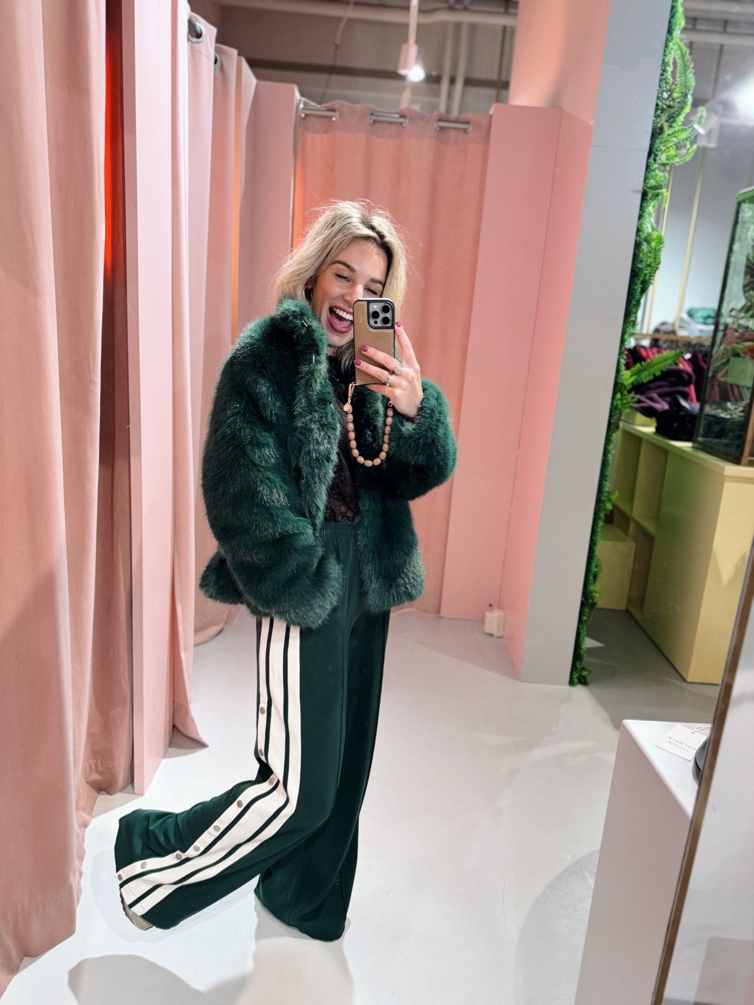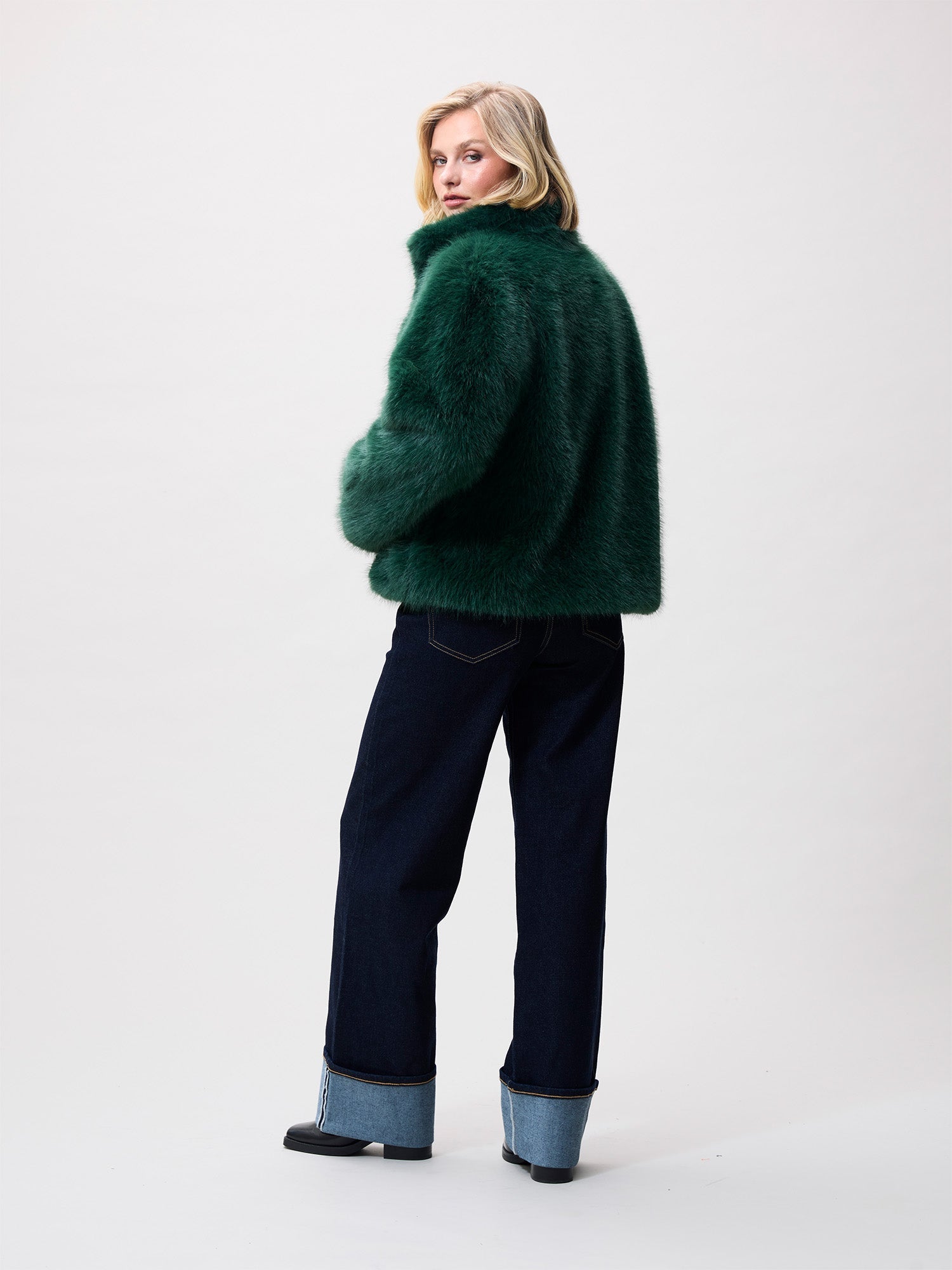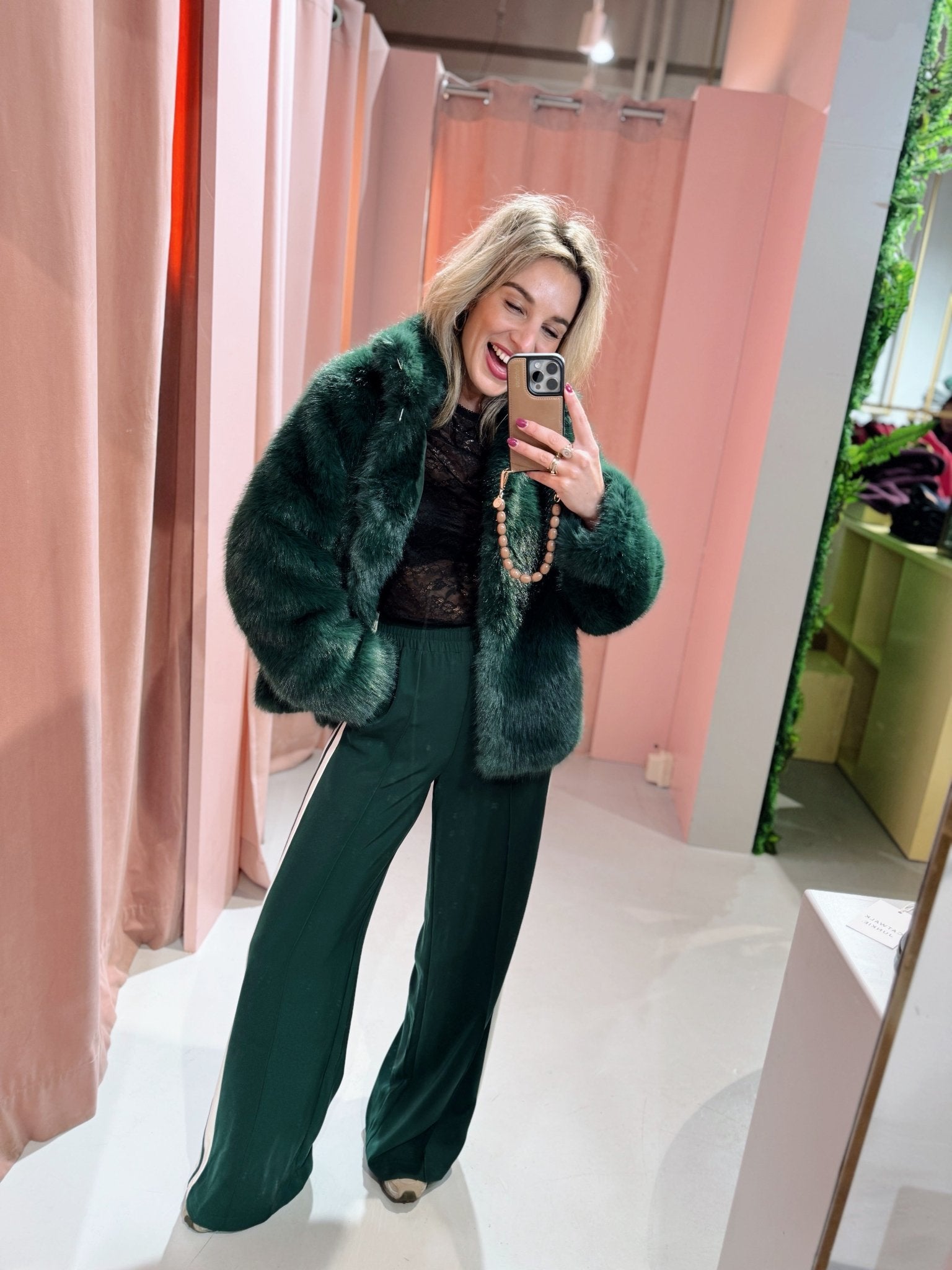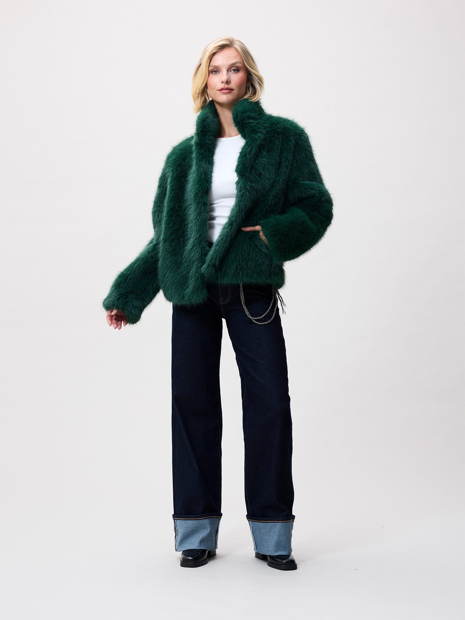 De Fur Jacket van Catwalk Junkie is een korte jas van zachte fake fur in een diepe donkergroene kleur. Het model heeft een hoge kraag en sluit met haakjes tot aan de hals. Dankzij de steekzakken en het korte silhouet combineert deze jas luxe met comfort. Een opvallend item dat elke outfit direct afmaakt.