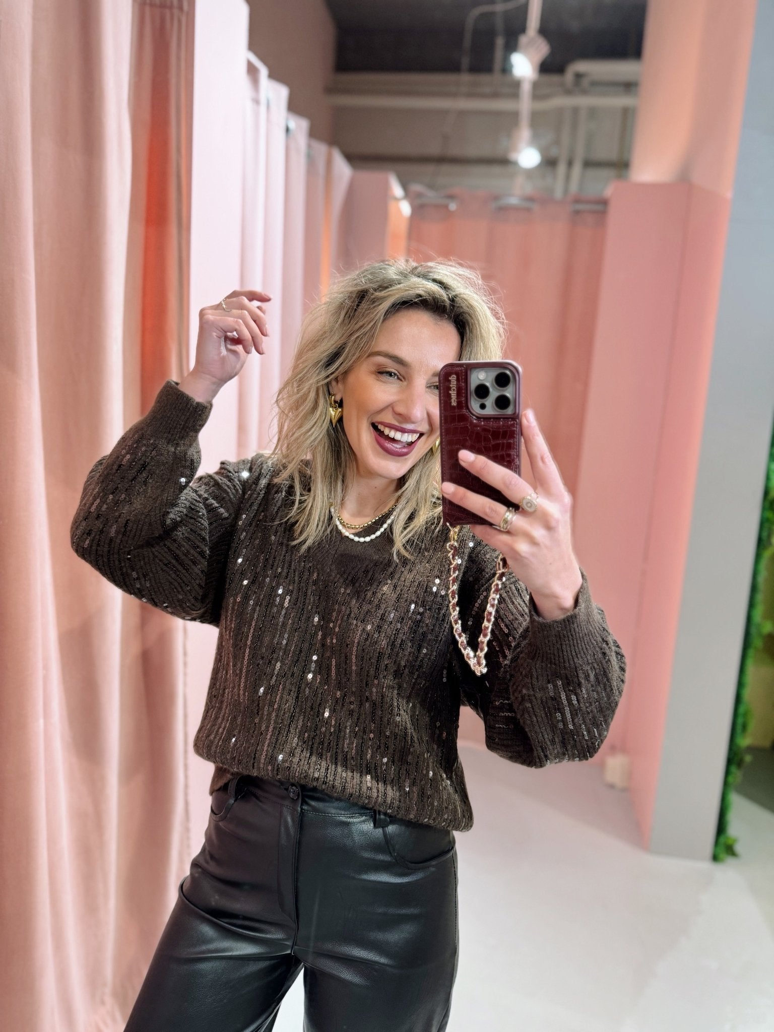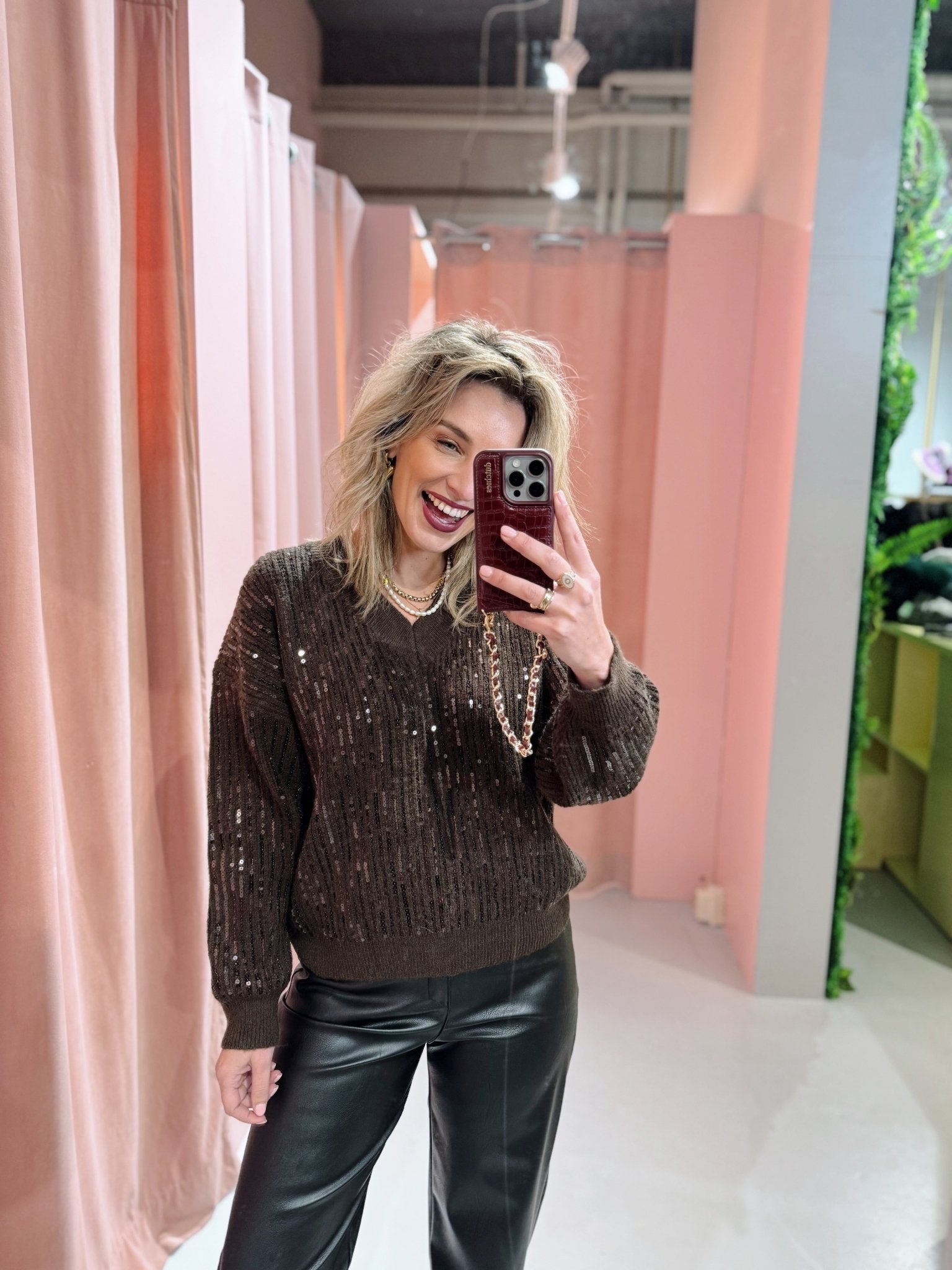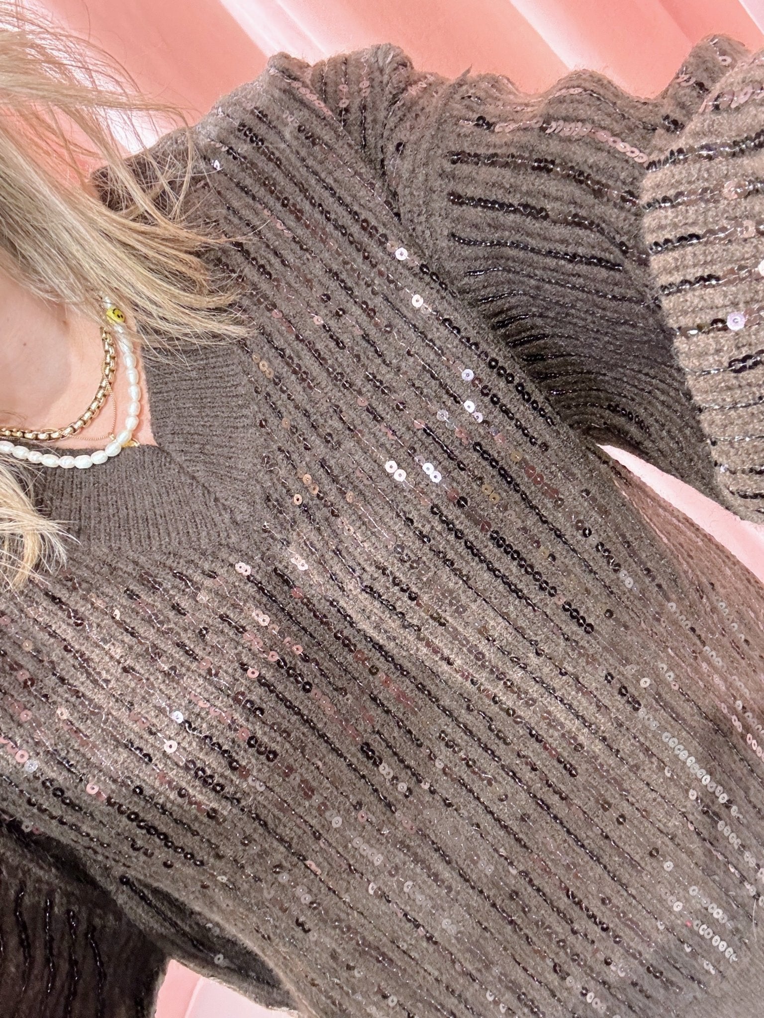 De Gavi Sparkle Knit in bruin is gemaakt van een gebreid materiaal, waardoor hij heerlijk warm is. De trui heeft lange mouwen, een V-hals en is voorzien van pailletten.