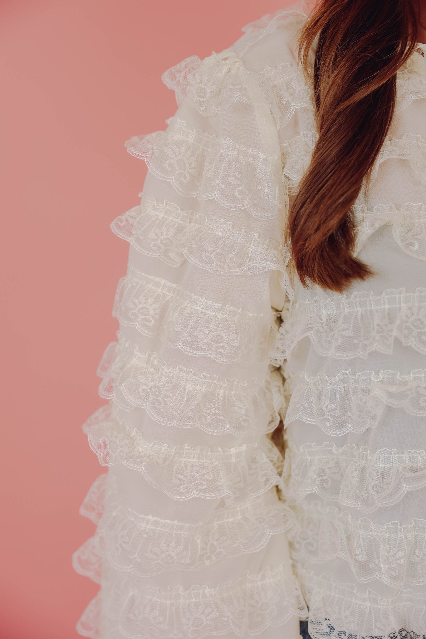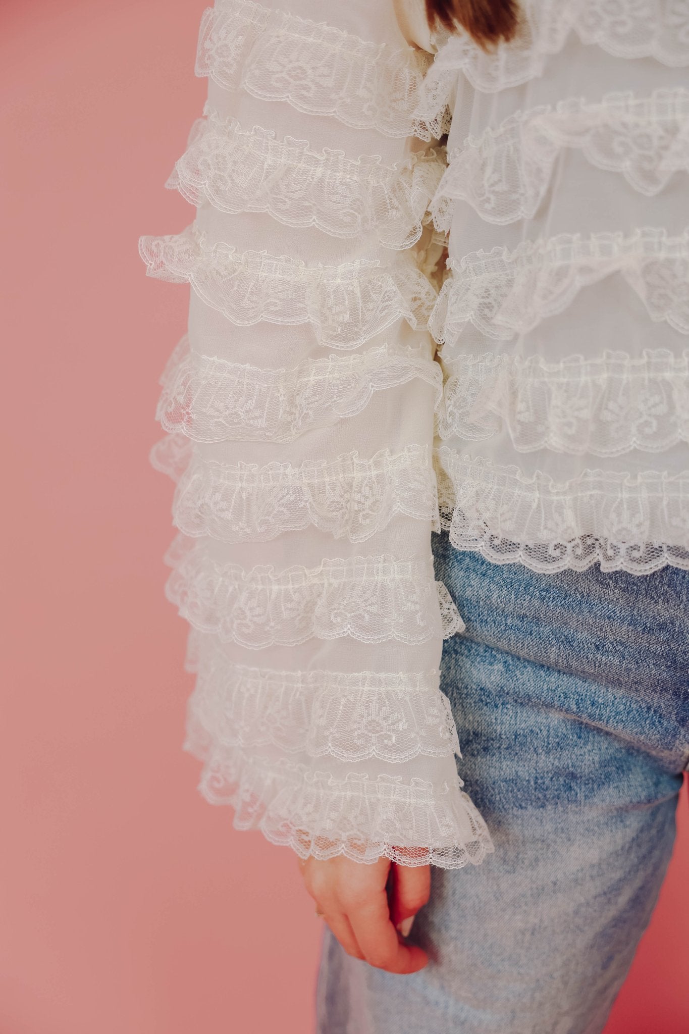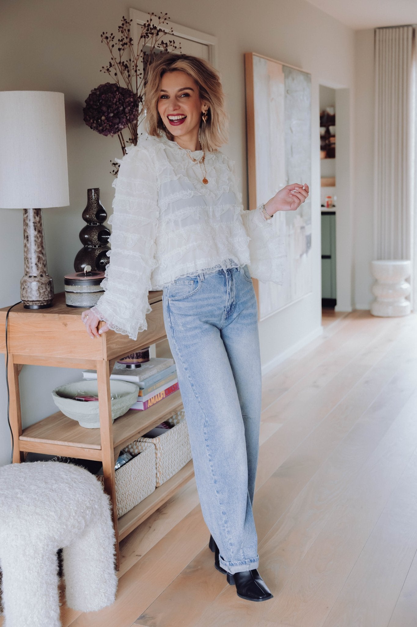 De Gigi Blouse in off white is een luchtige kanten blouse voorzien van ruches. De blouse is voorzien van een kanten kraagje en een knoopsluiting in de nek. Dit blousje heeft een kort model en lange, wijde mouwen.