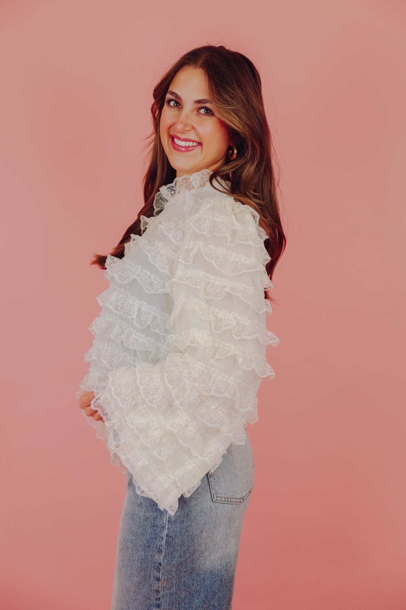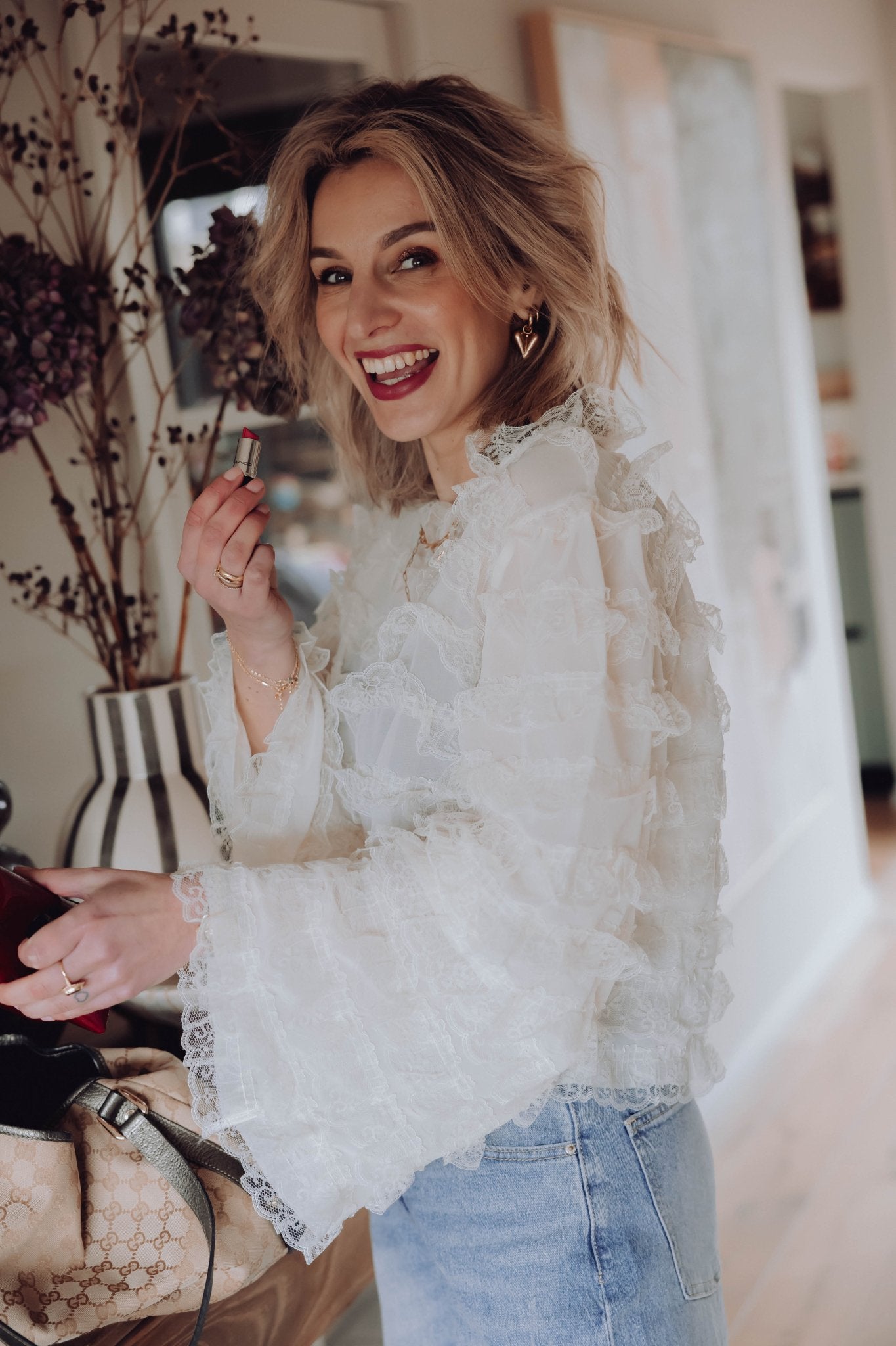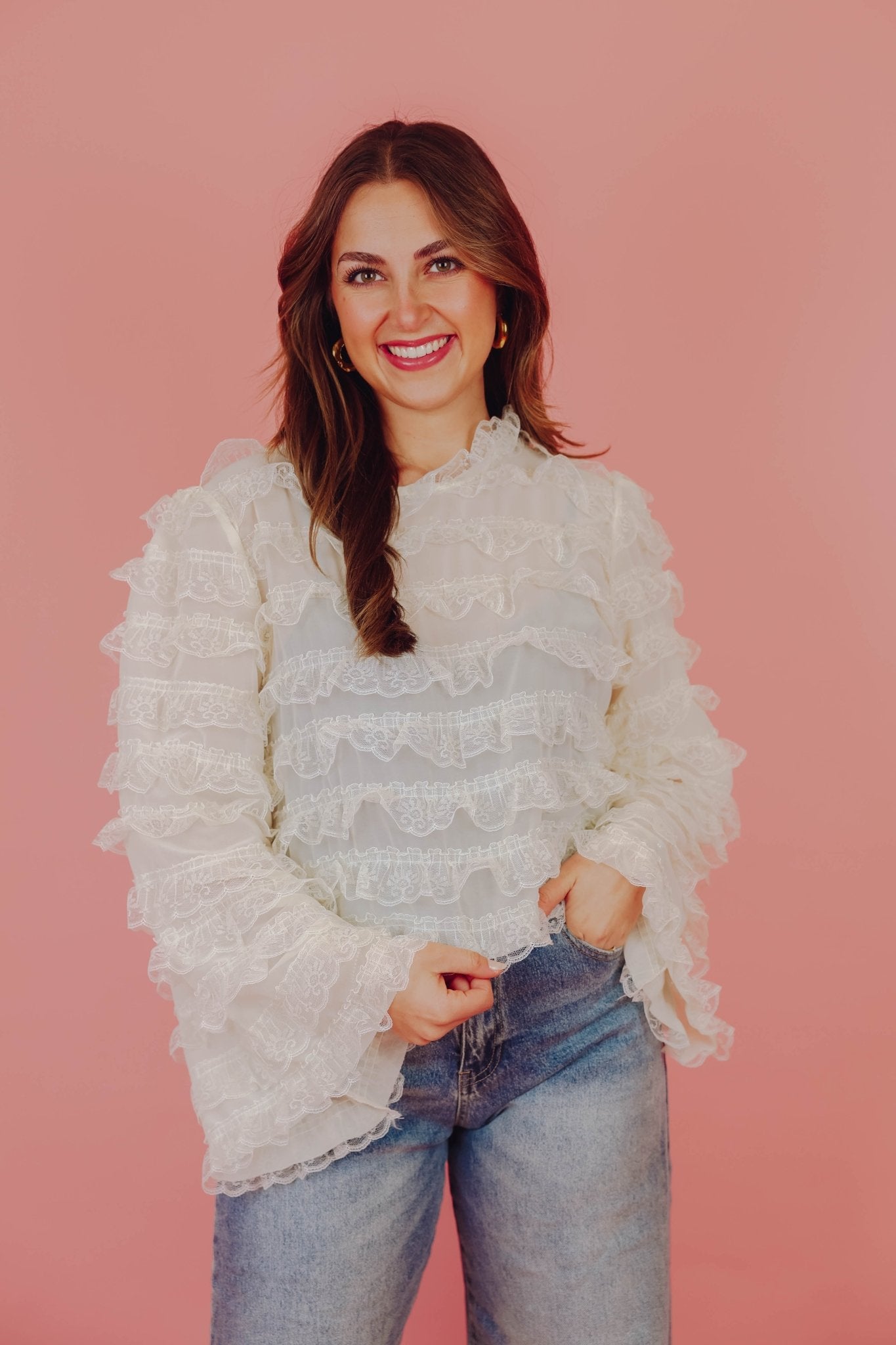 De Gigi Blouse in off white is een luchtige kanten blouse voorzien van ruches. De blouse is voorzien van een kanten kraagje en een knoopsluiting in de nek. Dit blousje heeft een kort model en lange, wijde mouwen.