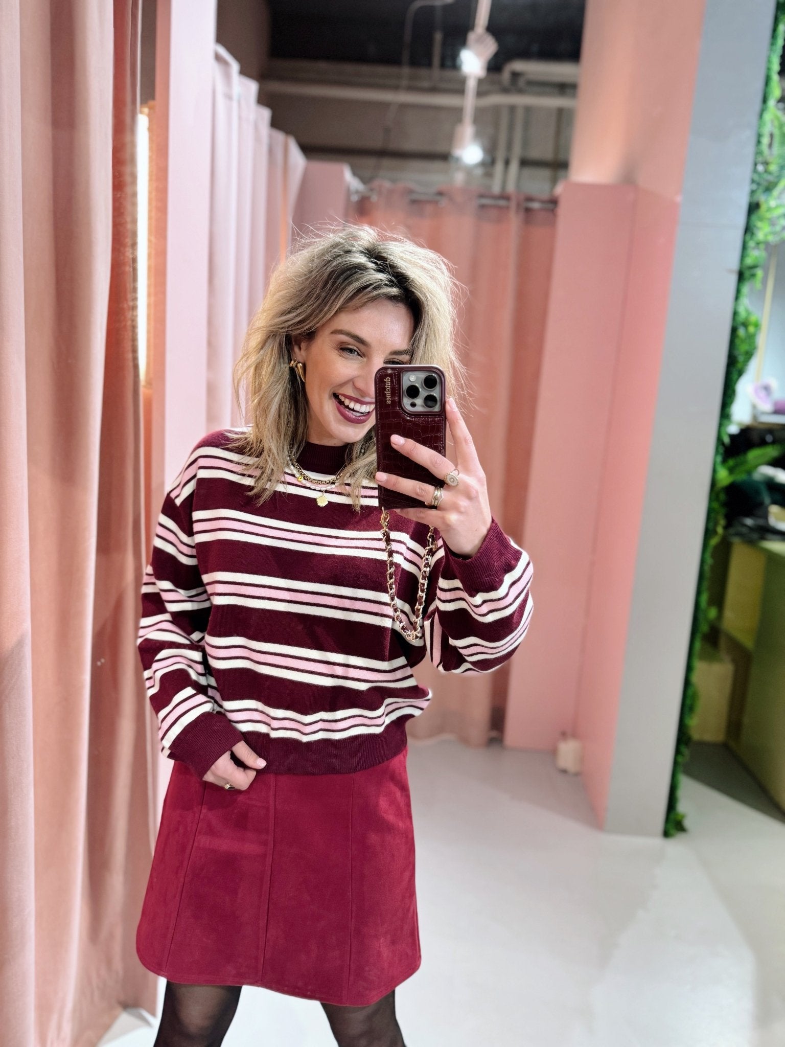 De Gigi Sweater in bordeaux is gemaakt van een gebreid materiaal, waardoor hij heerlijk warm is! De trui heeft lange mouwen en een ronde halslijn en is voorzien van een streep patroon.