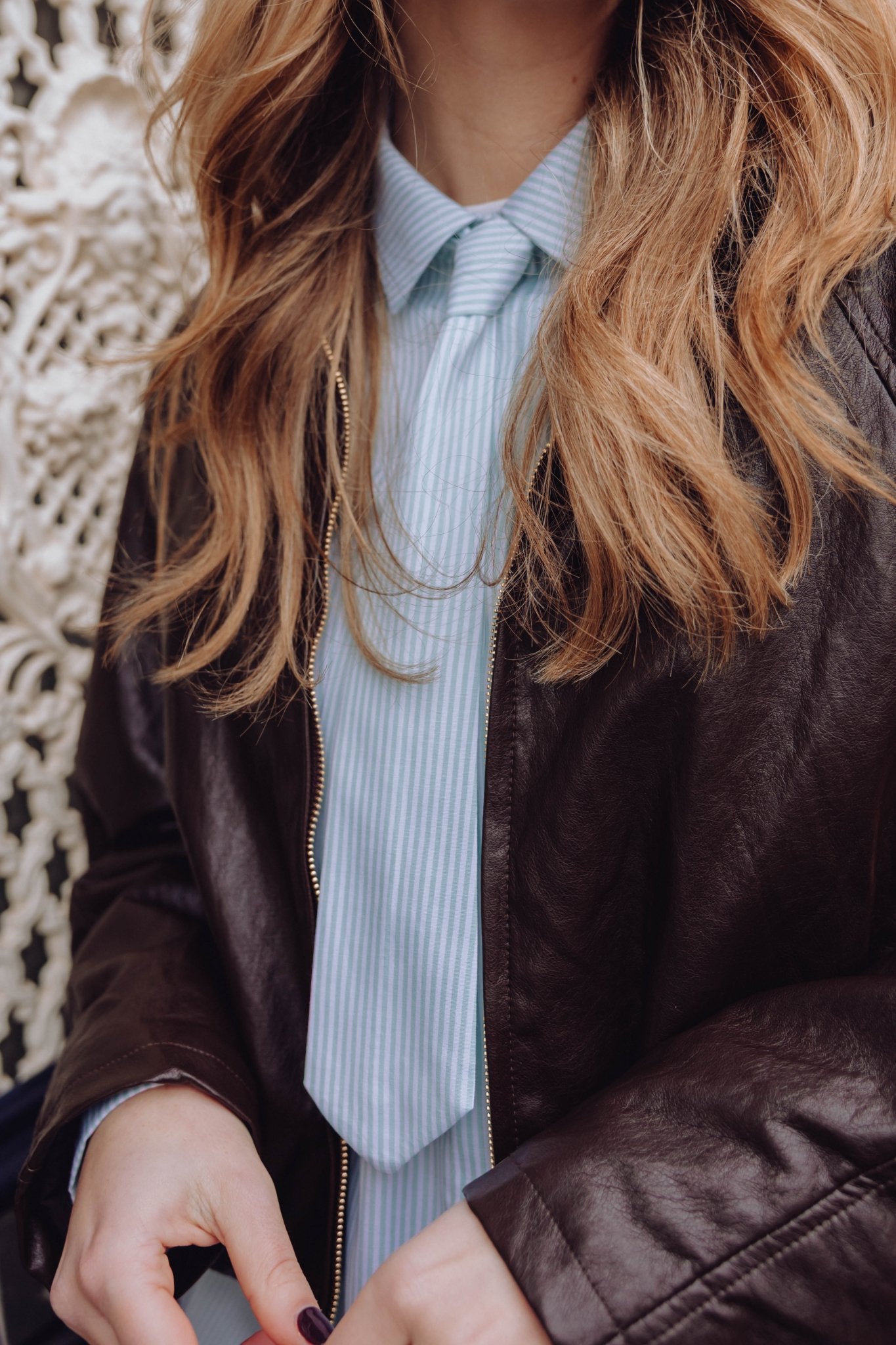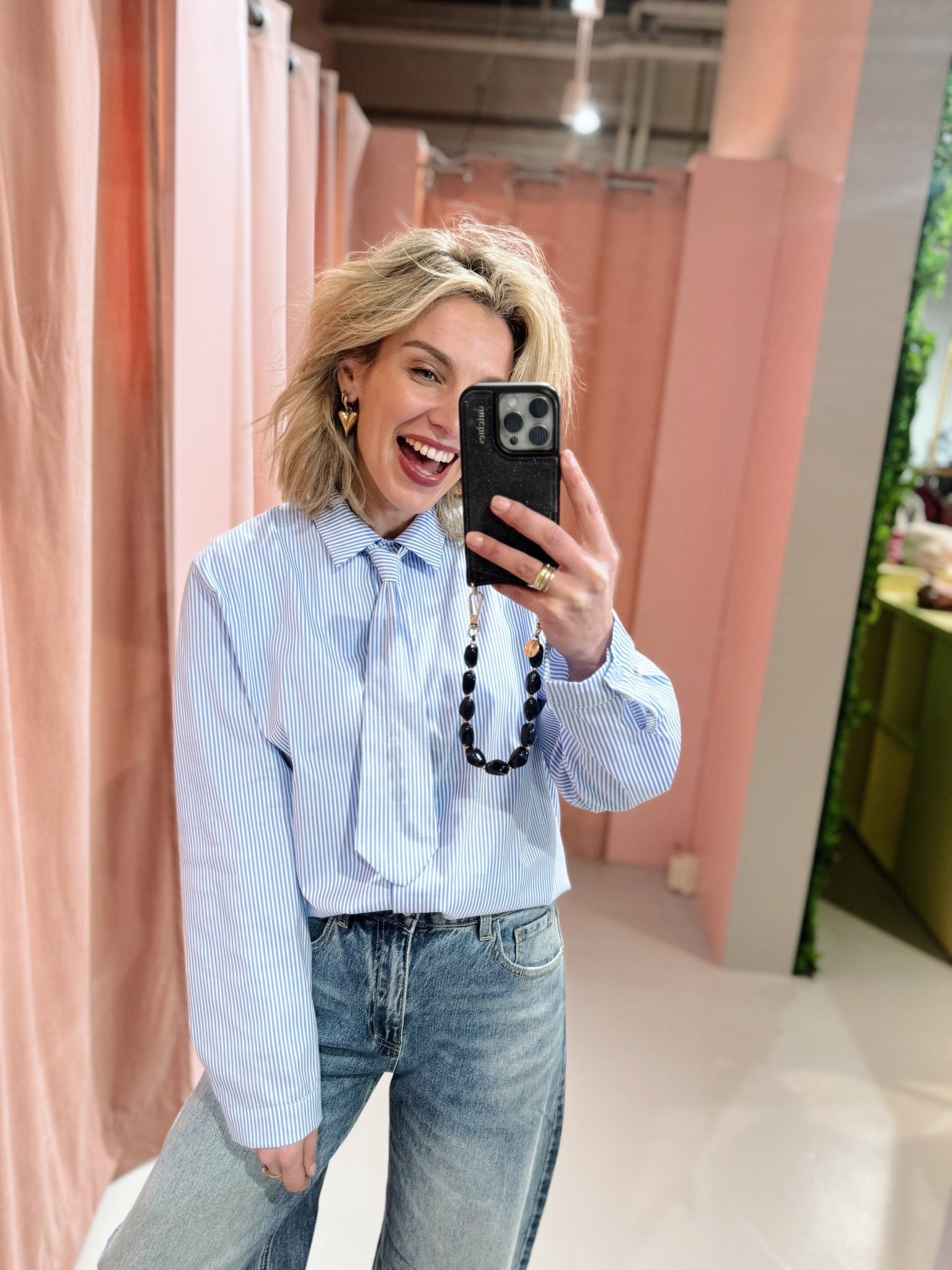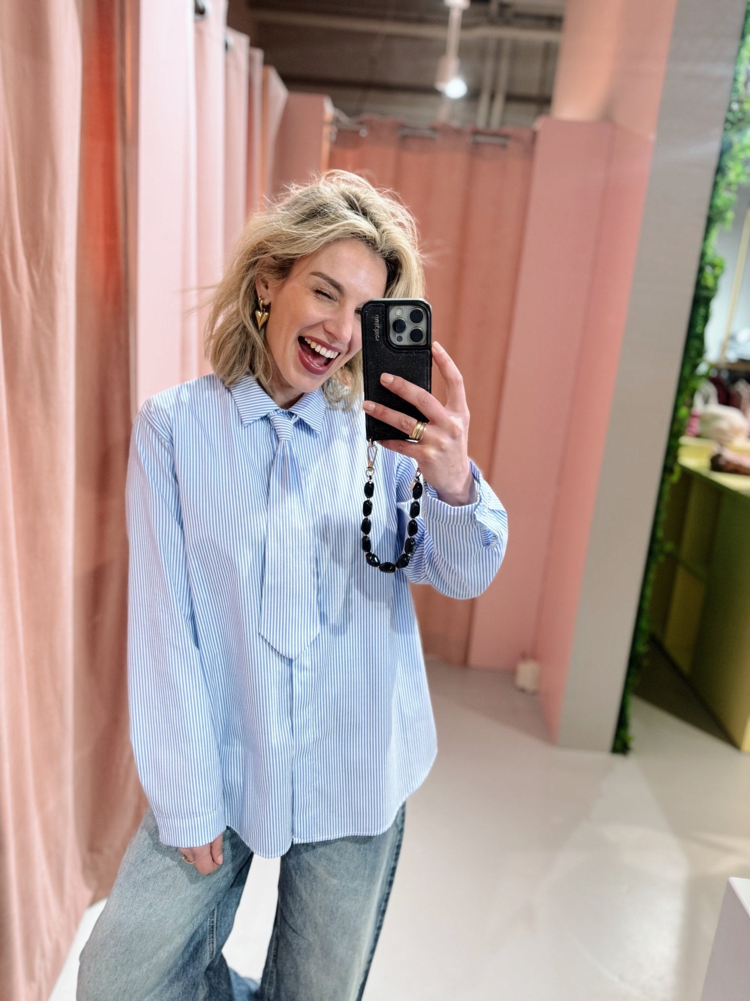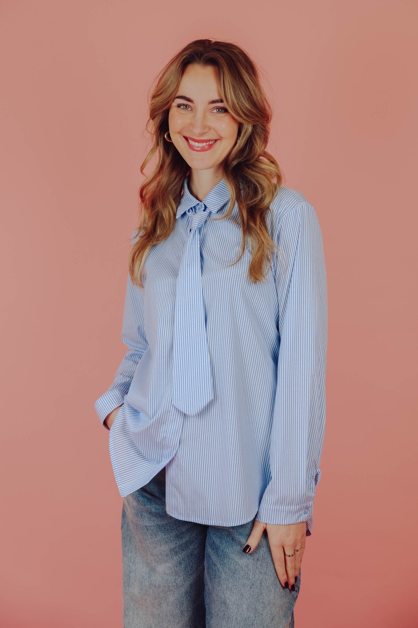 De Gina Blouse in lichtblauw is een luchtige blouse met een streep patroon. De blouse is voorzien van een kraagje en een knoopsluiting aan de voorkant. Doordat de blouse met een bijpassende stropdas komt, is hij net even anders dan een basic blouse.
