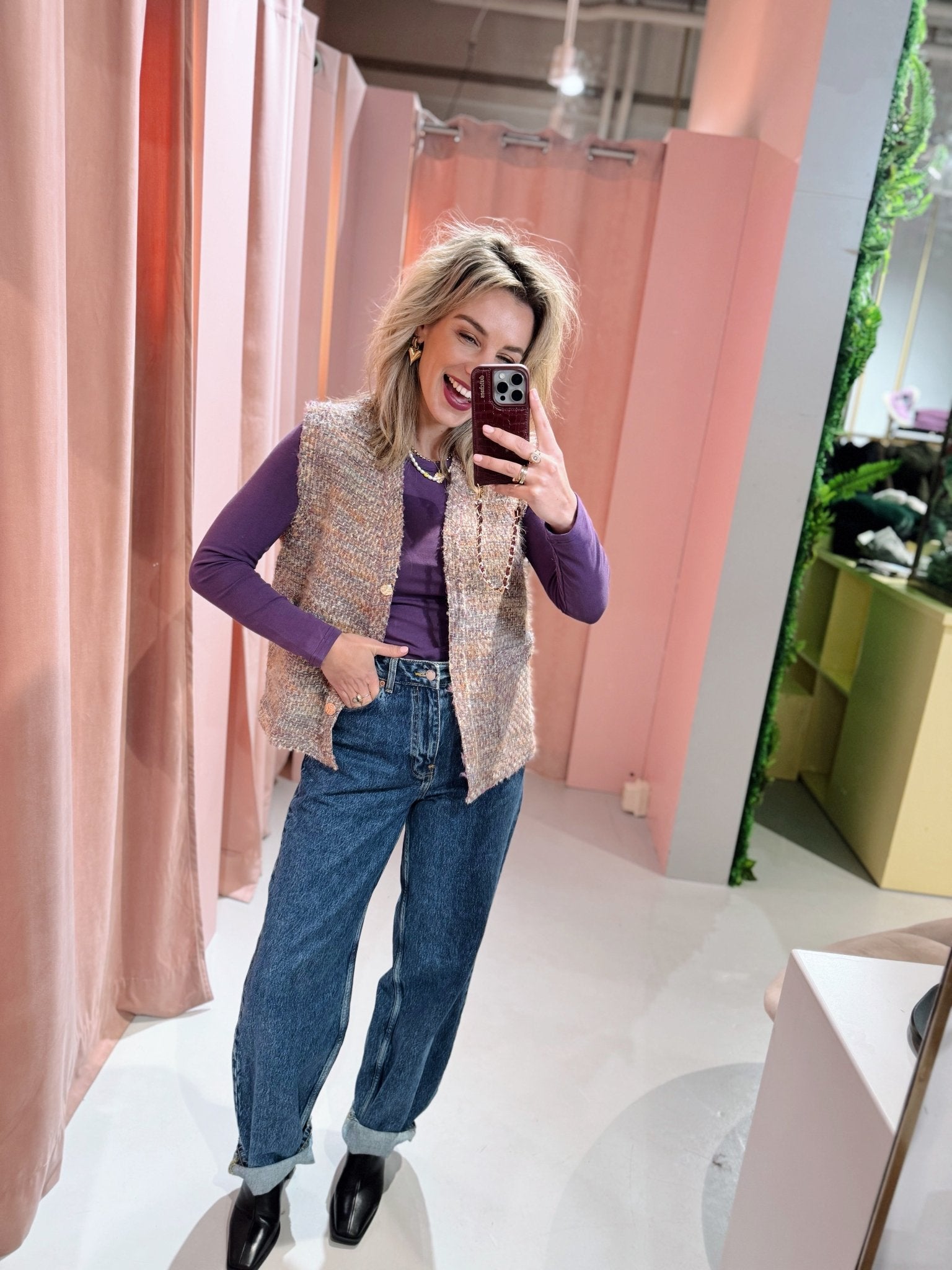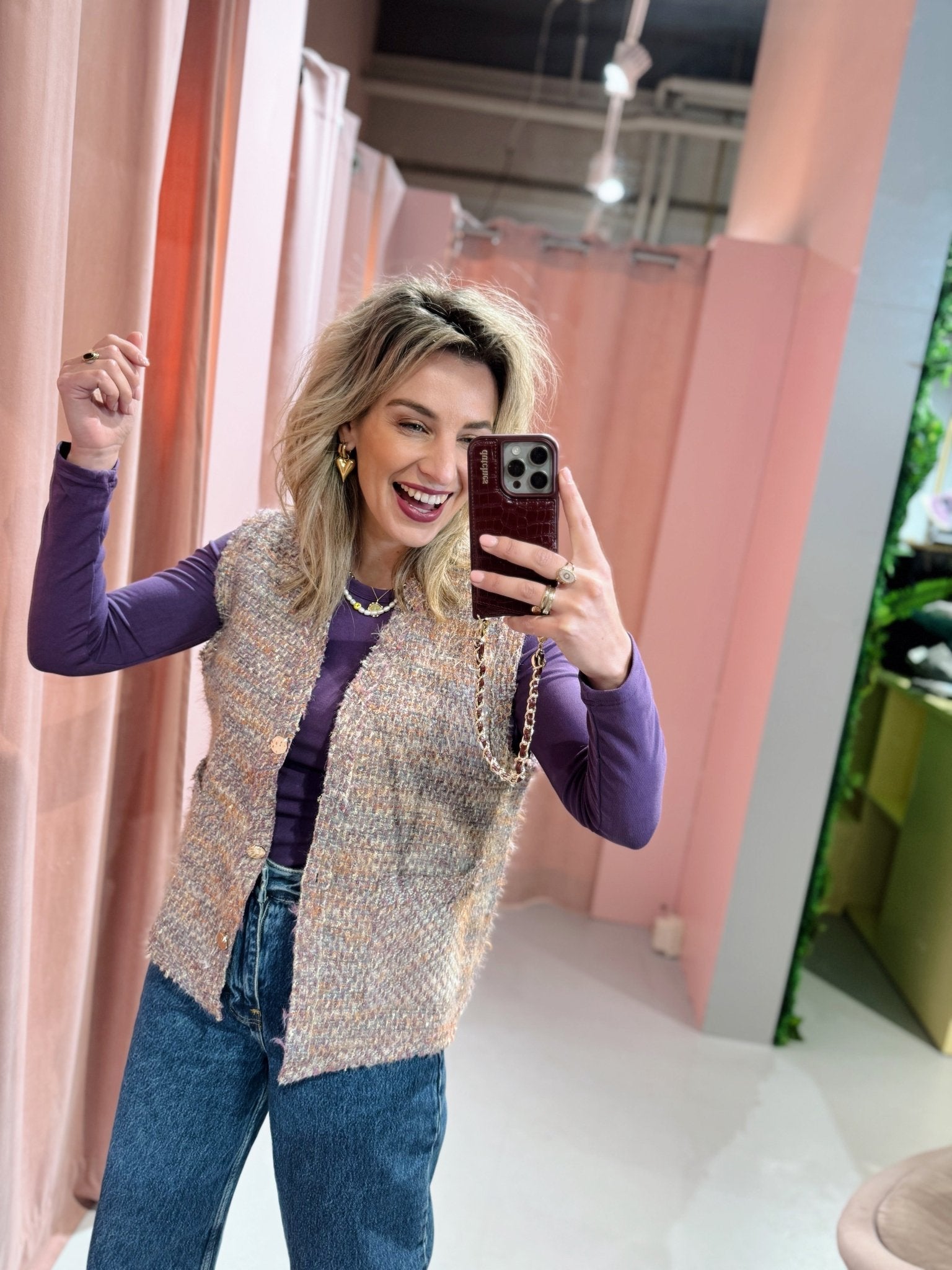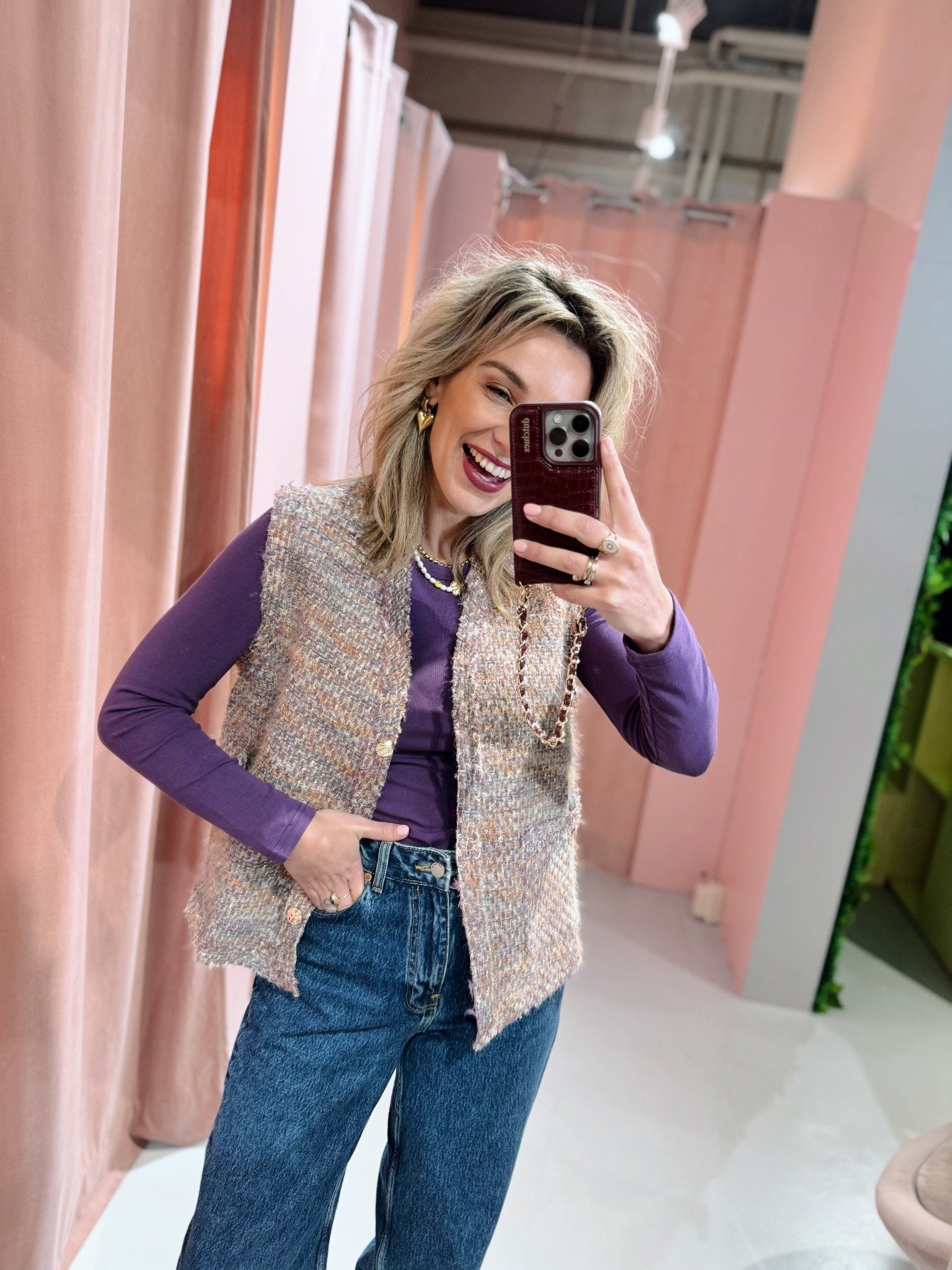 Het Givana Gilet in paars is gemaakt van een zacht materiaal en is hierdoor perfect voor het najaar. Het gilet is voorzien van twee zakken en een knoopsluiting met gouden knopen aan de voorkant.
