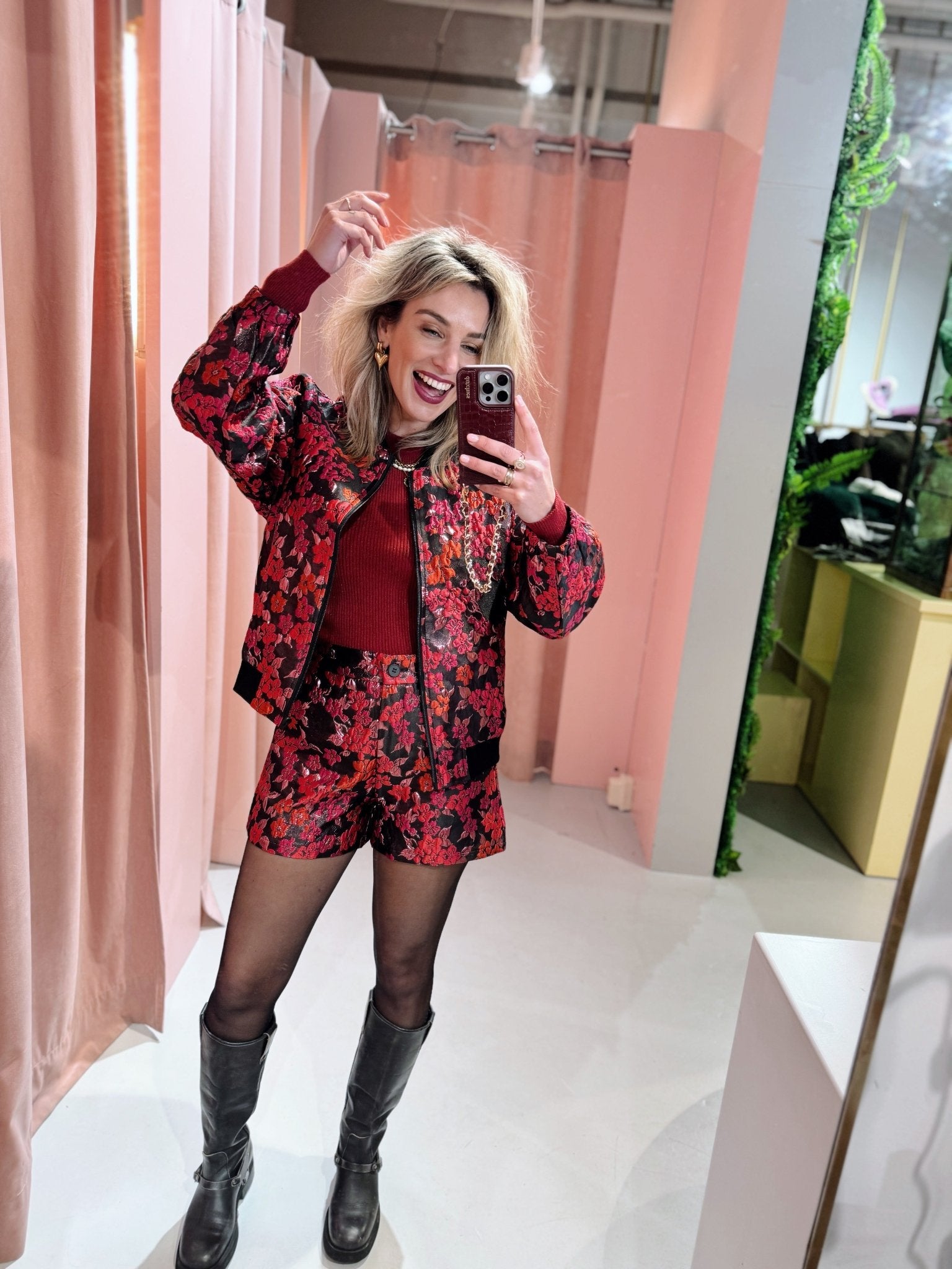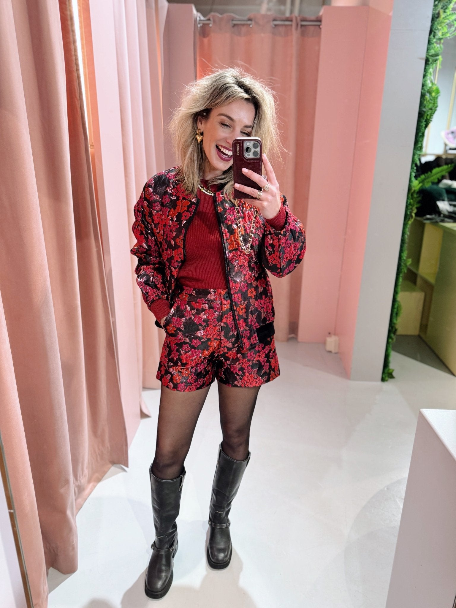 De Hanne Short in roze is gemaakt van een metallic jacquard stof, waardoor hij een échte eyecatcher is! De short is voorzien van twee steekzakken en twee nep zakjes op de achterkant. Doordat de short een elastische taille heeft aan de achterkant, sluit het broekje erg mooi aan. Bovendien is de short gemakkelijk te sluiten door middel van een knoopsluiting. Combineer de Hanne Short met de Hanne Bomber voor een complete set!