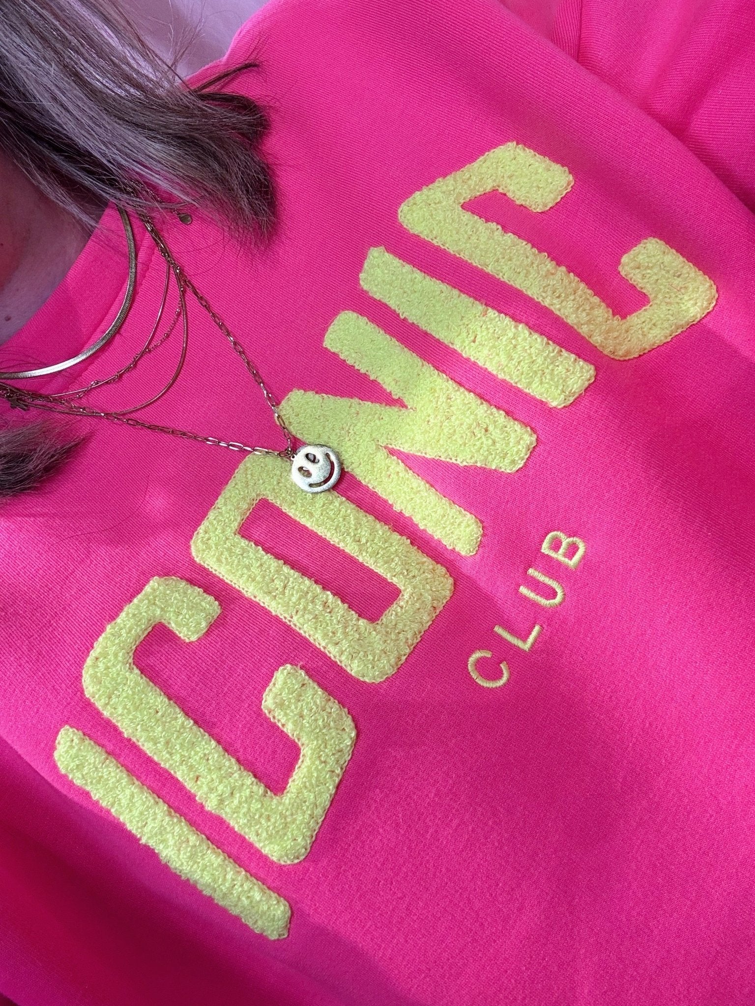 De Iconic Sweater in neon roze is een oversized trui met lange mouwen en een ronde halslijn. De trui heeft een losse pasvorm en is voorzien van een teddy opdruk op de voorkant.