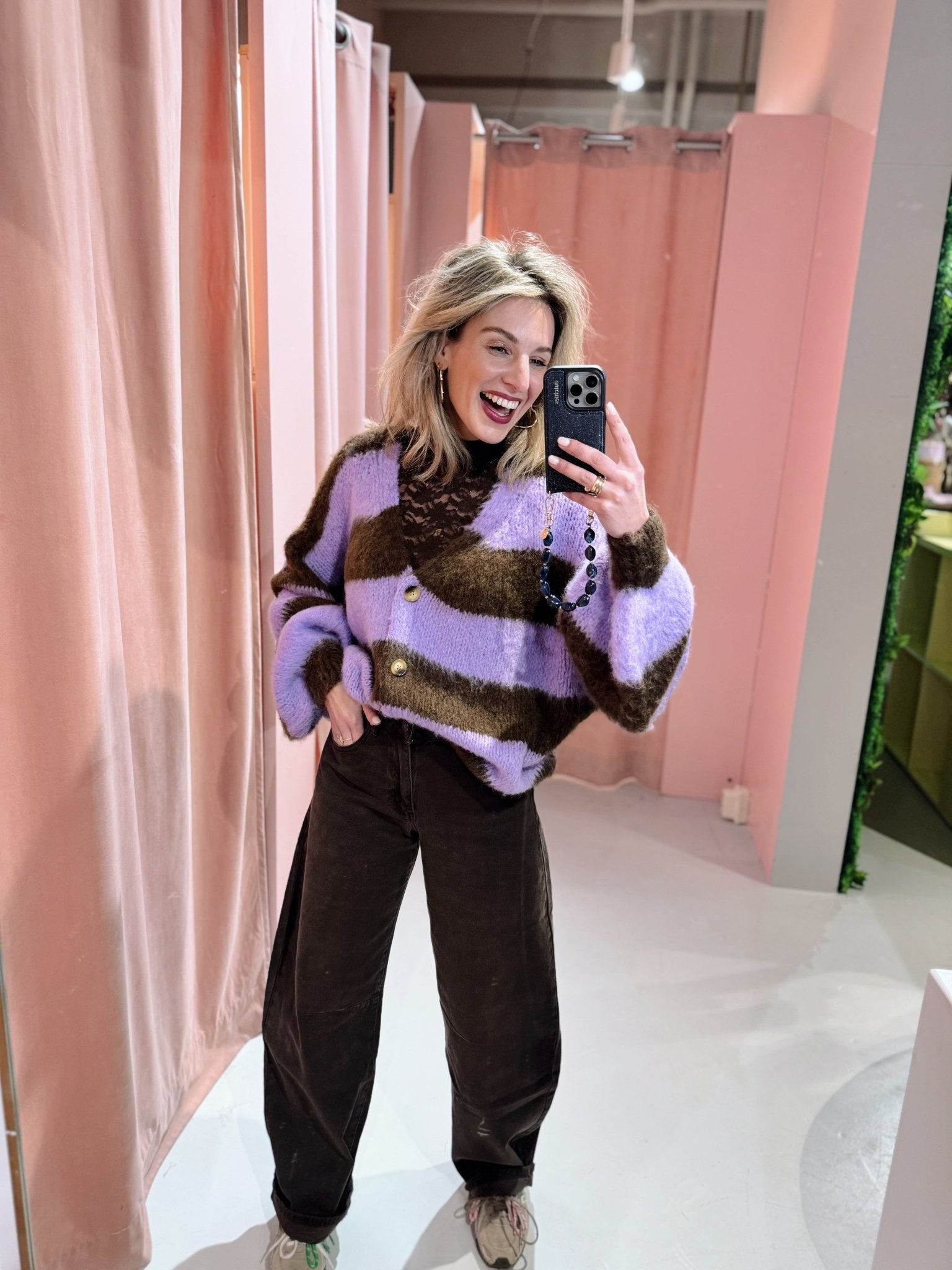 De Ilvy Cardigan in paars is een leuk 'mohair'-look vest in een toffe kleuren combi. Het vest heeft lange mouwen en een v-hals en is voorzien van een streep patroon. De cardigan is gemakkelijk te sluiten door middel van de knoopsluiting aan de voorkant.