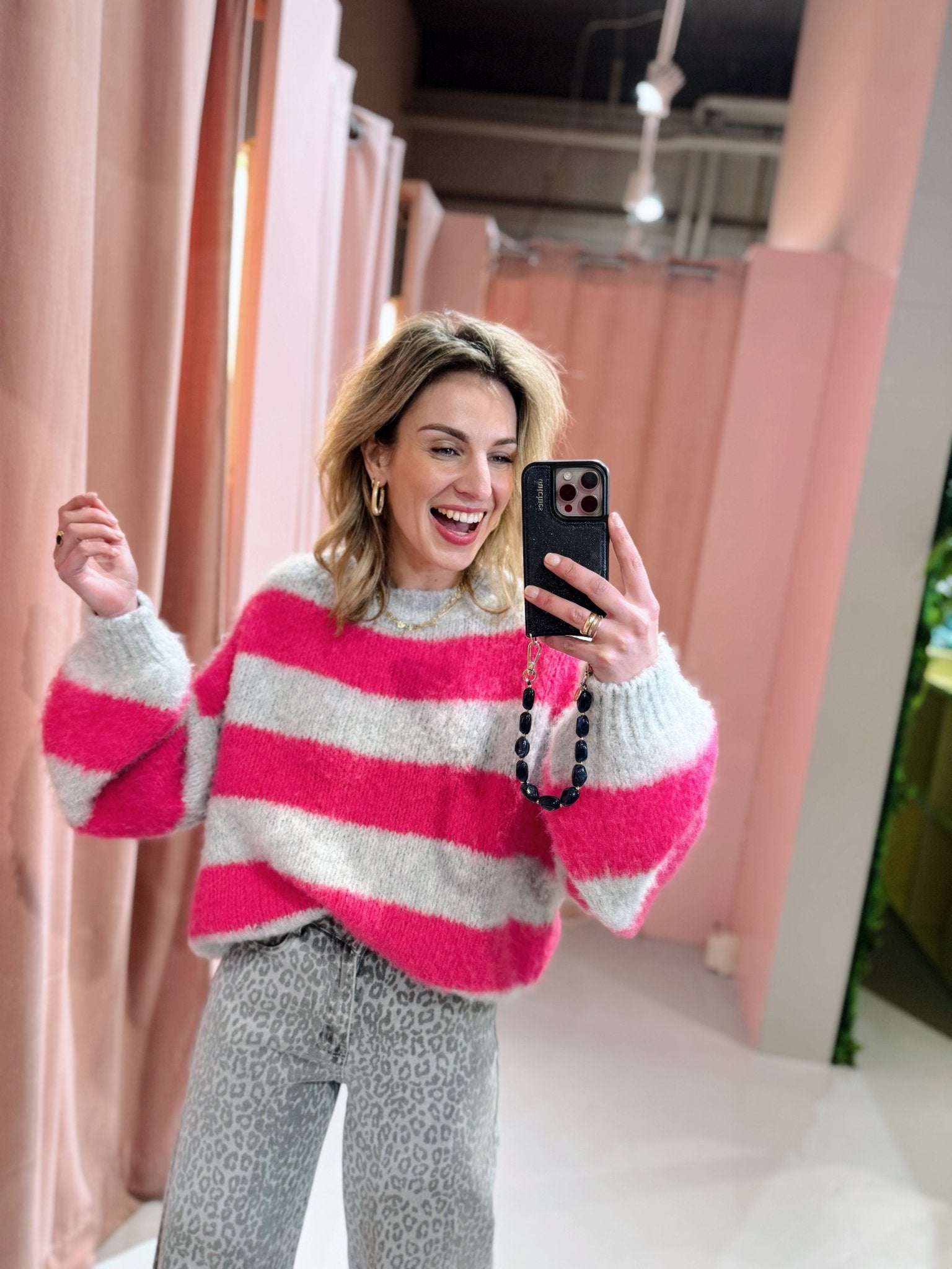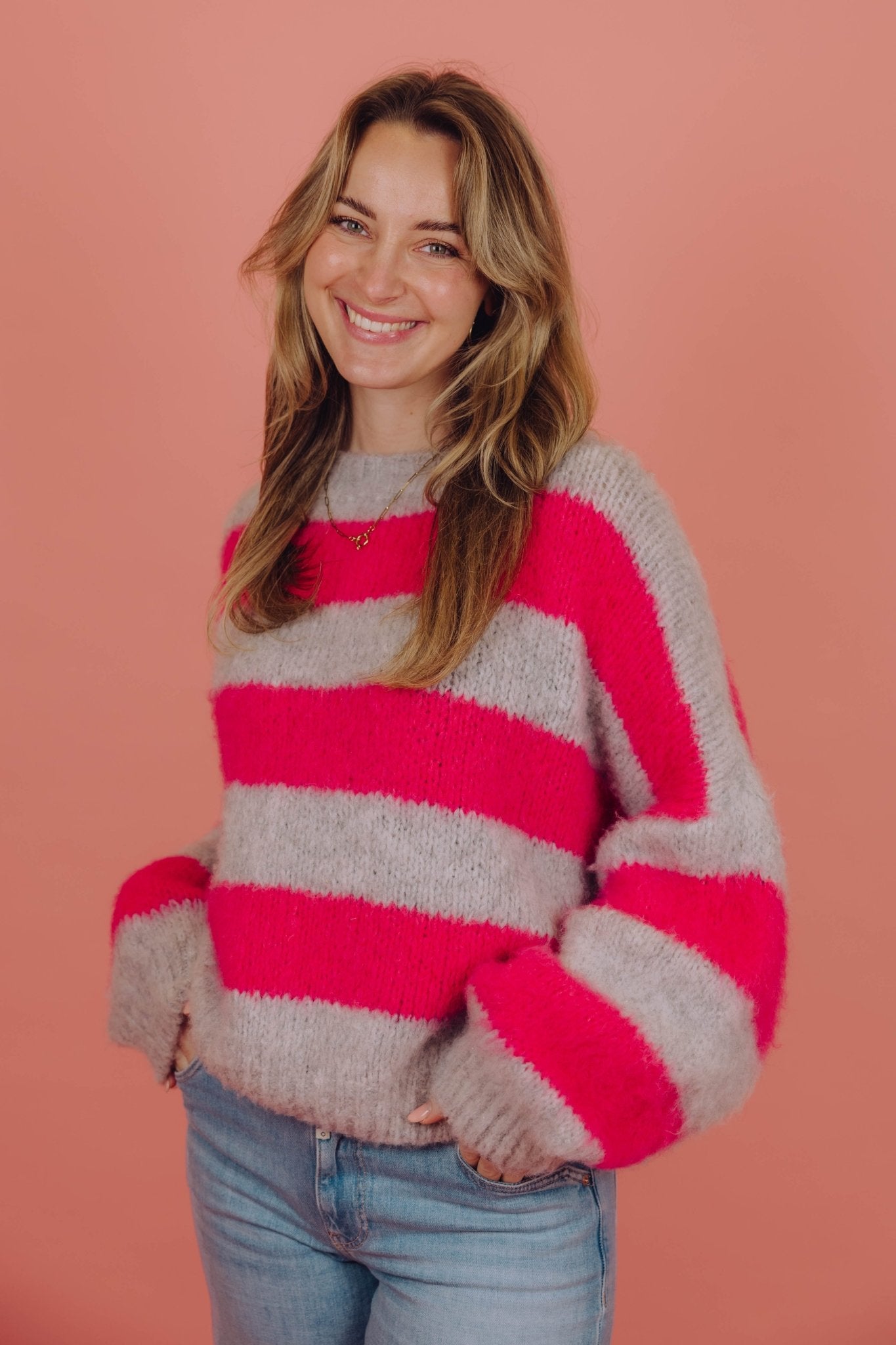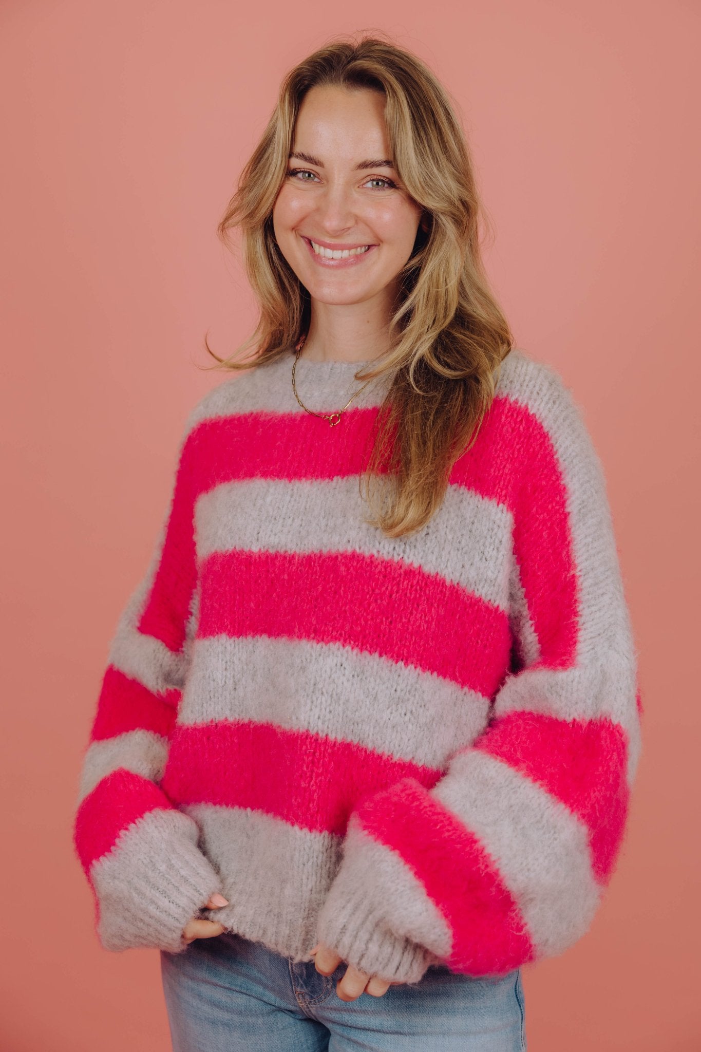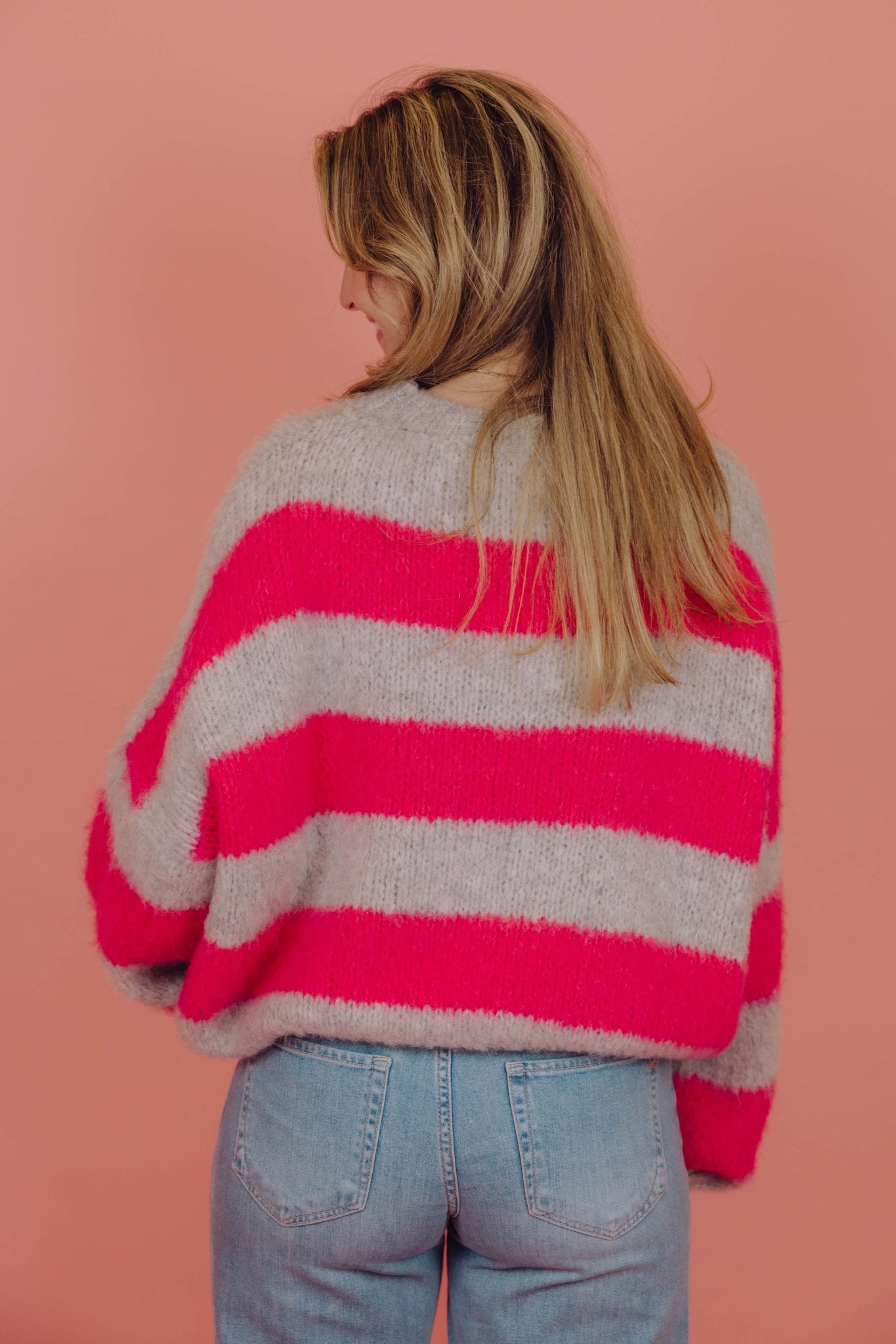 De Ilvy Knit in grijs/roze is gemaakt van een gebreid materiaal en heeft een 'mohair'-look, waardoor hij heerlijk warm is! De trui heeft een ronde halslijn en is voorzien van een streep patroon.