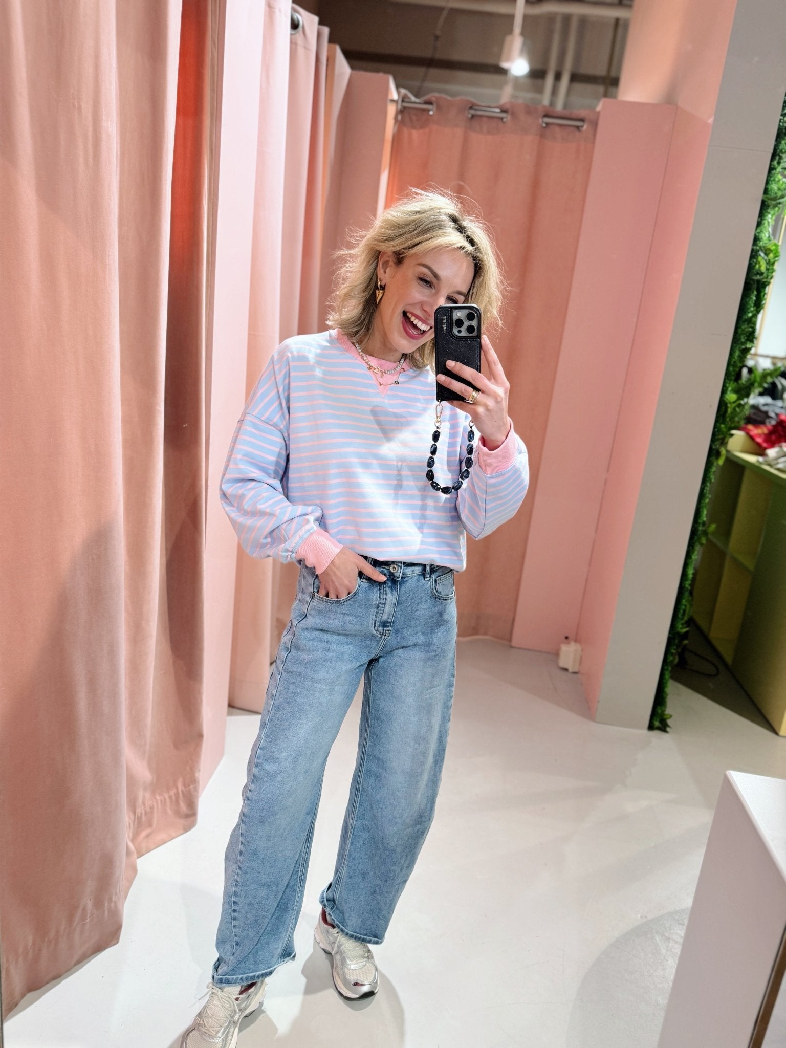 De Inez Sweater in blauw is een oversized trui met lange mouwen en een ronde halslijn. De trui heeft een losse pasvorm en is voorzien van een roze streep patroon.