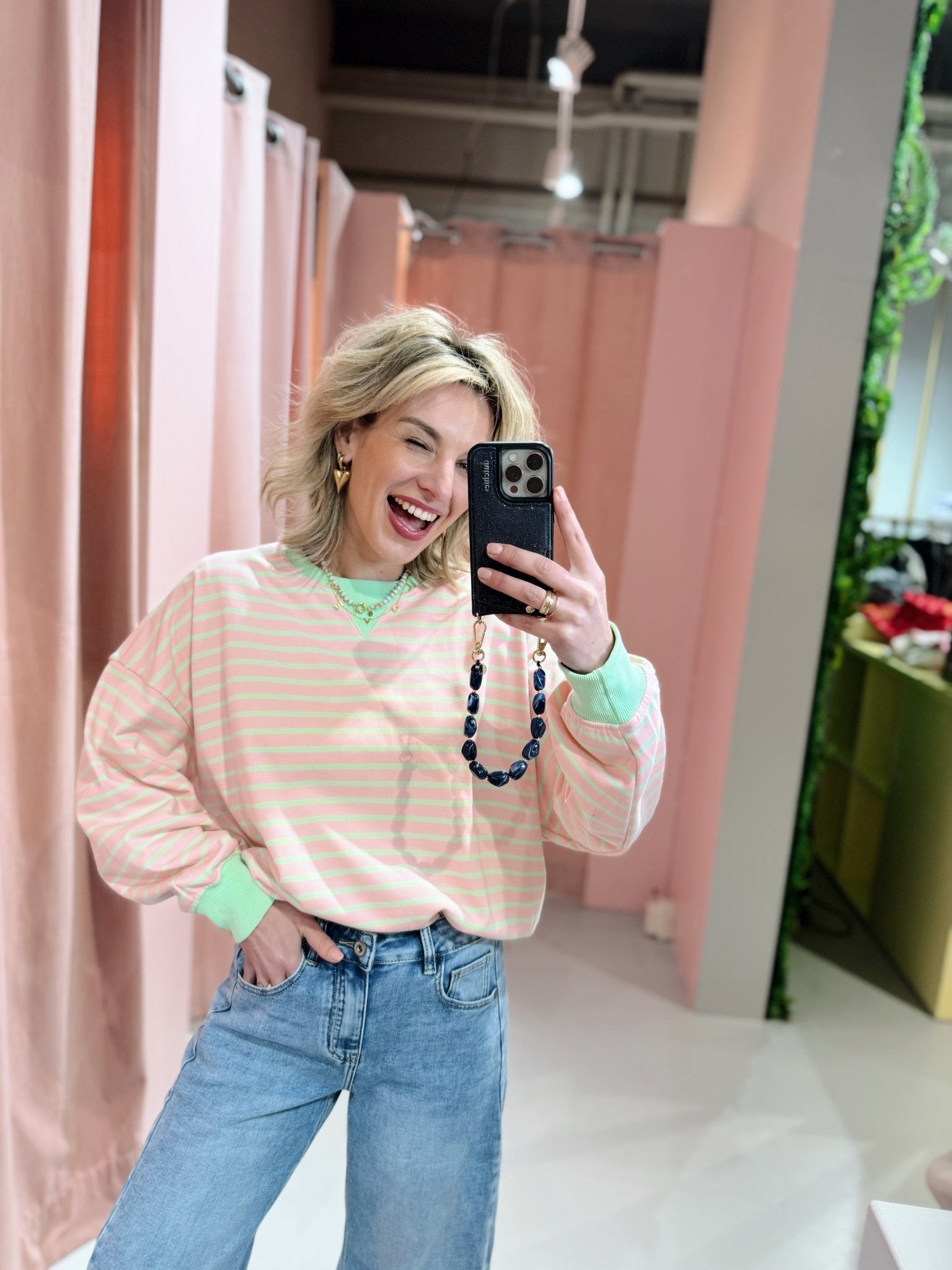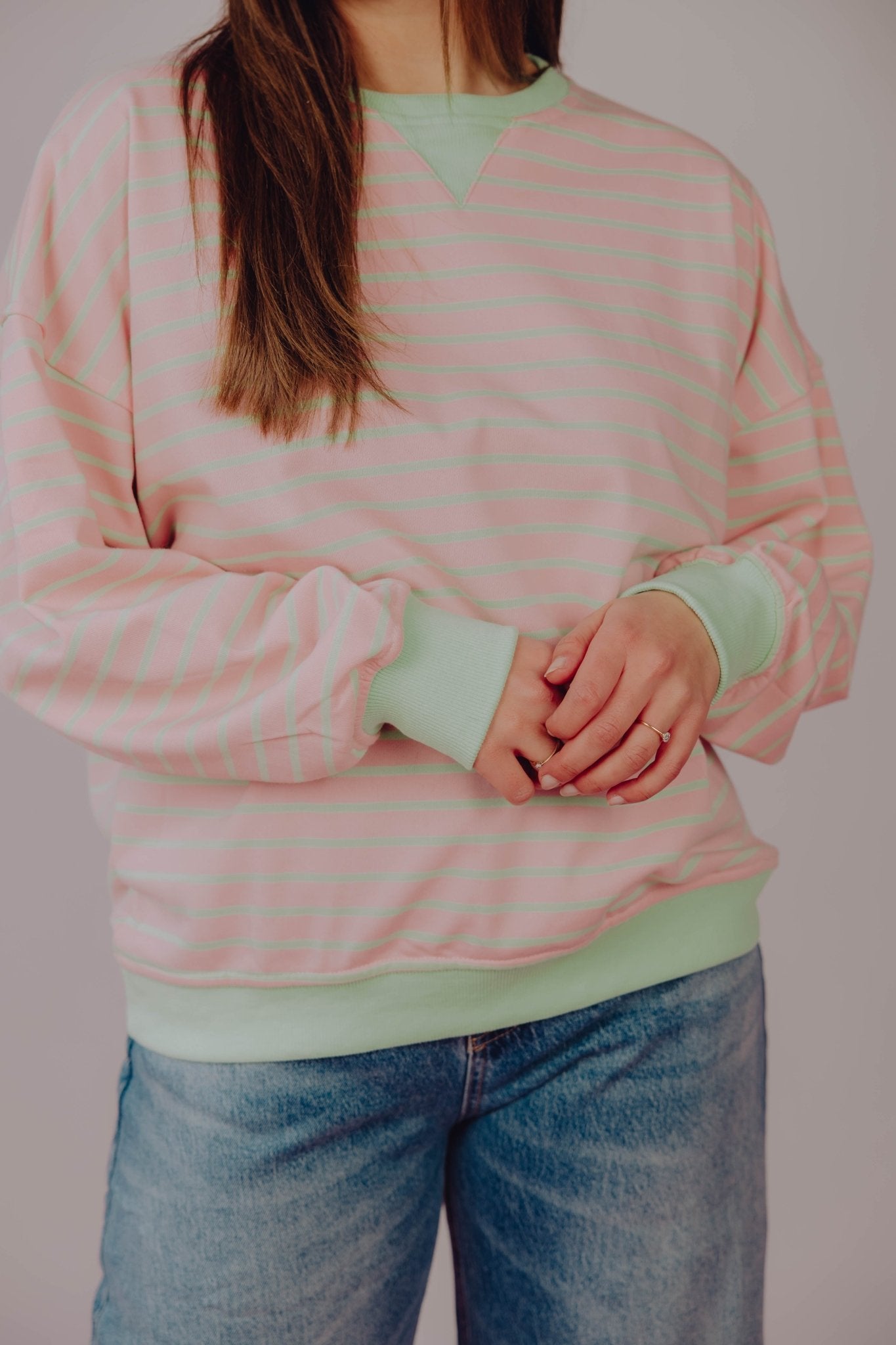 De Inez Sweater in mint is een oversized trui met lange mouwen en een ronde halslijn. De trui heeft een losse pasvorm en is voorzien van een roze streep patroon.