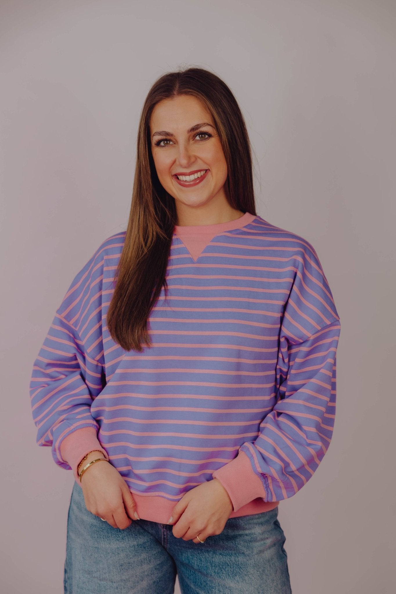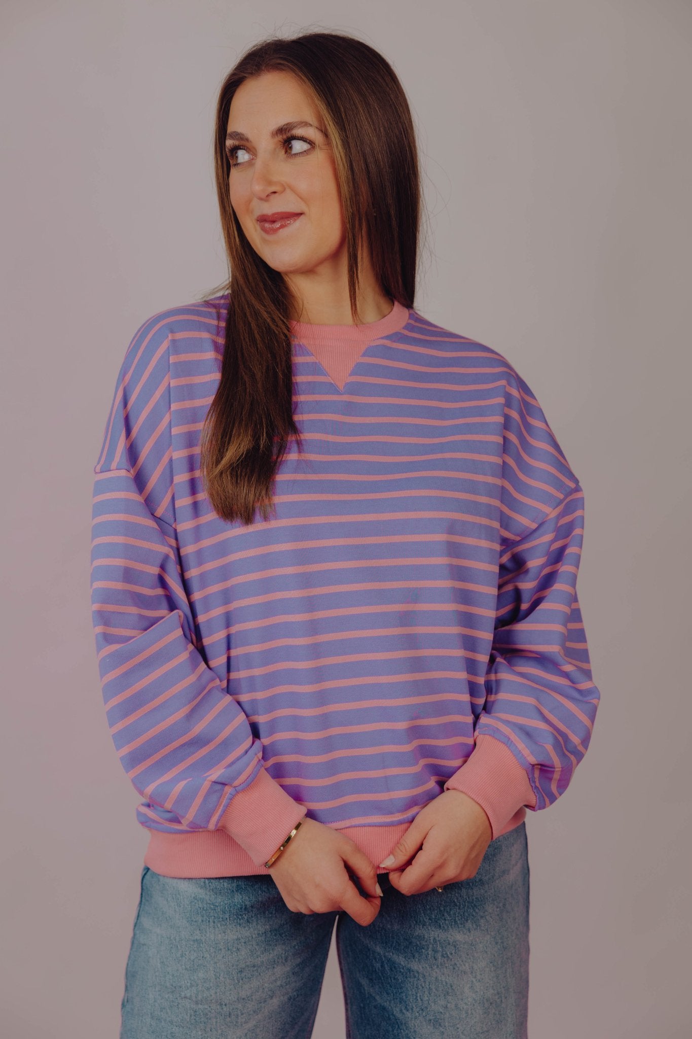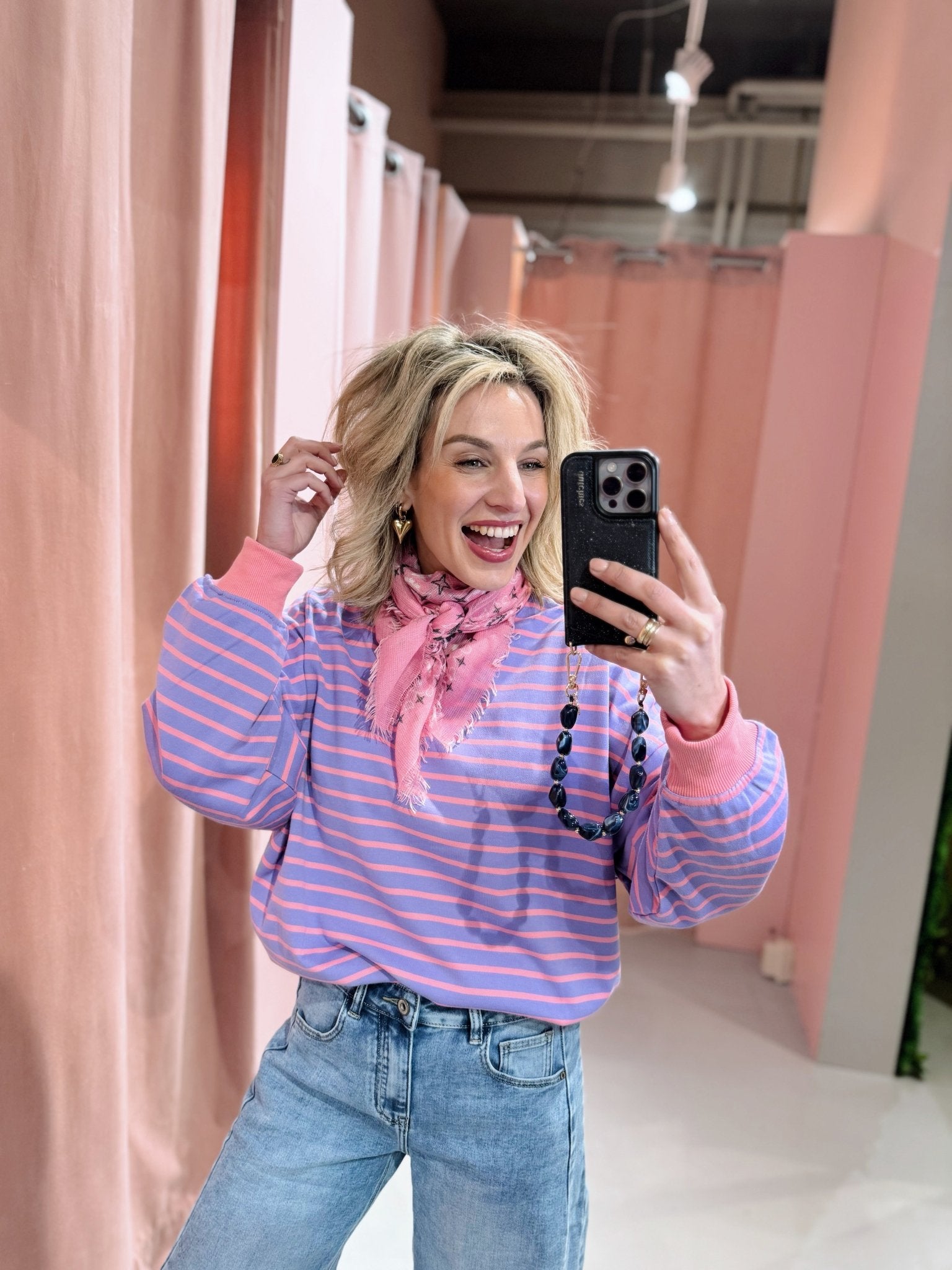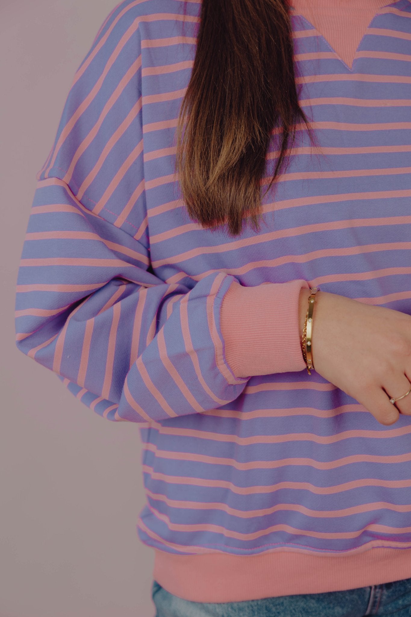 De Inez Sweater in paars is een oversized trui met lange mouwen en een ronde halslijn. De trui heeft een losse pasvorm en is voorzien van een roze streep patroon.