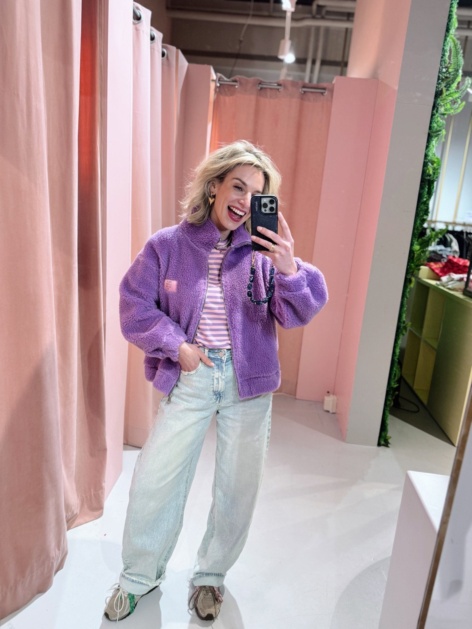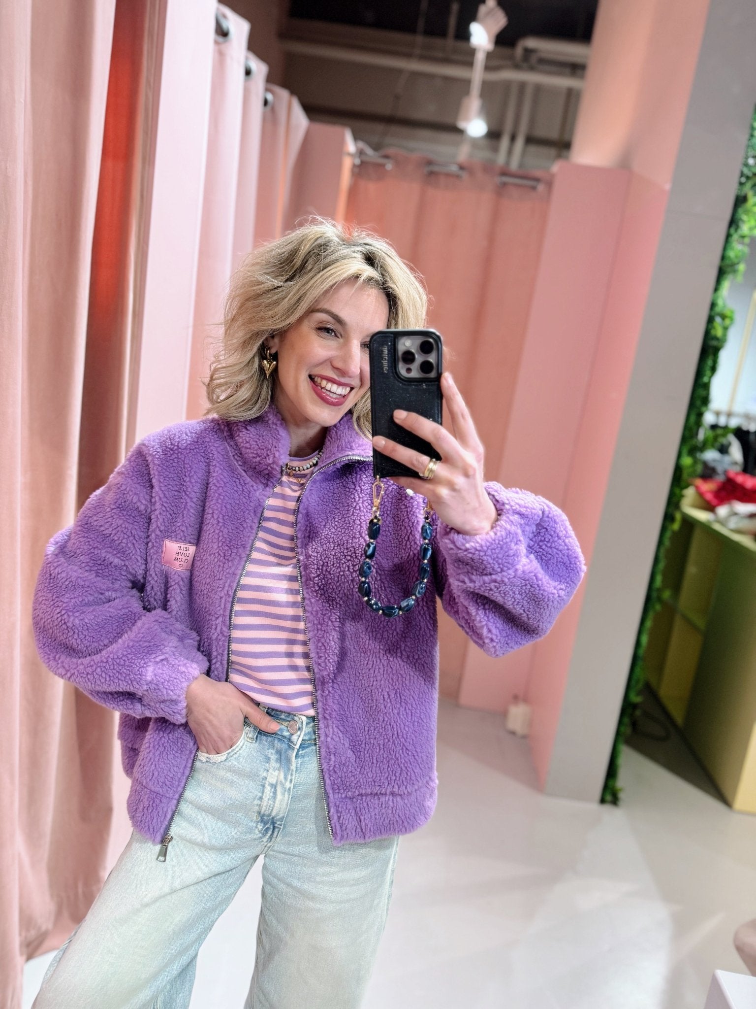 De Ivy Cardigan in lila is een oversized teddy vest met een hoge kraag. Het vest is gemaakt van een warme, zachte stof en heeft een suède-look binnenkant. De Ivy Cardigan is voorzien van een embleem links op de borst en een ritssluiting.
