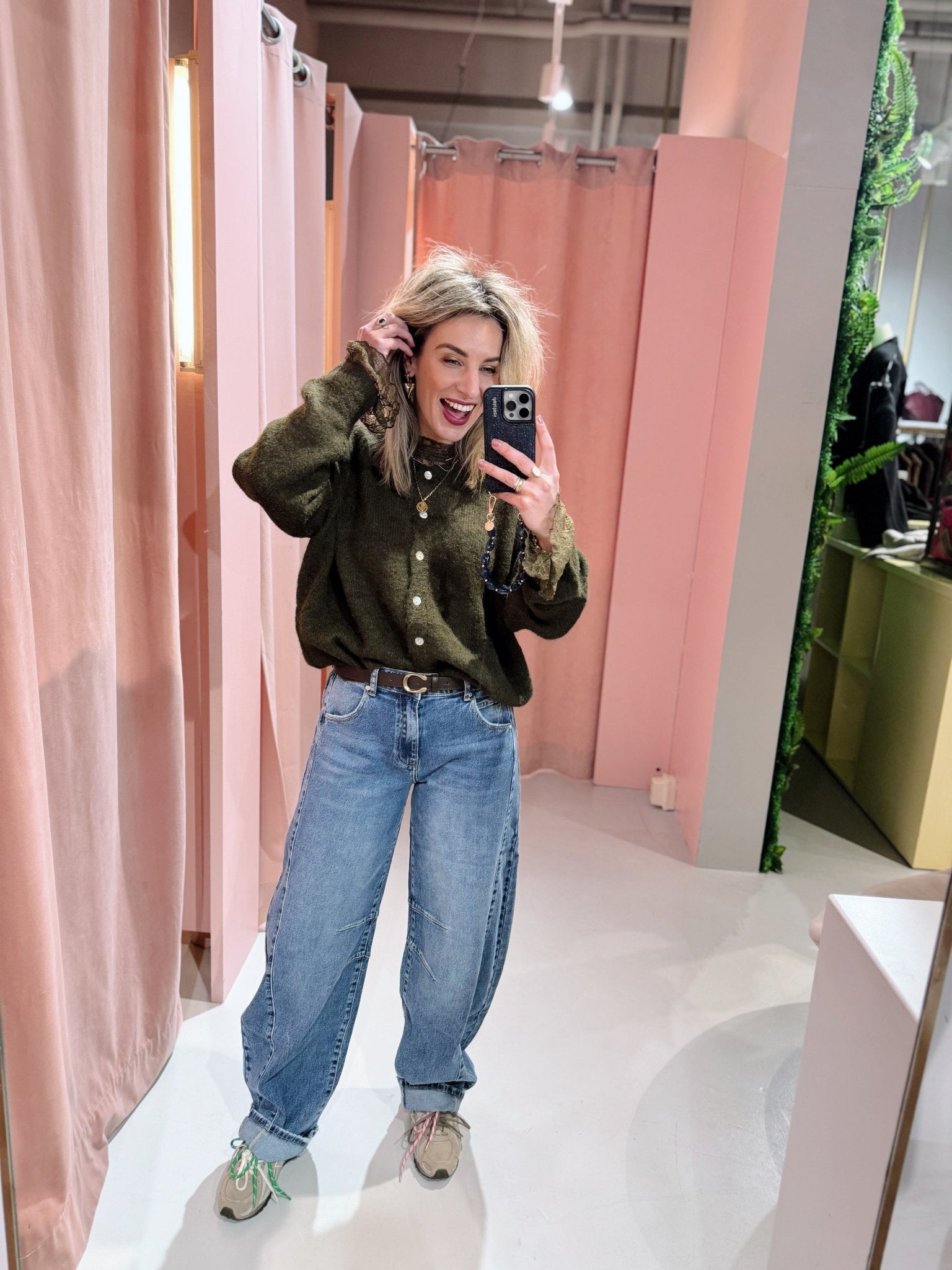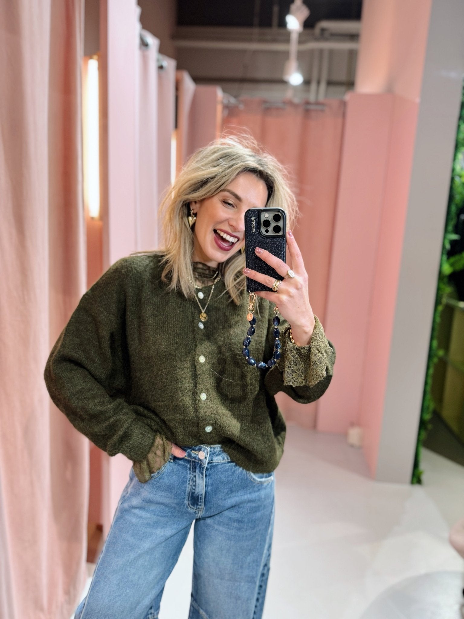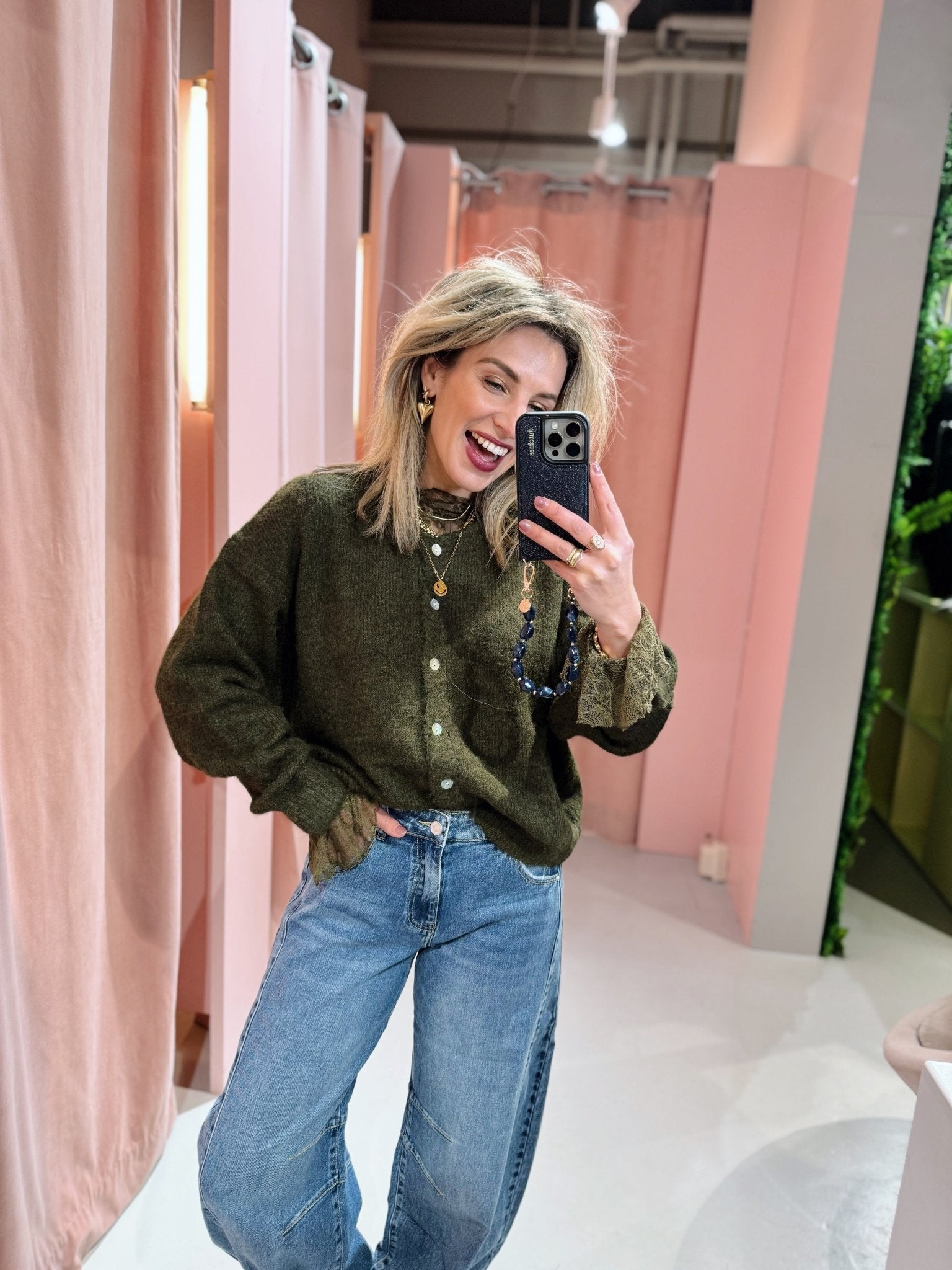 De Jace Cardigan in donkergroen heeft een boxy oversized fit en is gemaakt van een zachte, gebreide stof. Het vest heeft lange mouwen, een ronde hals en holografische knoopjes. Ideaal om te dragen in laagjes met het koude weer!