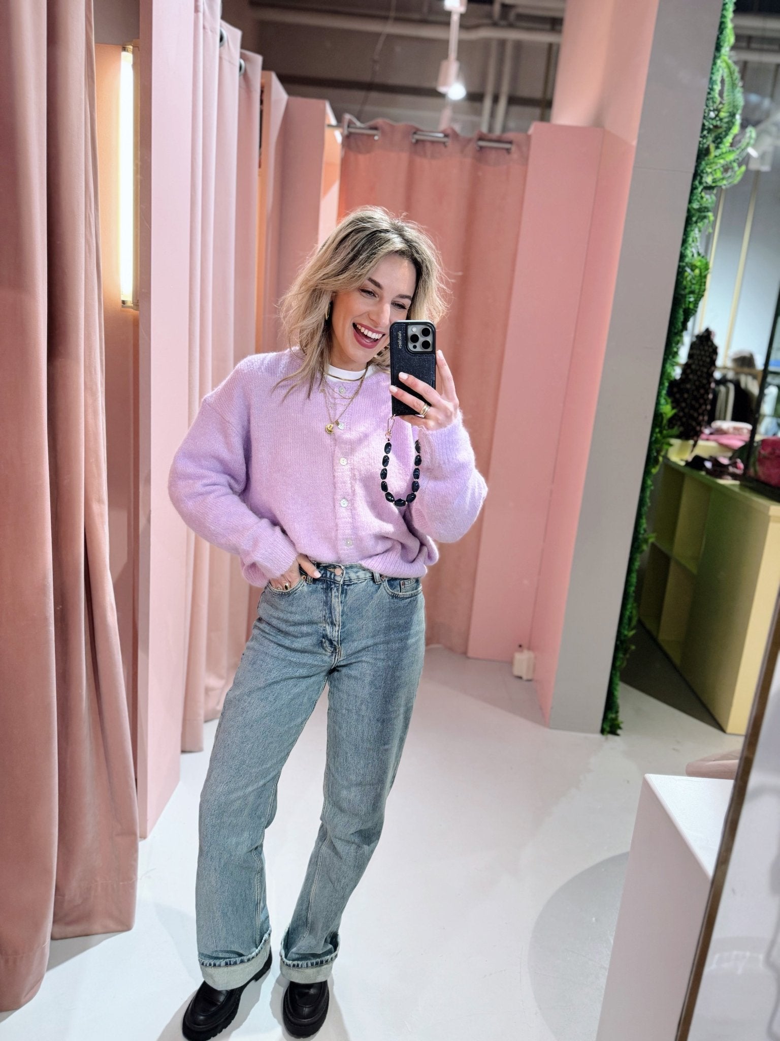 De Jace Cardigan in lila heeft een boxy oversized fit en is gemaakt van een zachte, gebreide stof. Het vest heeft lange mouwen, een ronde hals en holografische knoopjes. Ideaal om te dragen in laagjes met het koude weer!