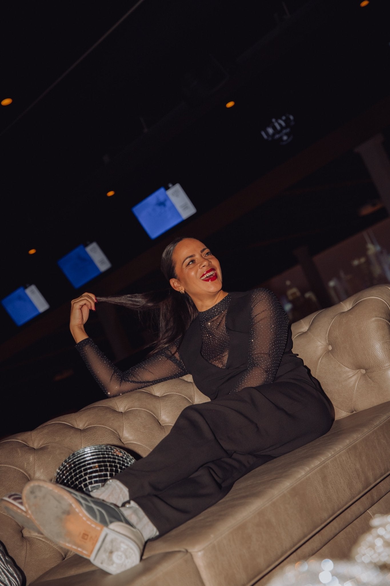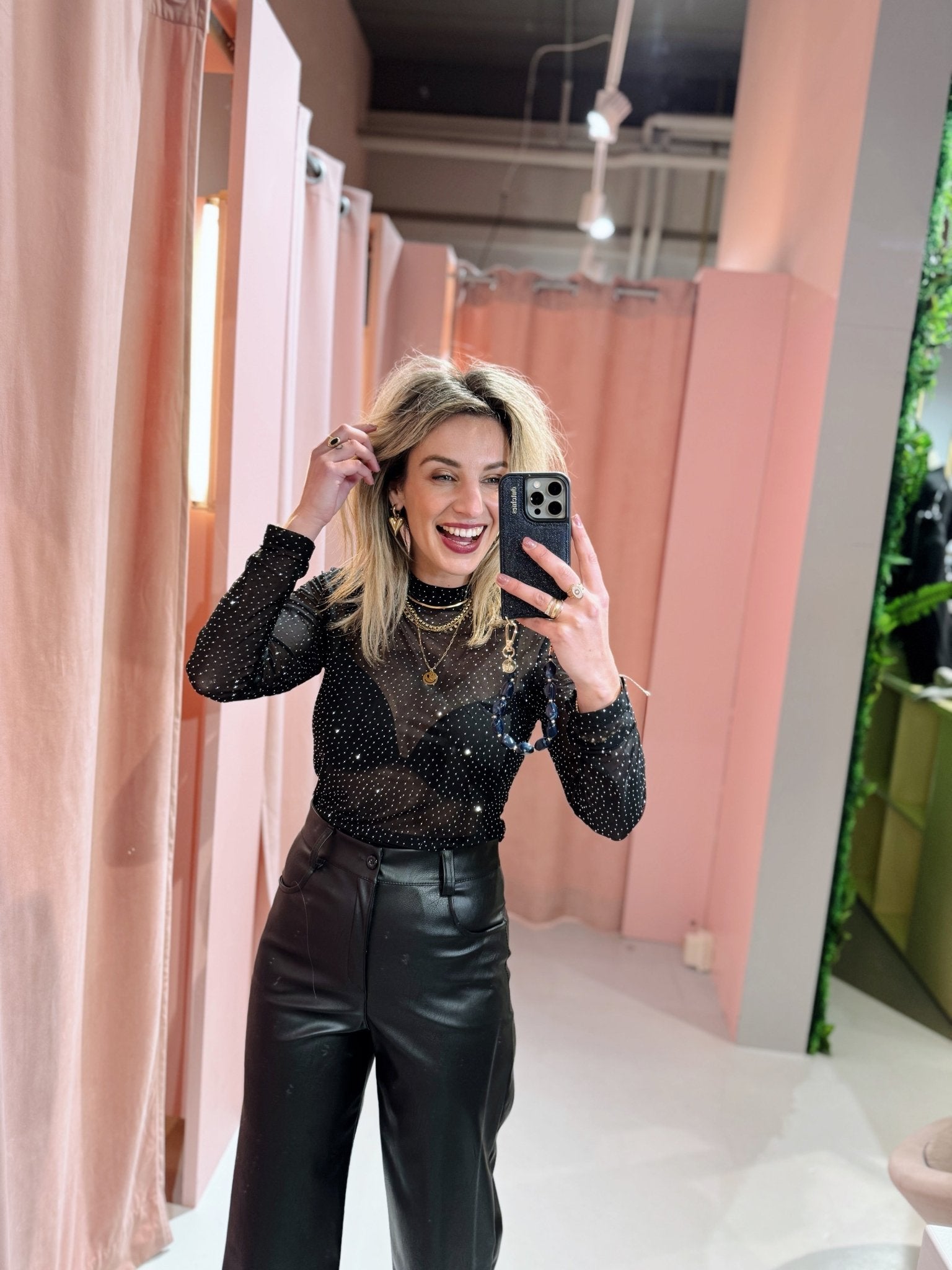 De Jada Longsleeve in zwart is een elegante mesh longsleeve bedekt in kleine strass steentjes. De top heeft een ronde halslijn en een aansluitend model en is perfect voor de feestdagen!