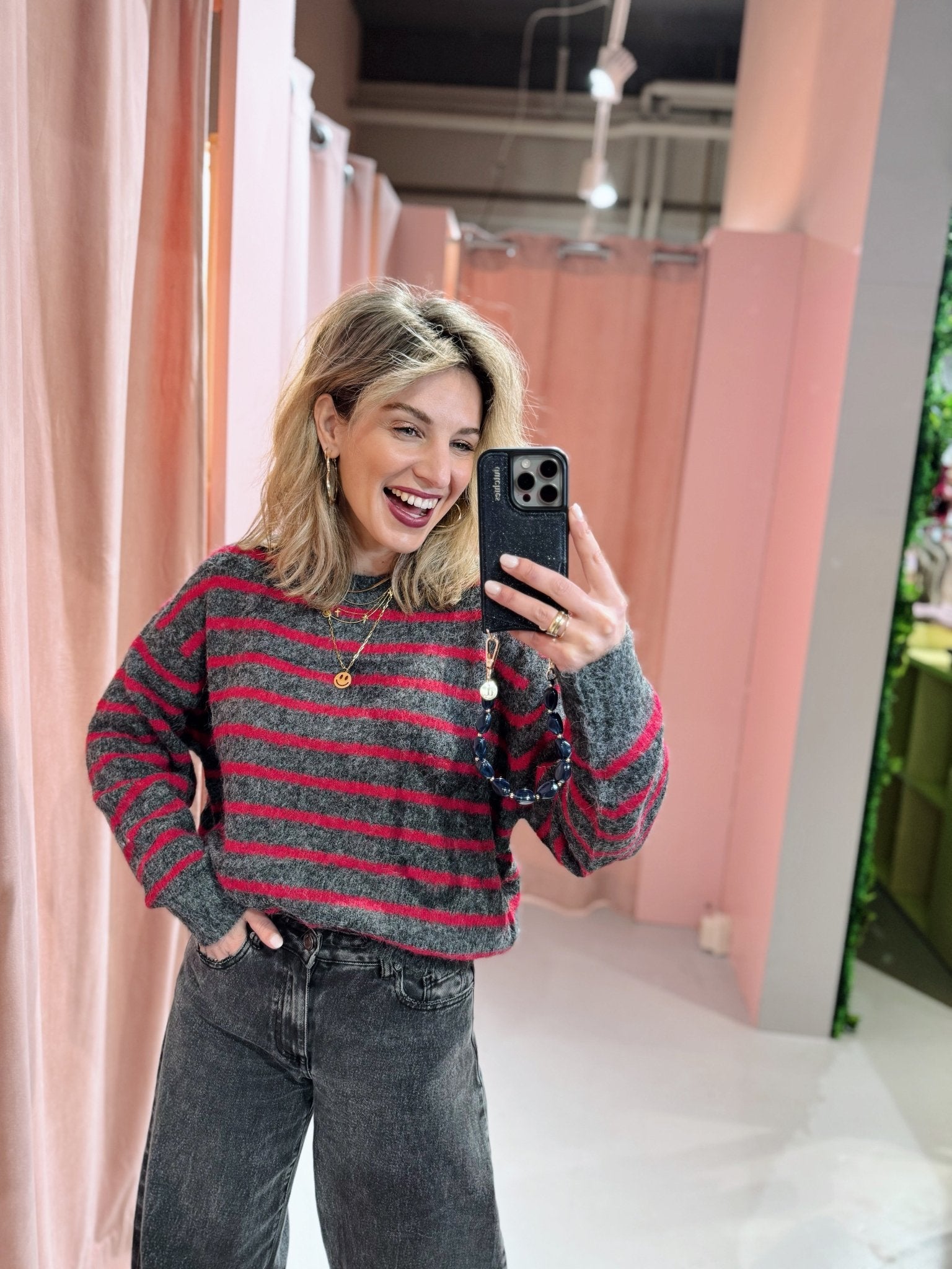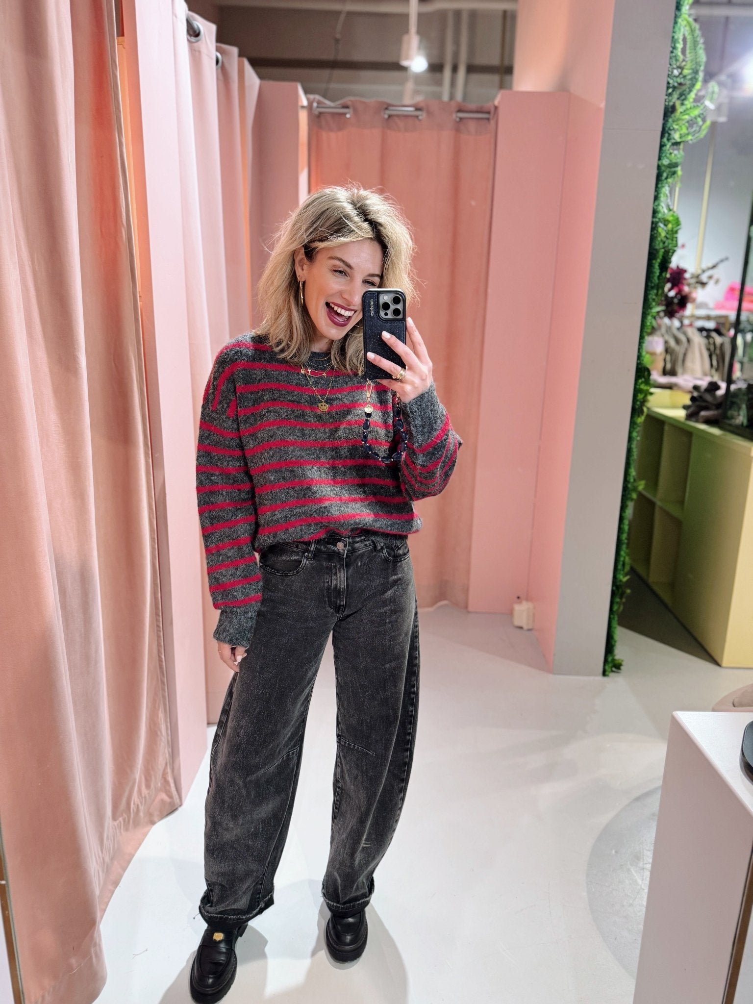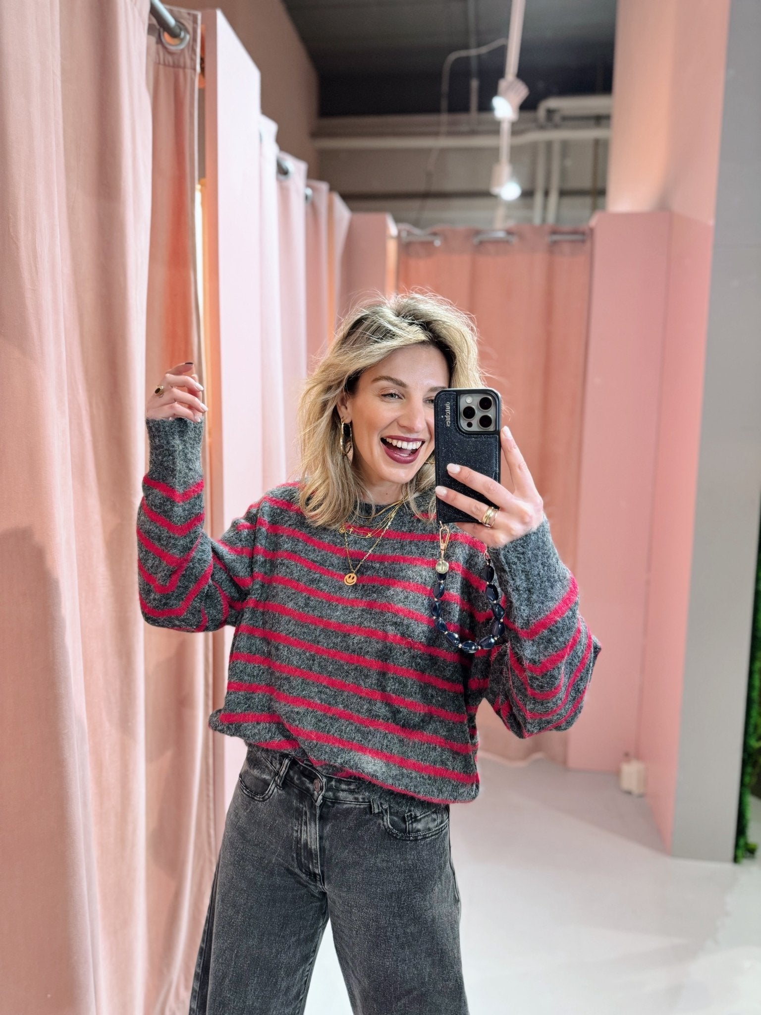 De Jane Knit in grijs is gemaakt van een gebreid materiaal, waardoor hij heerlijk warm is! De trui heeft lange mouwen, een ronde halslijn en is voorzien van een rood streep patroon.