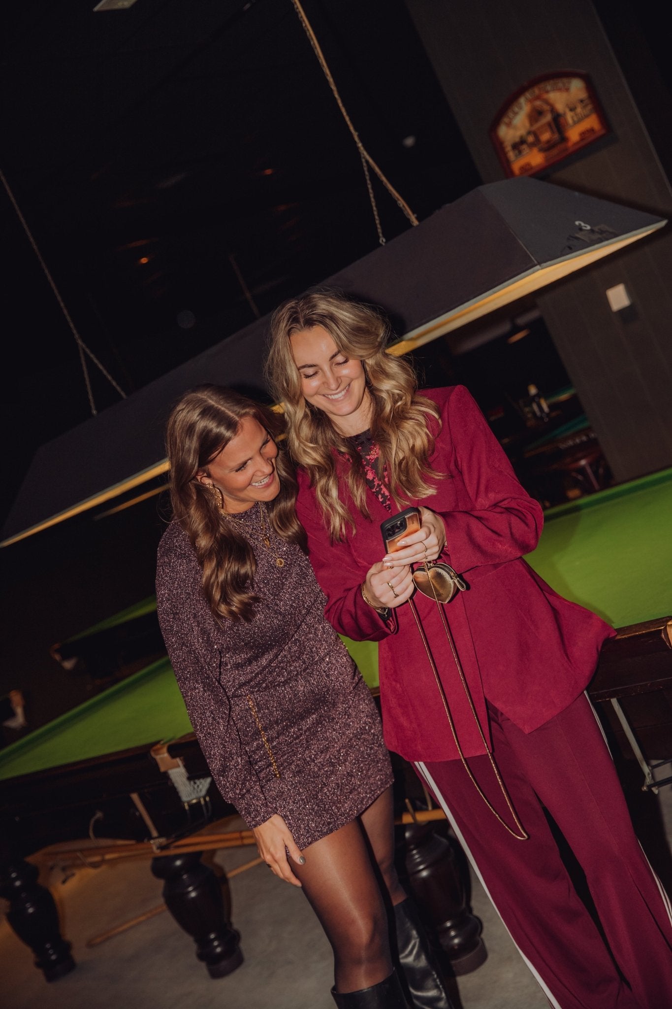 De Jasmijn Dress in roze is een elegante mesh jurk bedekt in kleine strass steentjes. De jurk heeft een ronde halslijn en een wijd model en is perfect voor de feestdagen!