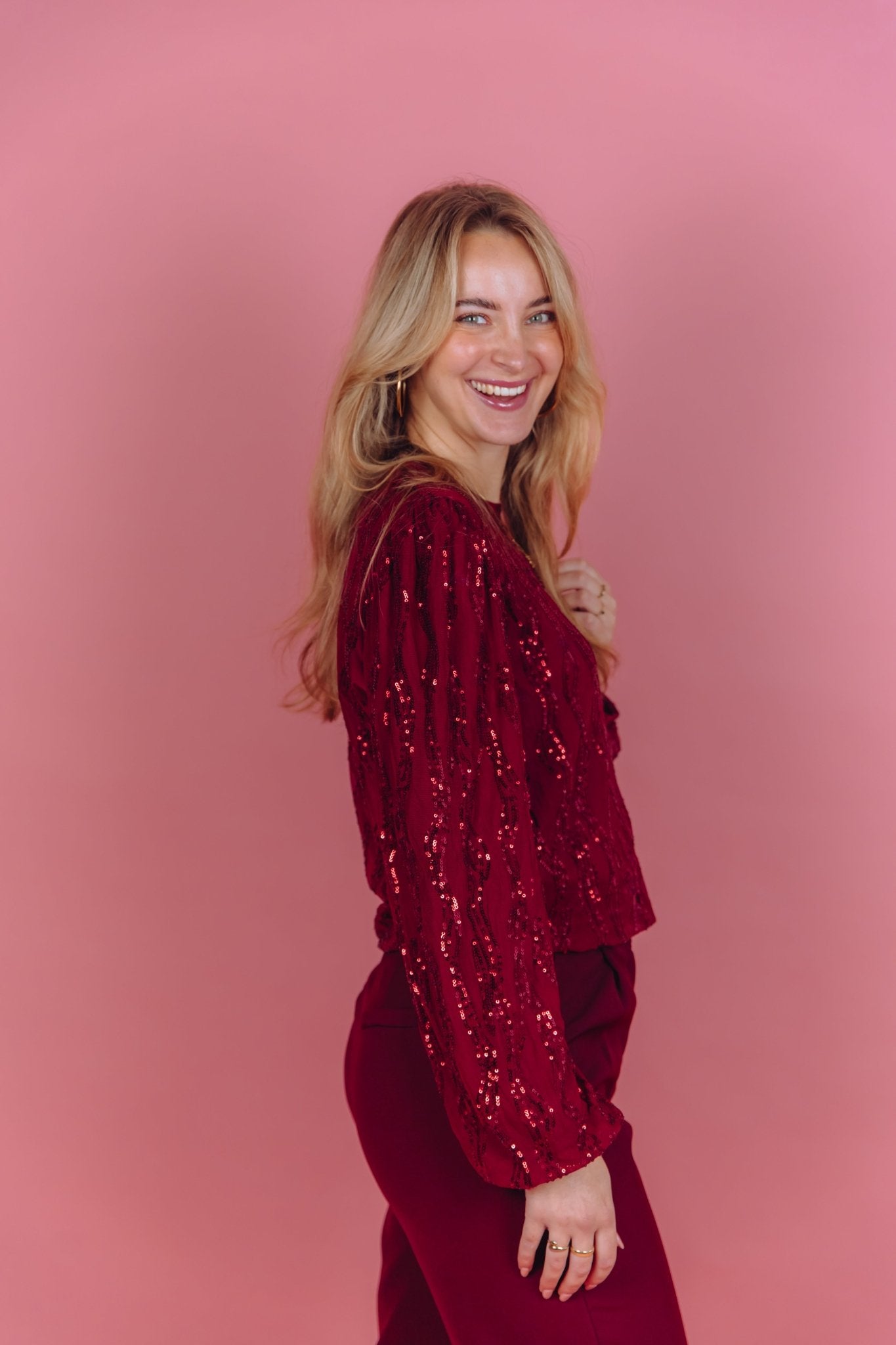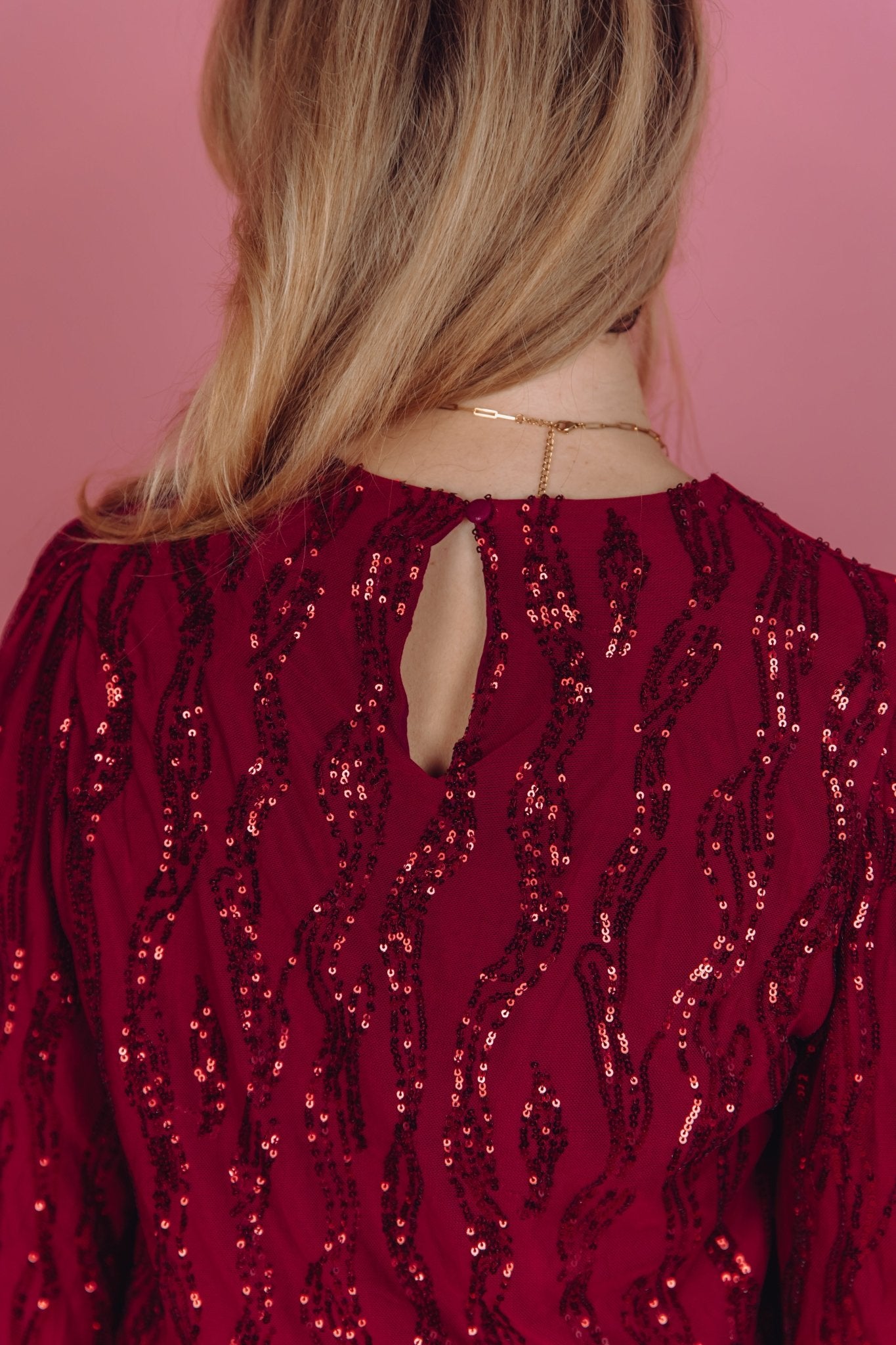 De Jayce Blouse in bordeaux is een feestelijke blouse gemaakt van een luchtige stof. De blouse heeft lange pofmouwen en een ronde halslijn en is gemakkelijk te sluiten door middel van de knoopsluiting in de nek. Doordat dit blousje voorzien is van pailletten, is hij perfect voor de feestdagen!