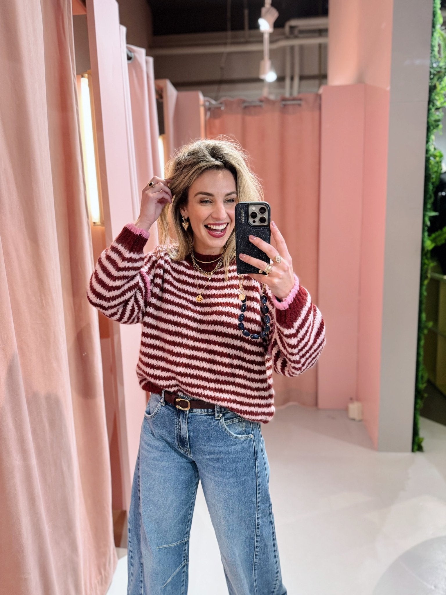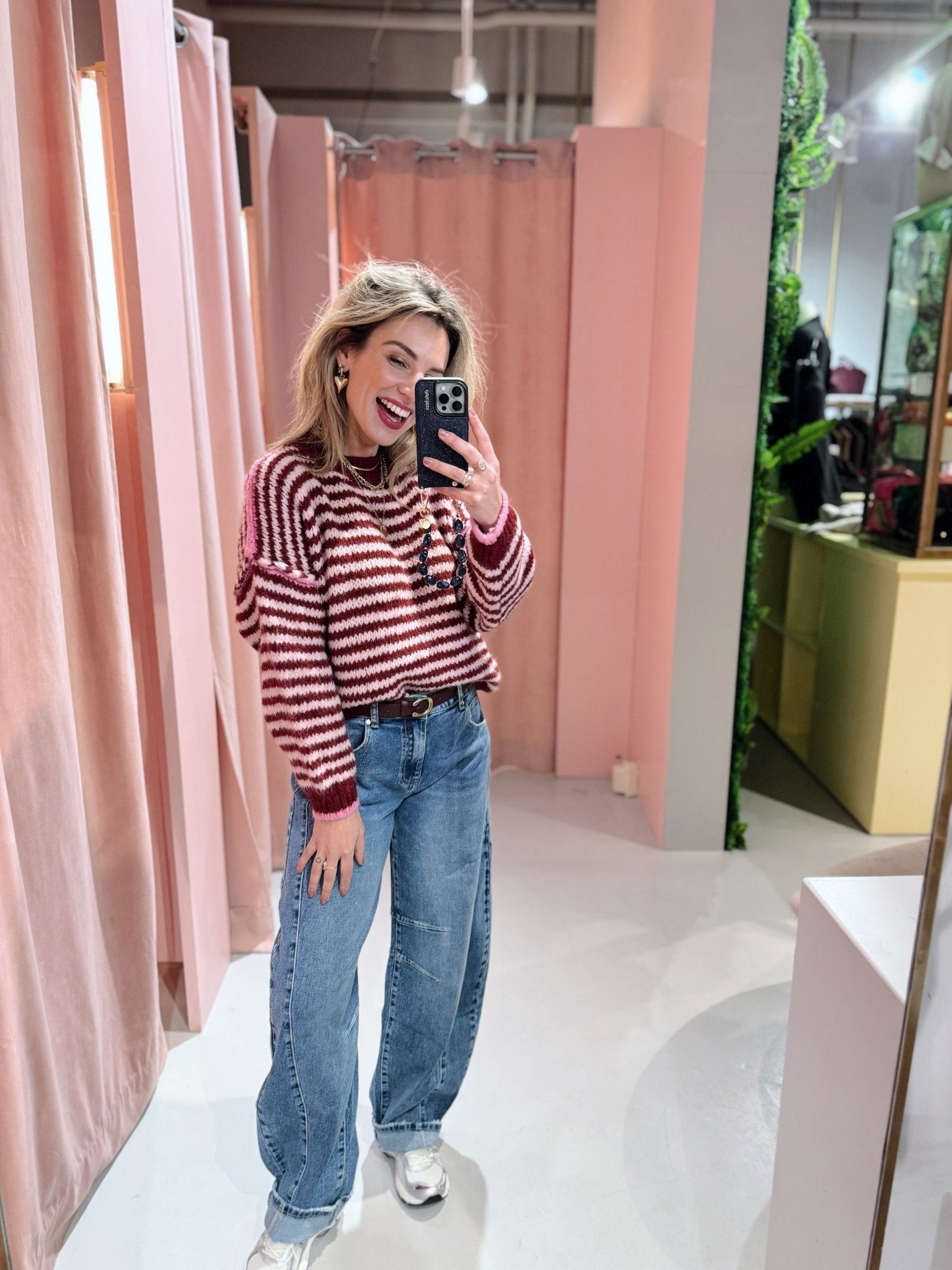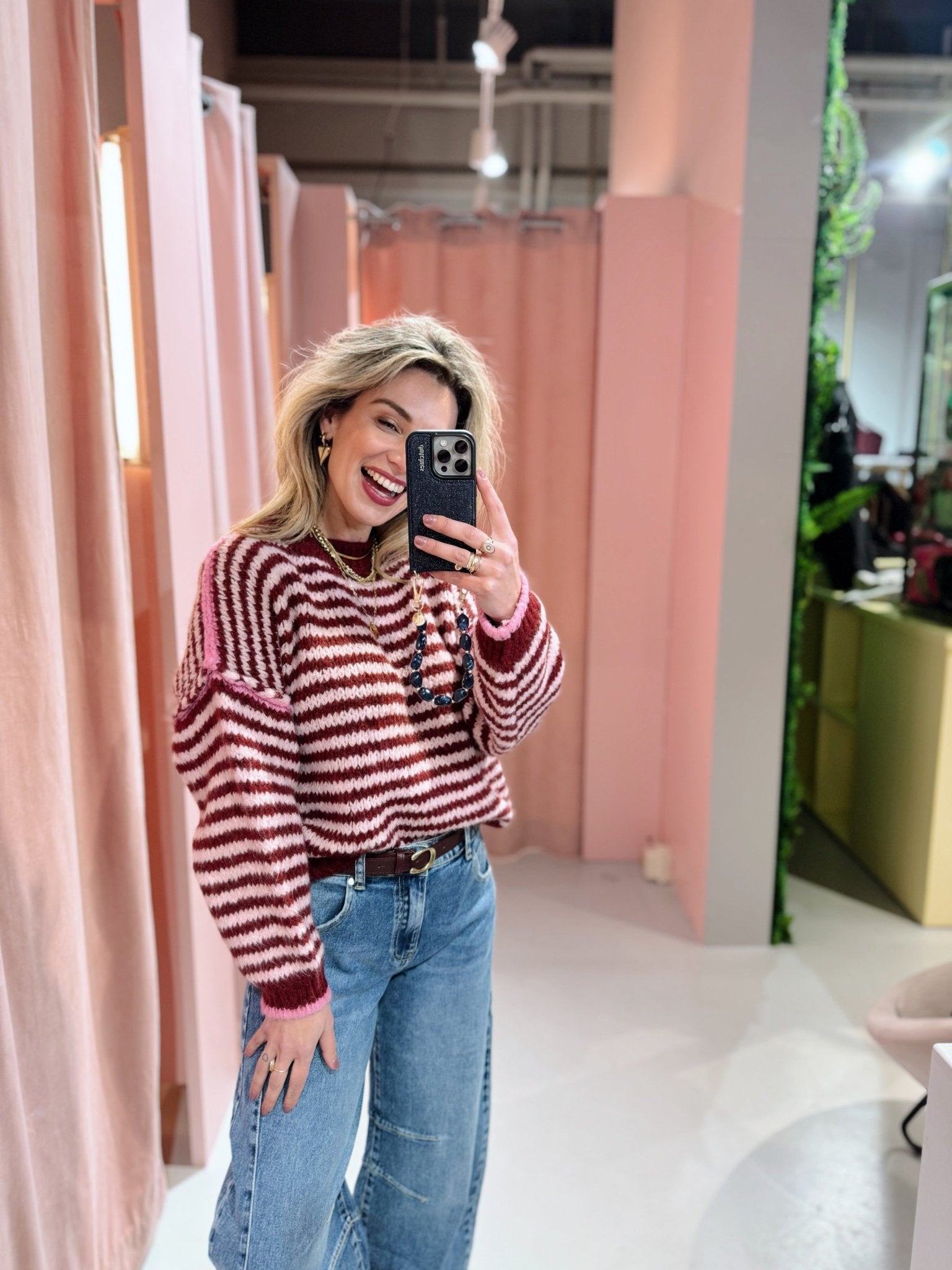 De Jelka Knit in bordeaux is gemaakt van een gebreid materiaal, waardoor hij heerlijk warm is! De trui heeft lange mouwen, een ronde halslijn en is voorzien van een streep patroon. Extra leuk is de gekleurde bies die op de schoudernaden en bij de manchetten zit.